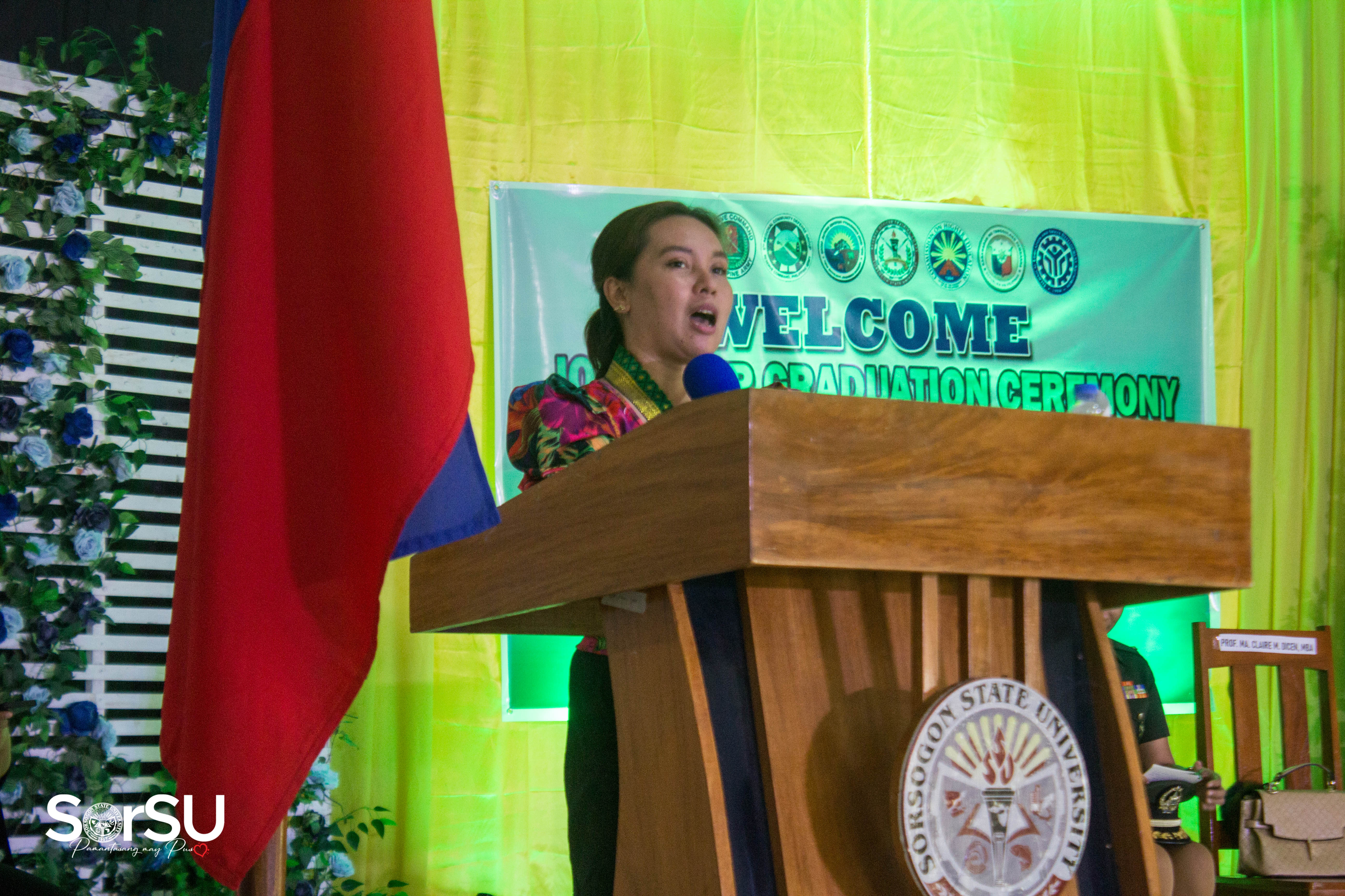 In a message delivered by Prof. Ma. Claire M. Dicen, NSTP Director and keynote speaker for the activity, she inspired the 672 Civil Welfare Training Service (CWTS) and 125 ROTC students to value the knowledge they have gained in their NSTP journey, she said, “As the NSTP program aims to develop in you civic consciousness and defense preparedness, we assure that the values of love for our country and your dedication to serve others will be your moral compass. Your values make you humane, let us all say ‘Makatao ako at may values kaya mahalaga ako sa pamilya ko, sa komunidad, sa SorSU, sa Sorsogon, sa lipunan ng Republika ng Pilipinas’, dahil sa NSTP mahalaga ang kalinangan ng values.”