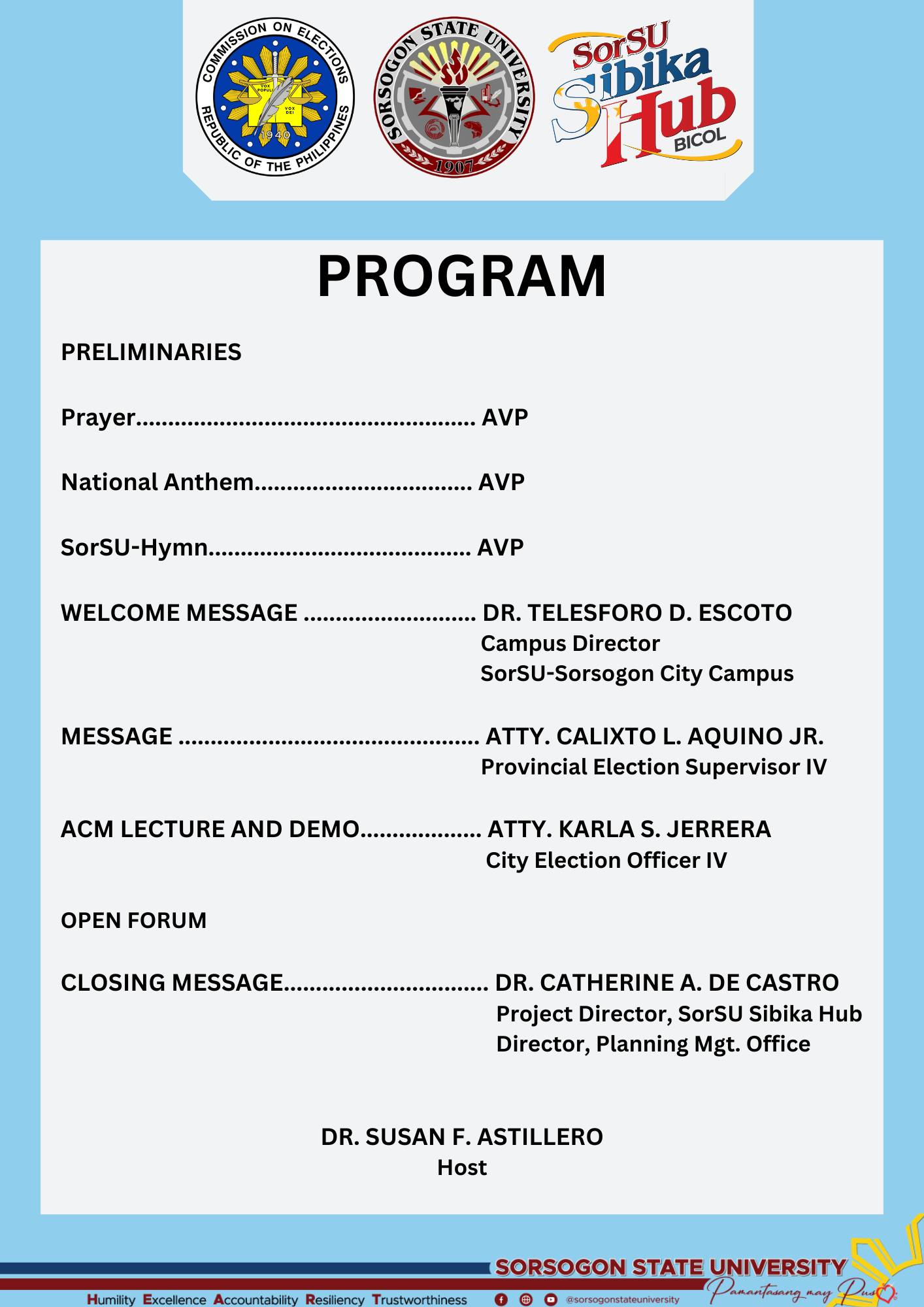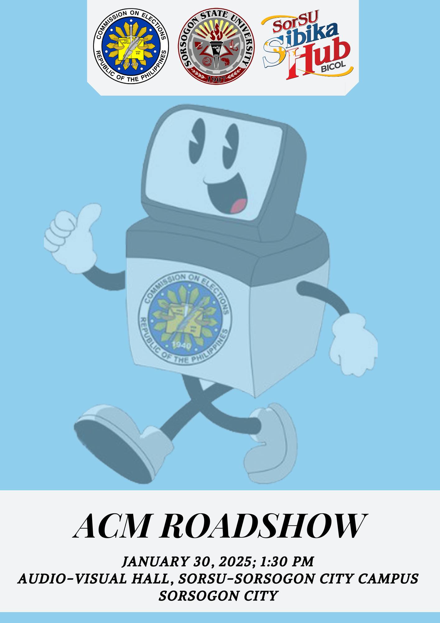 The Commission on Elections (COMELEC), in partnership with SorSU Sibika Hub, invites you to the Automated Counting Machine (ACM) Roadshow on January 30, 2025, 1:30 PM at the Audio-Visual Hall, SorSU-Sorsogon City Campus.