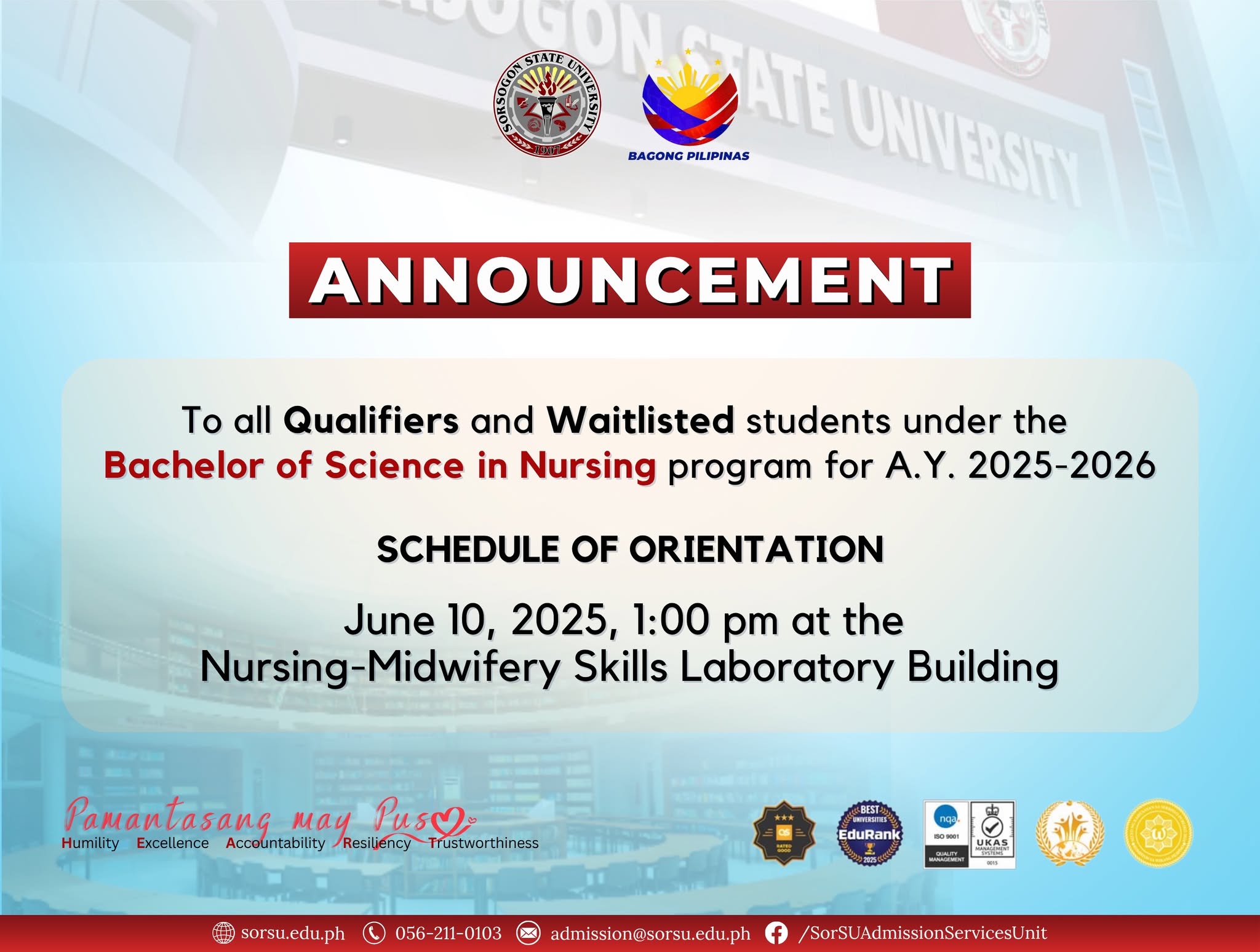 You are required to attend an ORIENTATION with your parent or guardian on June 10, 2025, 1:00PM at the Nusing-Midwifery Skills Laboratory. Attendance to the orientation is a must. If you fail to attend the said orientation, it will mean waiving of your slot.