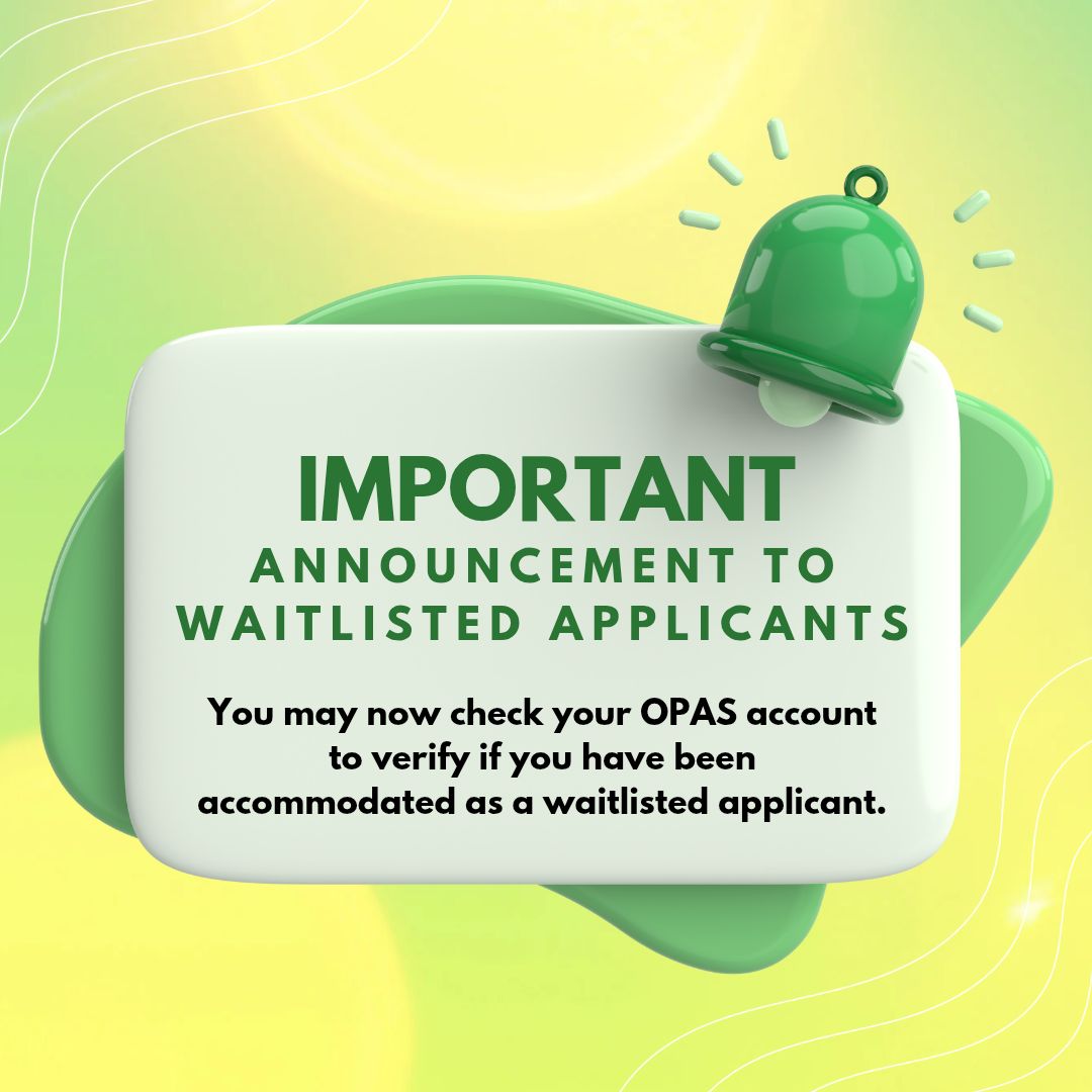 You may now check your OPAS account to verify if you have been accommodated as a waitlisted applicant. Accommodation was based on slot availability following the submission of qualifiers, in accordance with ranking or rating.