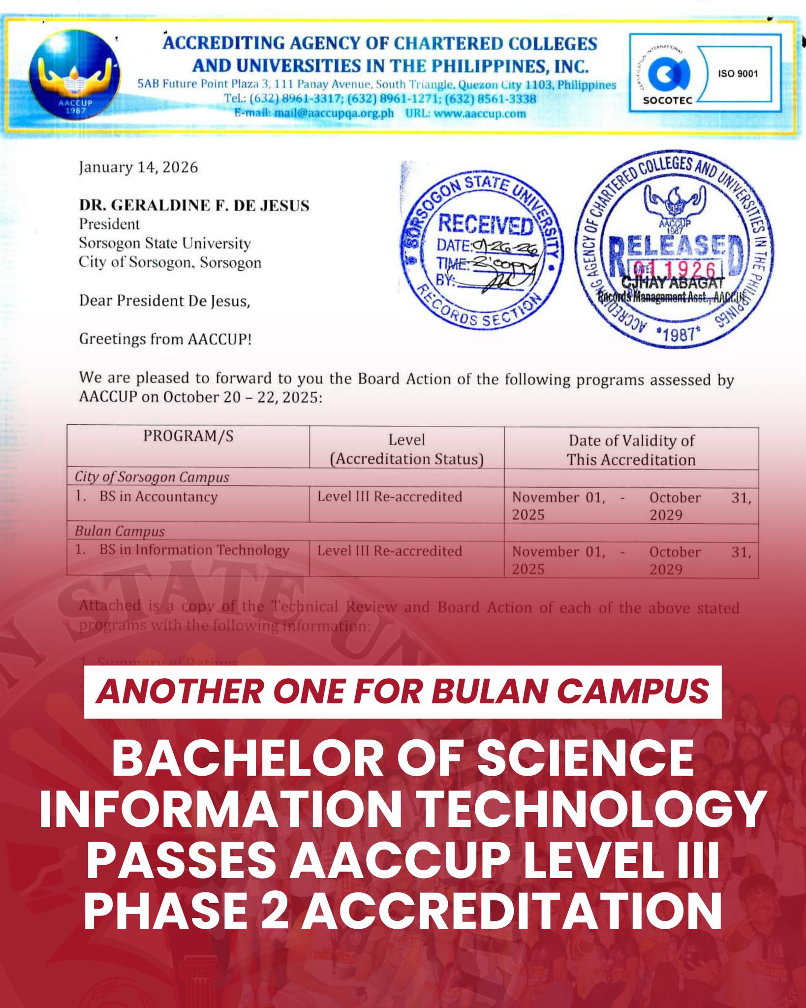 Sorsogon State University – Bulan Campus proudly announces the success of the Bachelor of Science in Information Technology (BSIT) in the AACCUP Level III Phase 2 Accreditation, following the accreditation assessment conducted last October 20–22, 2025.