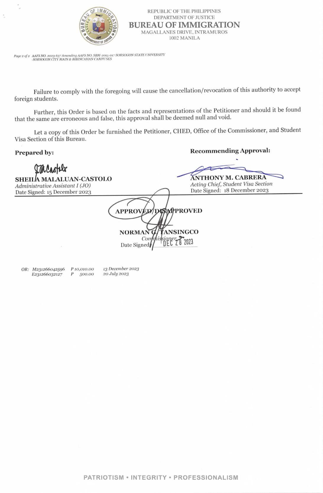 In a groundbreaking development, Sorsogon State University has achieved another notable milestone by being officially granted by the Bureau of Immigration, with AAFS No. 2023-637, the authority to accept foreign students for the following academic programs: