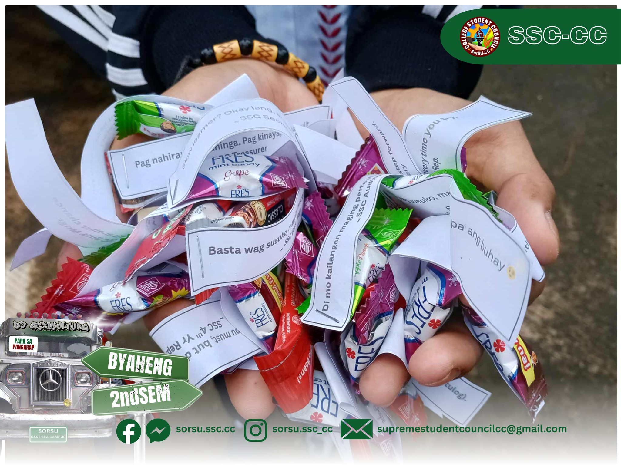 The Supreme Student Council (SSC) conducted a simple yet meaningful initiative by giving small treats paired with motivational messages to students as a warm welcome to the Second Semester. This activity aimed to uplift students’ spirits, boost their motivation, and remind them that despite the challenges ahead, they are supported, valued, and capable of moving forward. Through this heartfelt gesture, the SSC hopes to inspire positivity, perseverance, and confidence as students begin another semester of learning and growth.