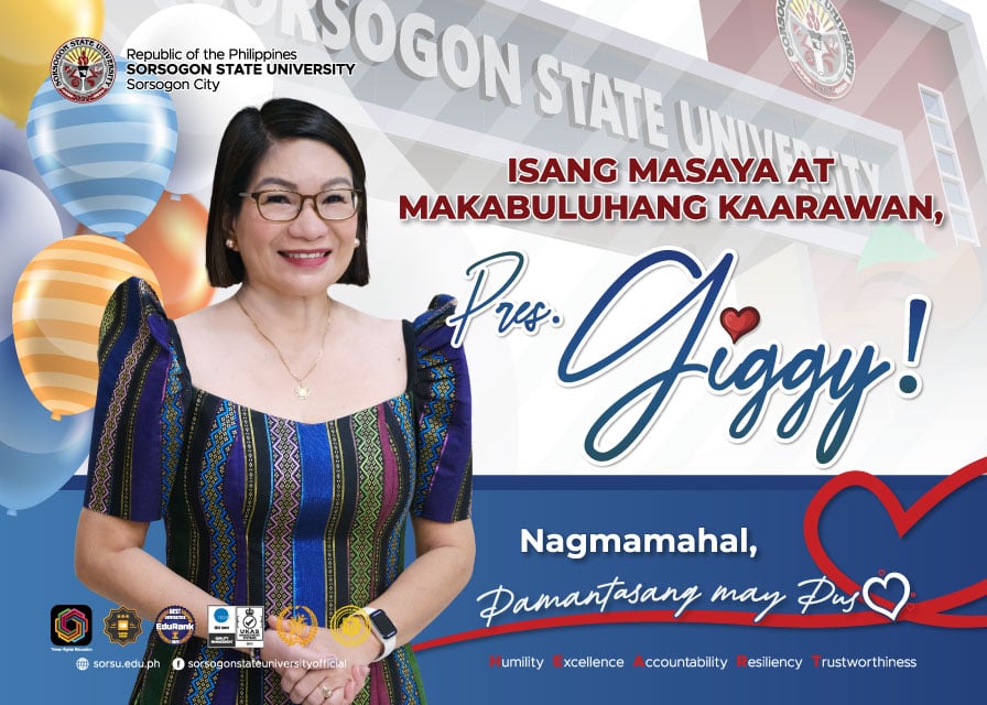The Sorsogon State University community joyfully celebrates the birthday of our University President, Dr. Geraldine F. De Jesus, SUC President III, a leader whose vision, compassion, and steadfast commitment continue to inspire a Pamantasang tunay na may puso.