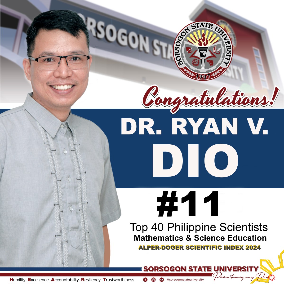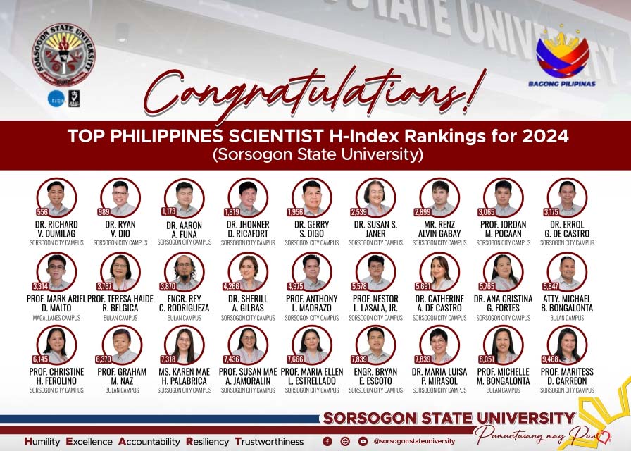 The Sorsogon State University proudly congratulates Dr. Ryan V. Dio and Dr. Aaron A. Funa for their remarkable achievements in the field of Mathematics and Science Education, securing Rank 11 and Rank 15, respectively, in the Philippines’ Top 40 Scientists as based on the AD Scientific Index Report and University rankings 2024.