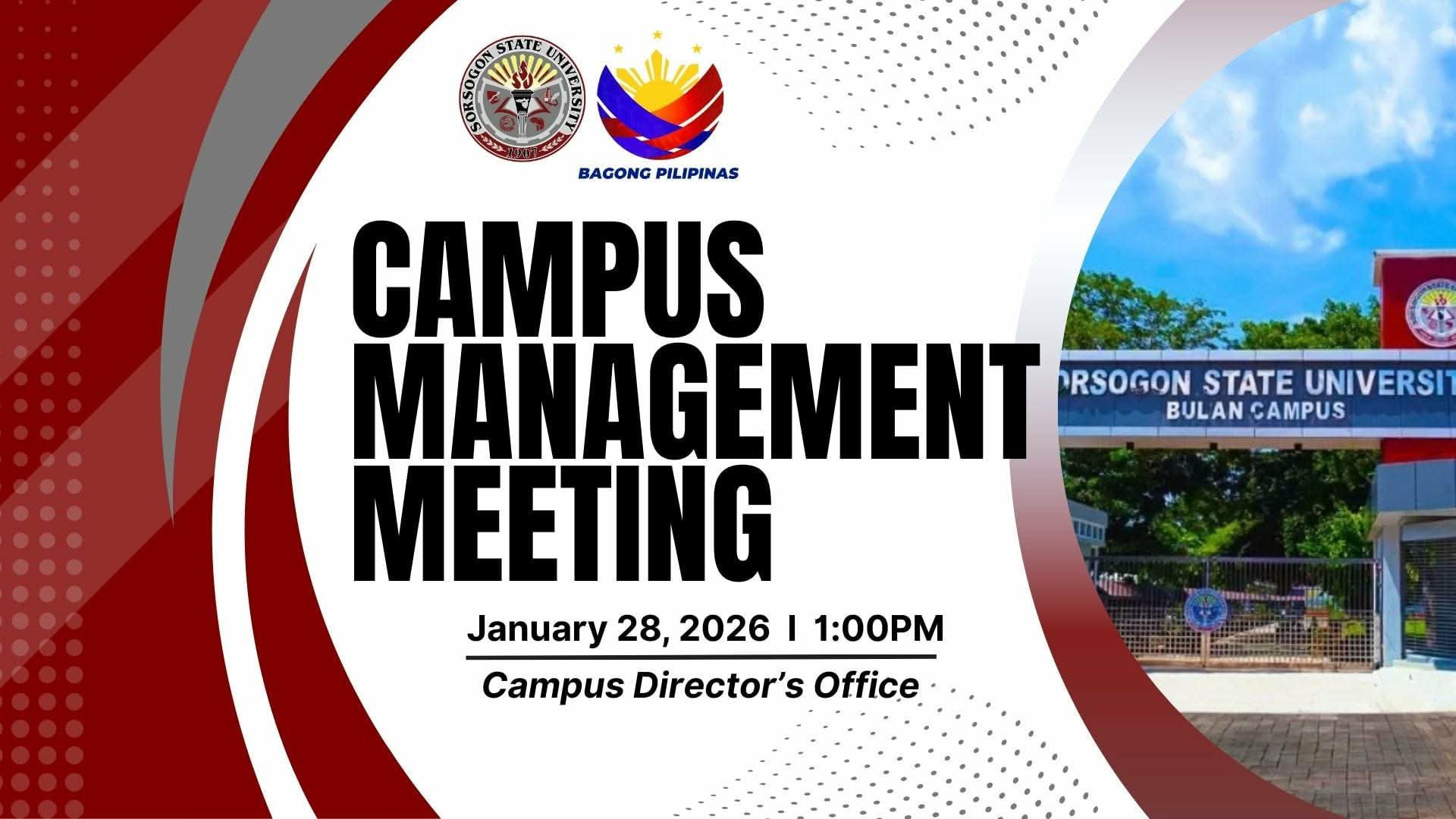 Sorsogon State University – Bulan Campus conducted a Campus Management Meeting to discuss key institutional updates, performance outcomes, and strategic priorities essential to the effective governance of the campus on January 28, 2026 at the Campus Director’s Office.
