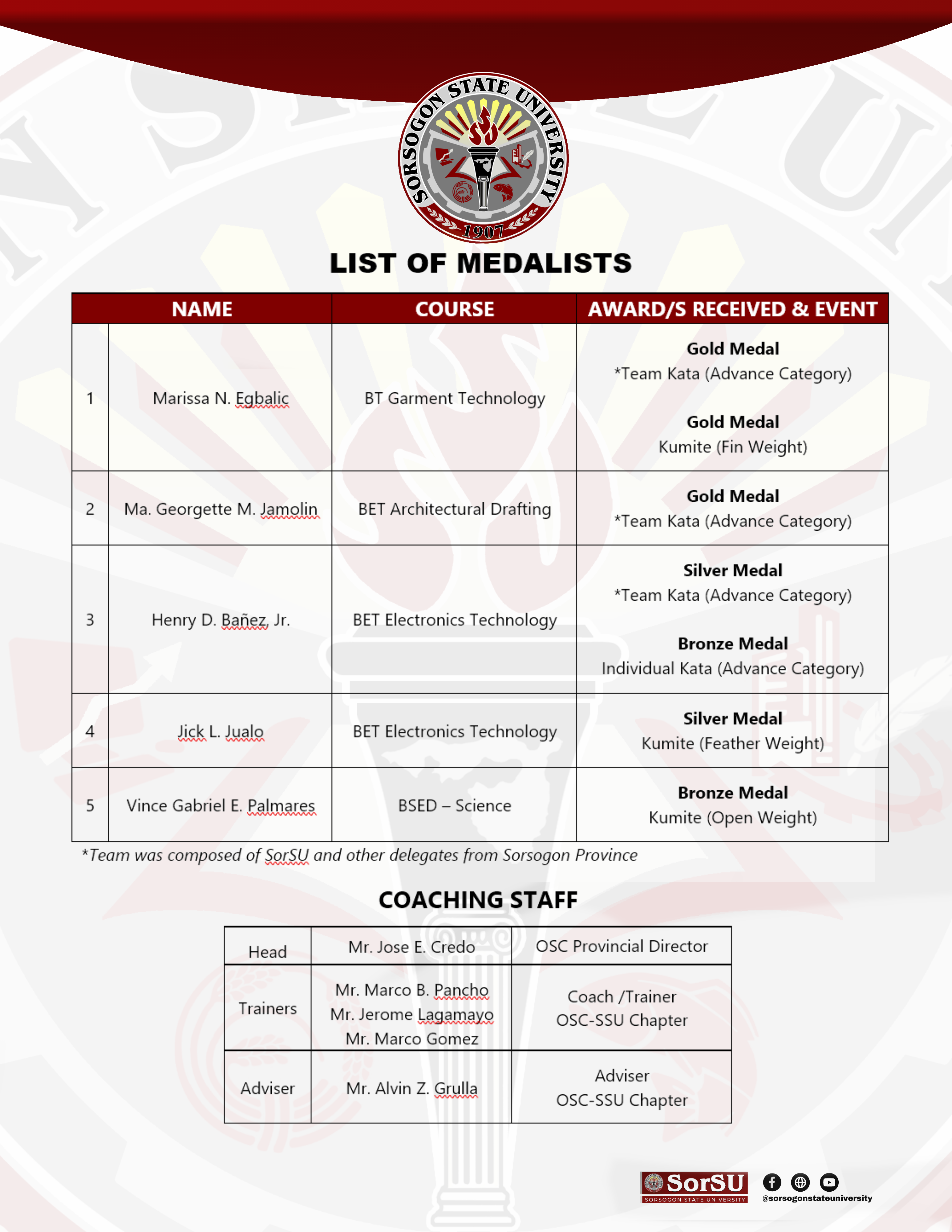 The delegates were accompanied and trained by the coaching staff: Mr. Jose E. Credo (Head, OSC Provincial Director), LD Marco B. Pancho, LD Jerome Lagamayo, and LD Marco Gomez (Coach/Trainers, OSC-SSU Chapter), and Mr. Alvin Z. Grulla (Adviser, OSC-SSU Chapter).