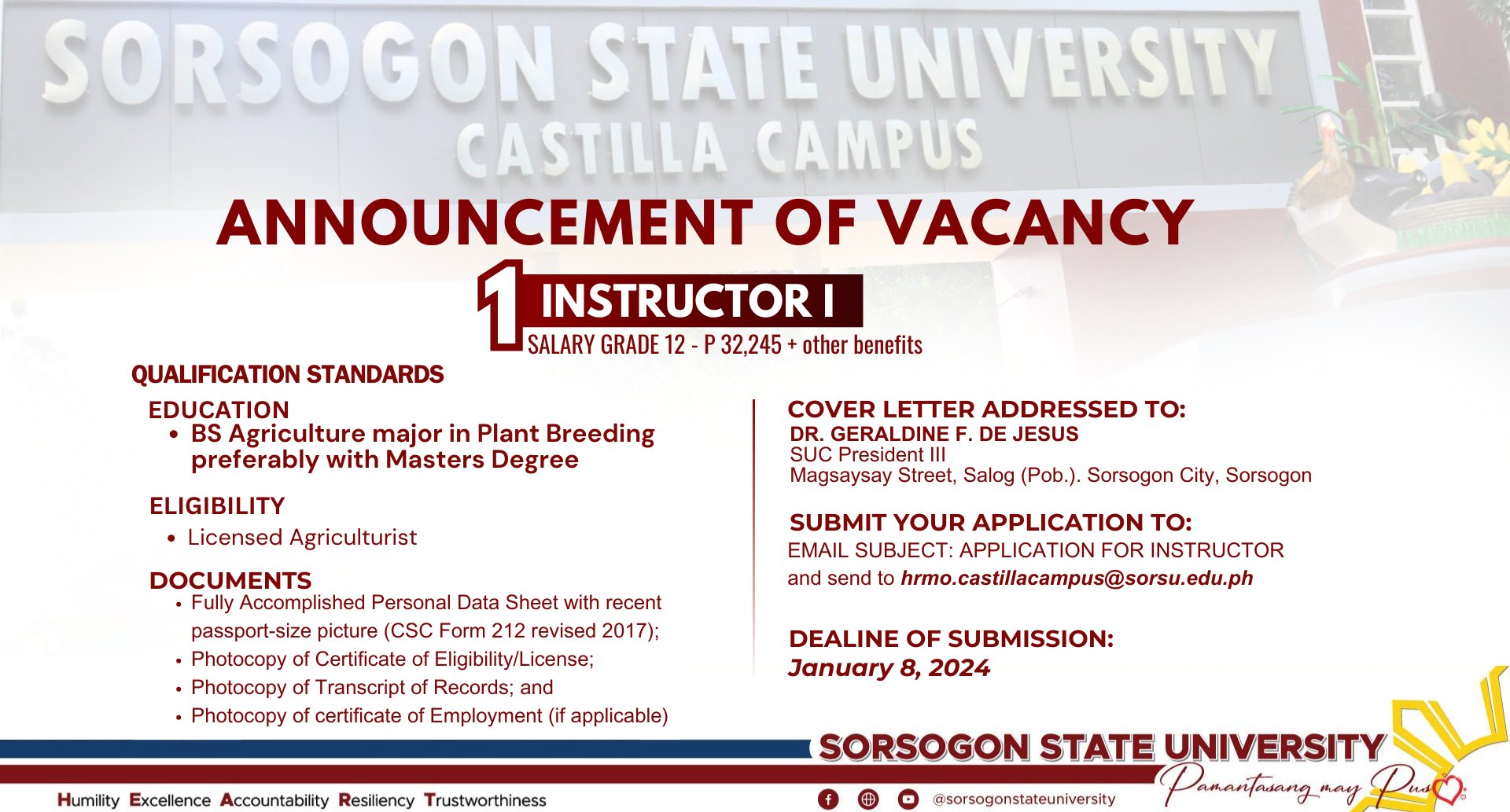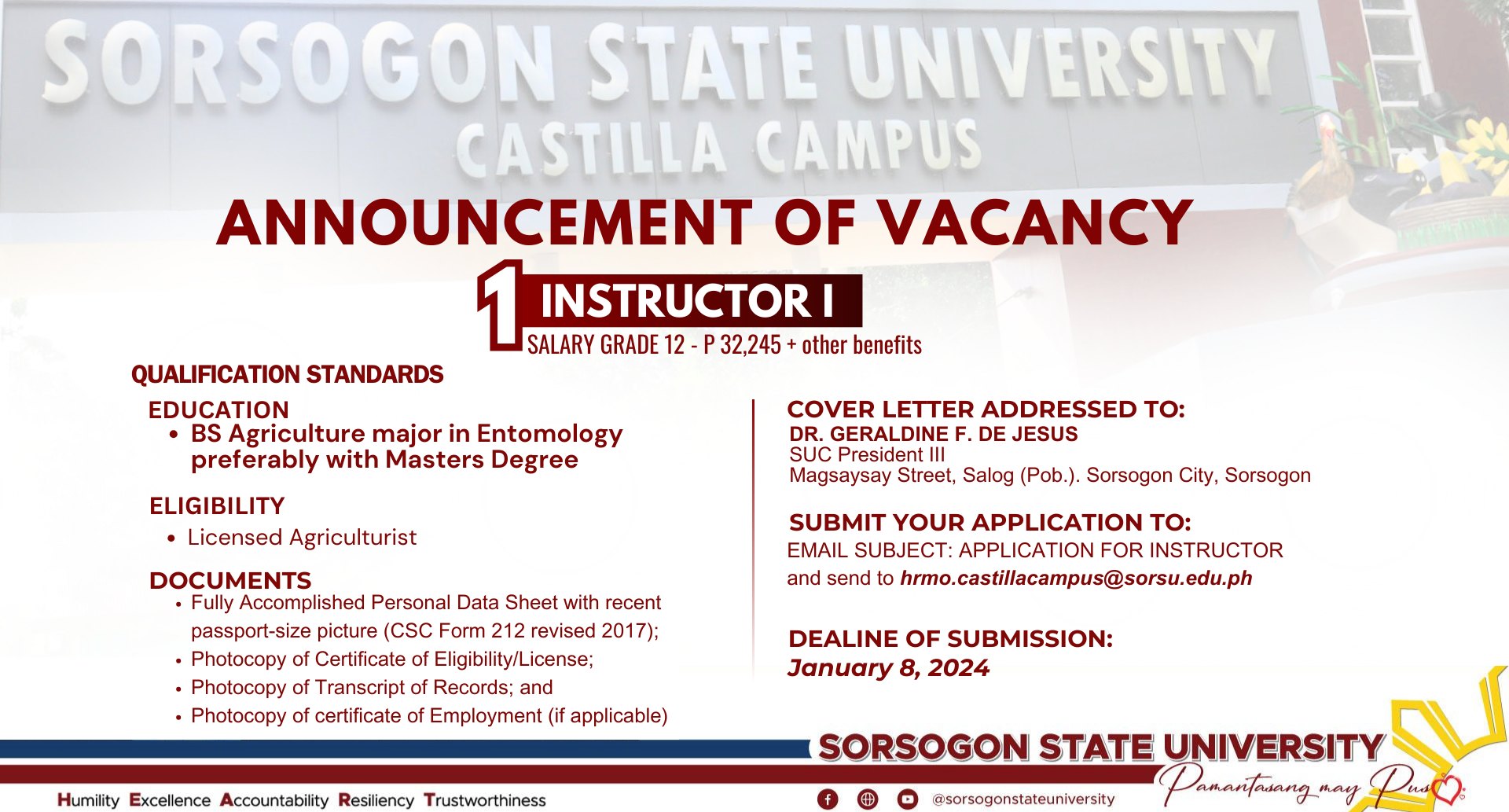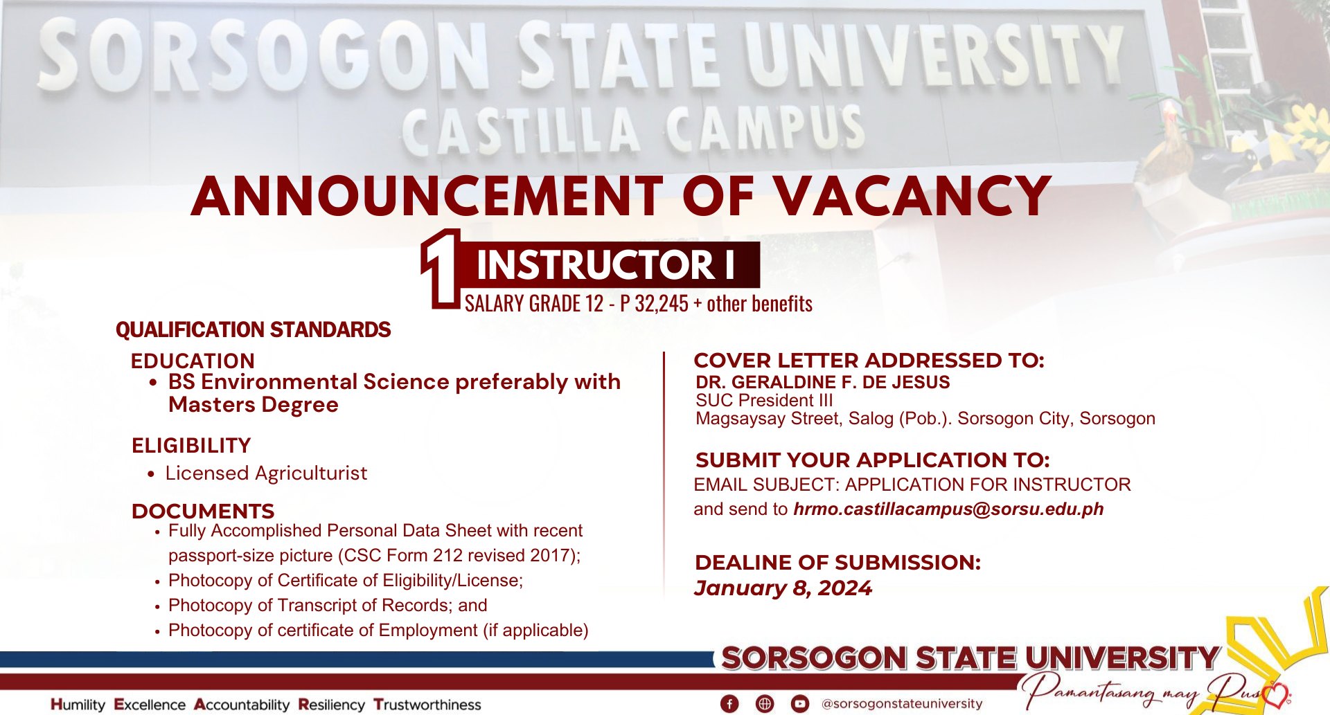 Applications may be emailed to hrmo.castillacampus@sorsu.edu.ph with the subject line “Application for Instructor.” The deadline for submission is January 8, 2025.