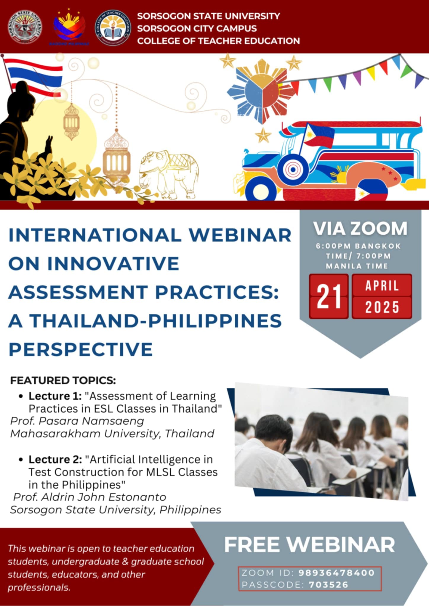 Sorsogon State University College of Teacher Education in collaboration with Sorsogon State University Sorsogon City Campus International Relations Office gladly invites you to International Webinar on Innovative Assessment Practices: A Thailand-Philippines Perspective! πΉππ΅π