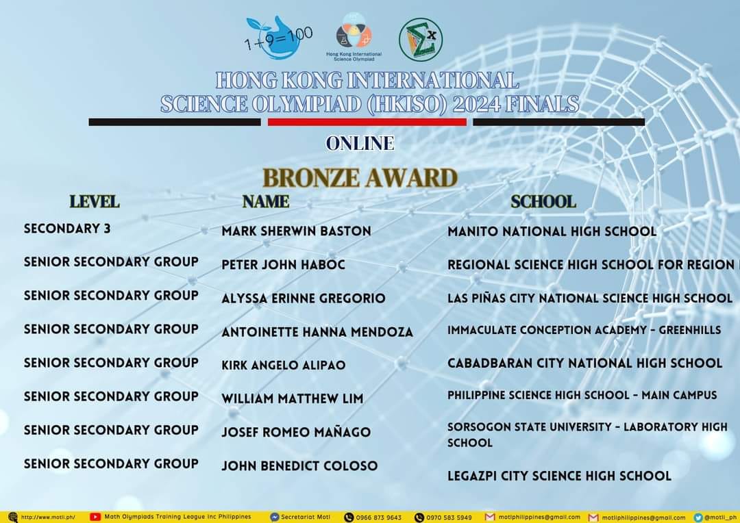 In another historic academic feat, six (6) Sorsogon State University – Laboratory High School (SorSU-LHS) students exhibited remarkable performances at the recently-concluded Hong Kong International Science Olympiad (HKISO) 2024 – Final Round, with two (2) students clinching bronze medals, while four (4) students garnering merit awards, held from June 13-17, 2024, at the Singapore Institute of Management (SIM), Singapore.