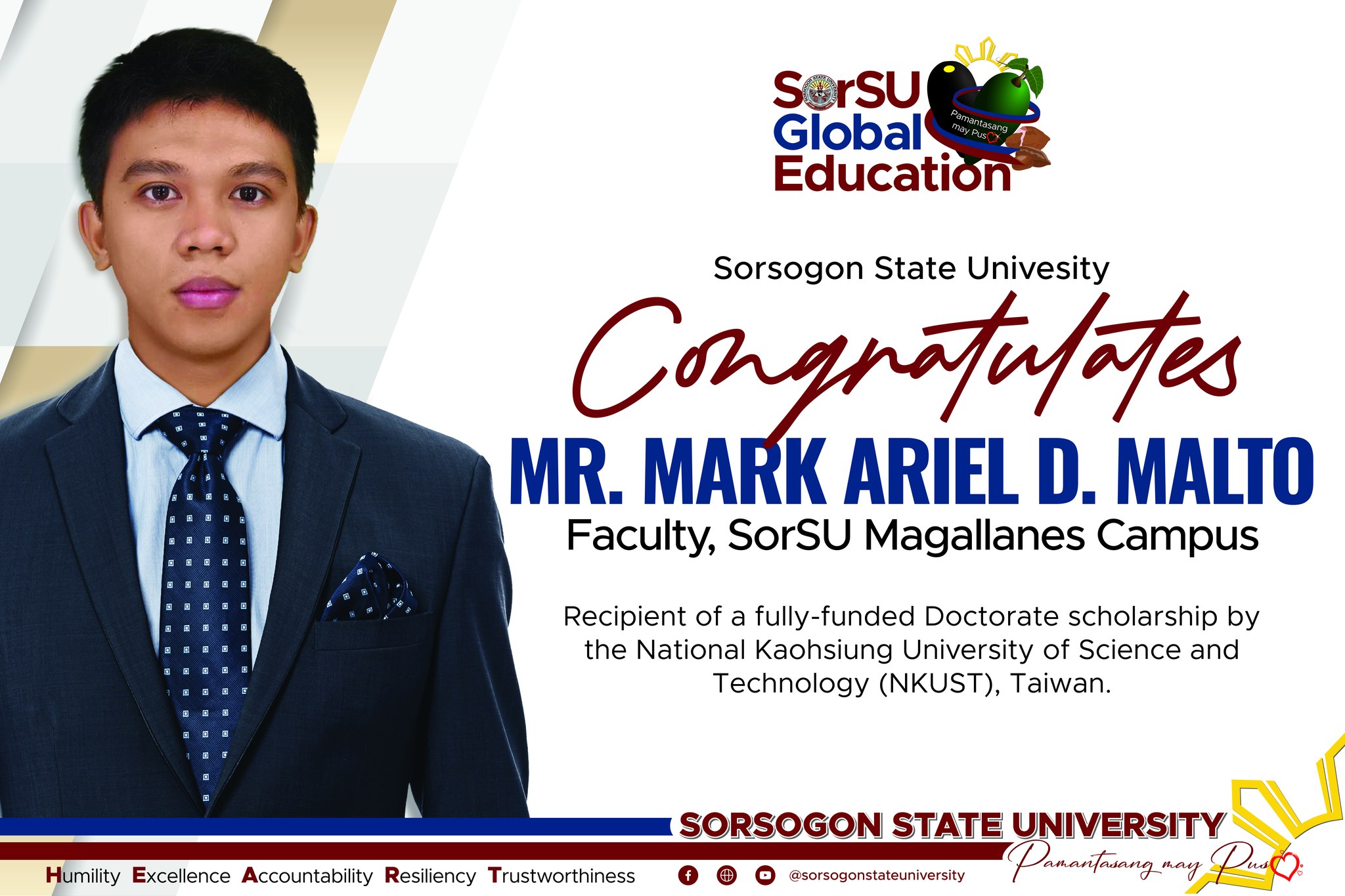 SorSU takes great pride in his achievement and wishes him continued success in his pursuit of knowledge and academic excellence. Once again, warmest congratulations, Prof. Mark Ariel D. Malto! (SorSU PIO)