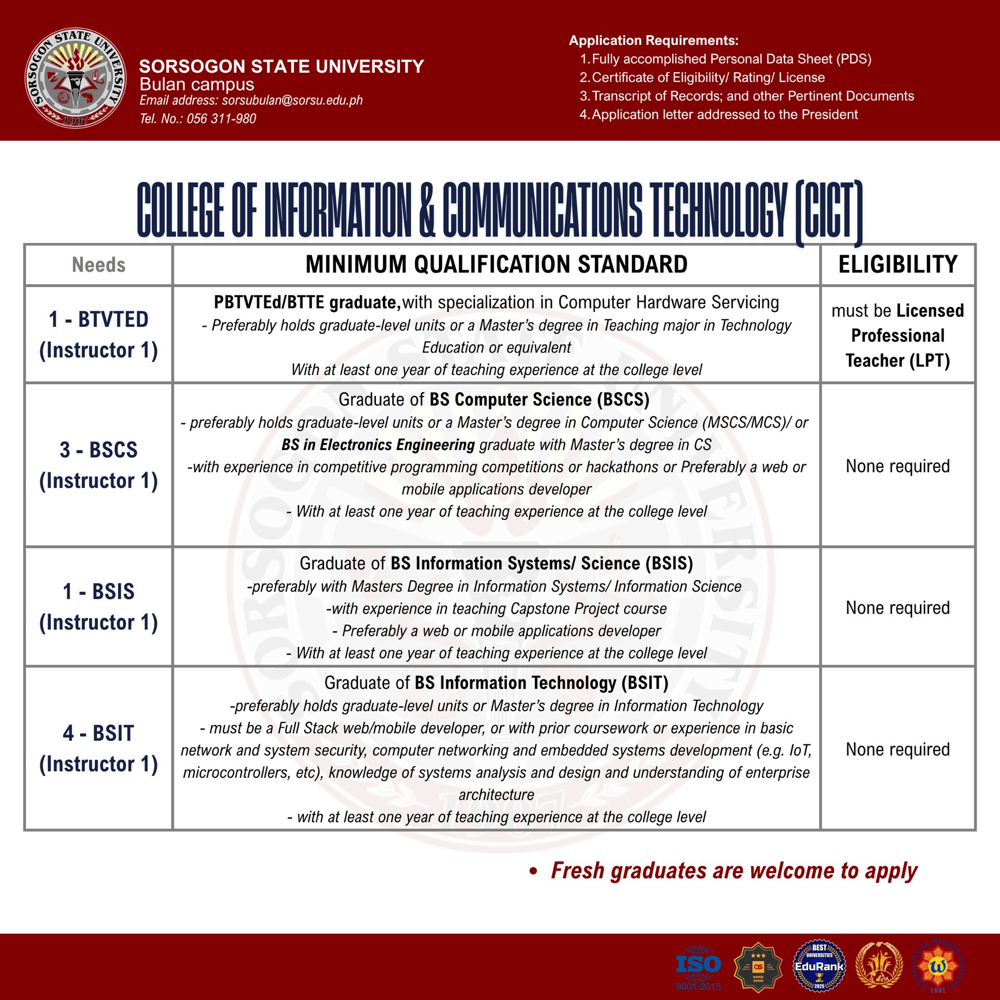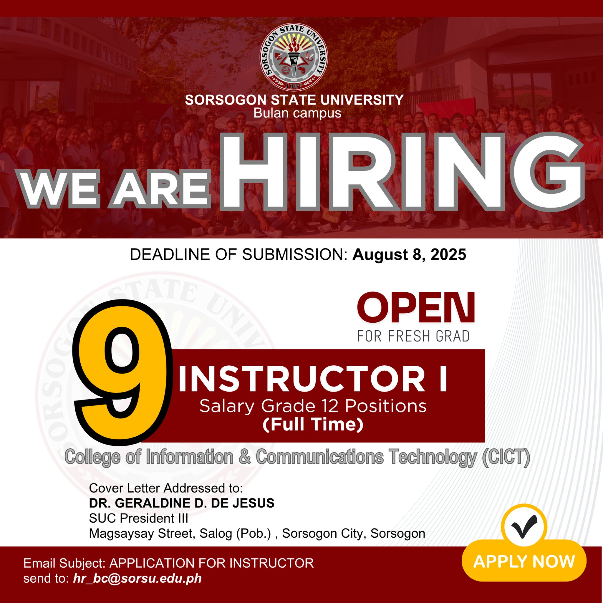 Sorsogon State University – Bulan Campus is looking for nine (9) instructors this 1st Semester, AY 2025-2026 for its College of Information & Communications Technology.