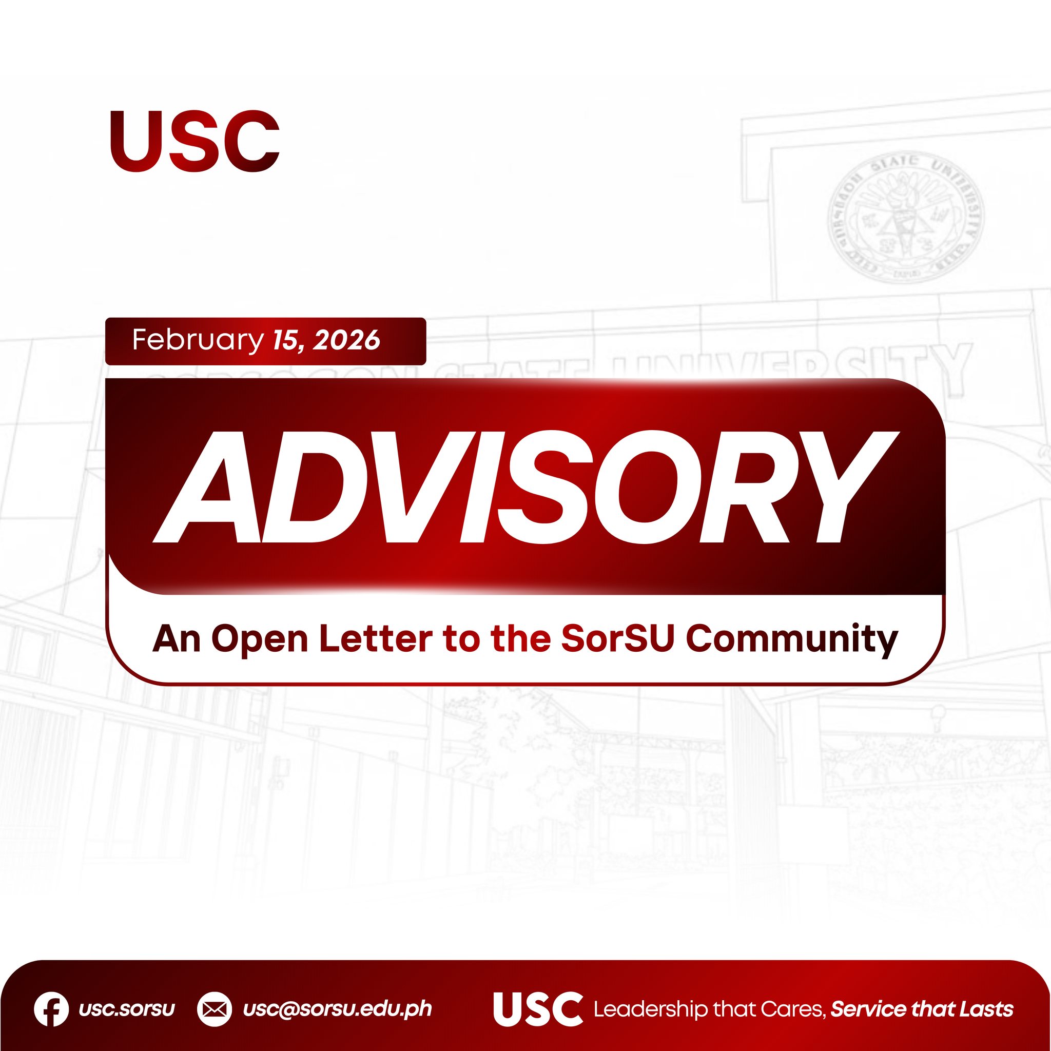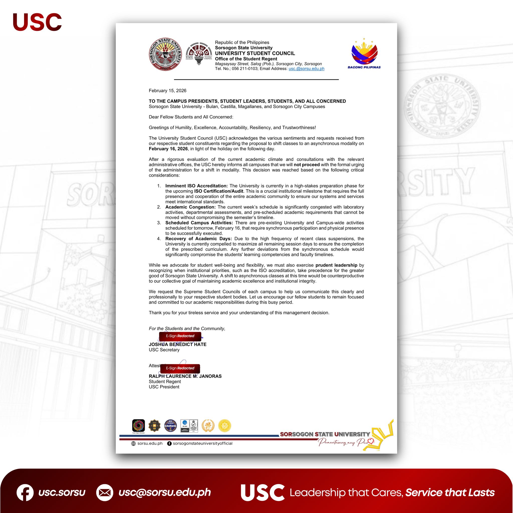 SORSOGON CITY — Following a comprehensive review of current institutional priorities and academic requirements, the University Student Council (USC) officially announces that it will not proceed with the proposal to shift classes to an asynchronous modality for Monday, February 16, 2026.