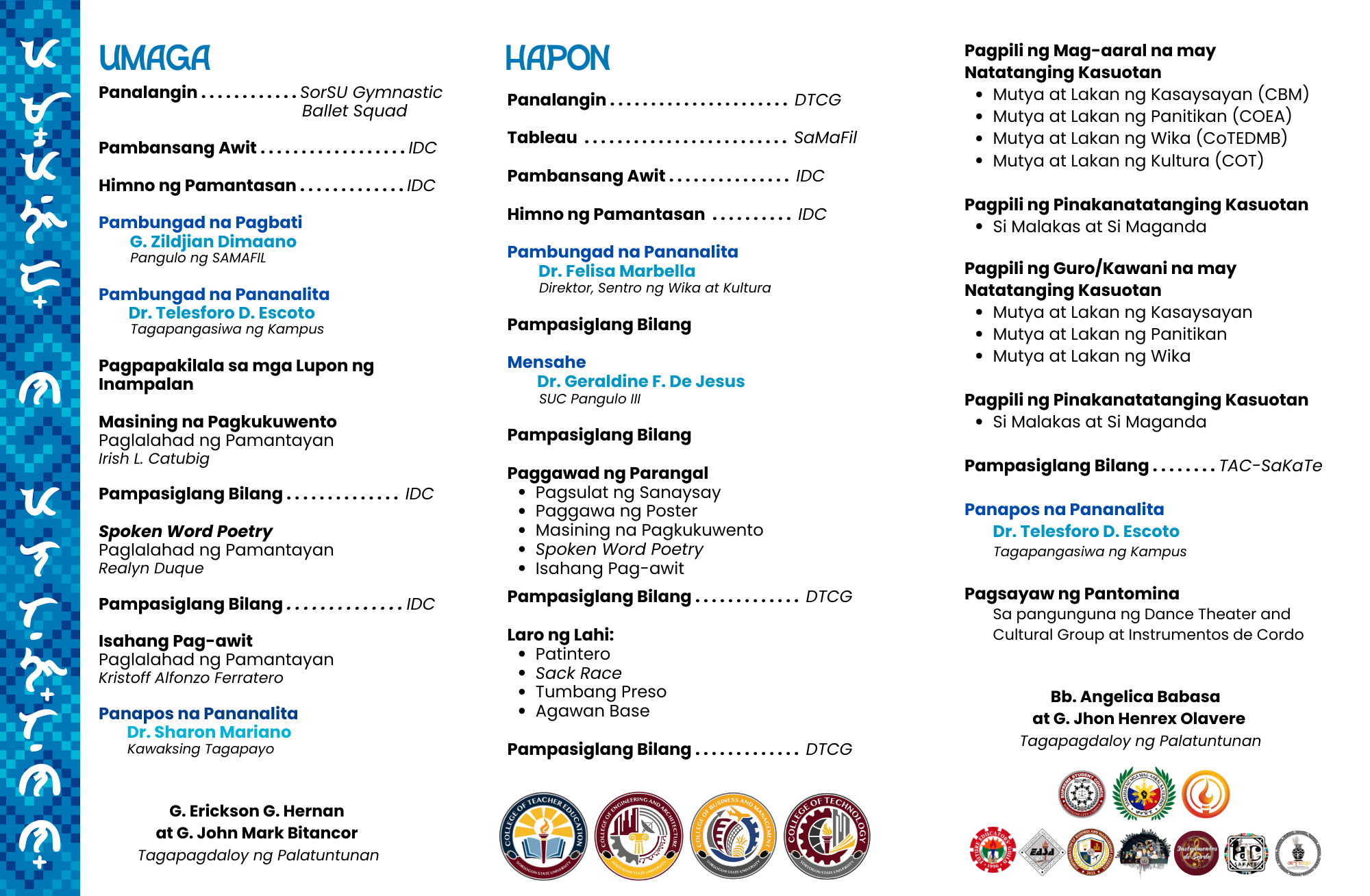 Kaugnay sa pagdiriwang ng Buwan ng Wikang Pambansa sa Unibersidad, inaasahan ang mga estudyante, guro, at mga empleyado na magsuot ng akmang “Kasuotang Filipino” para sa selebrasyon bukas, ika-30 ng Agosto, 2024.