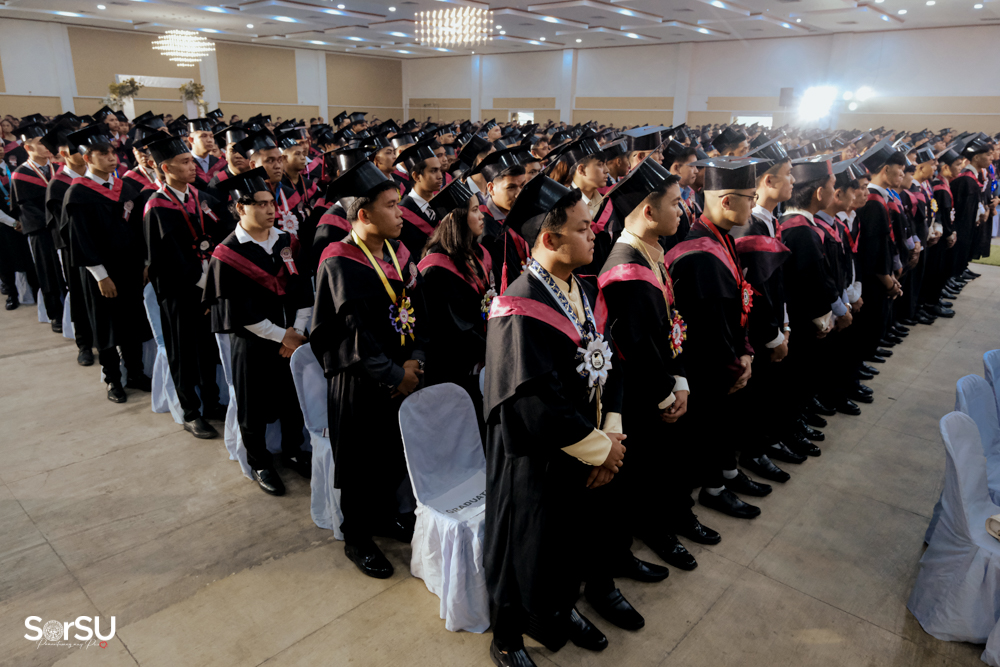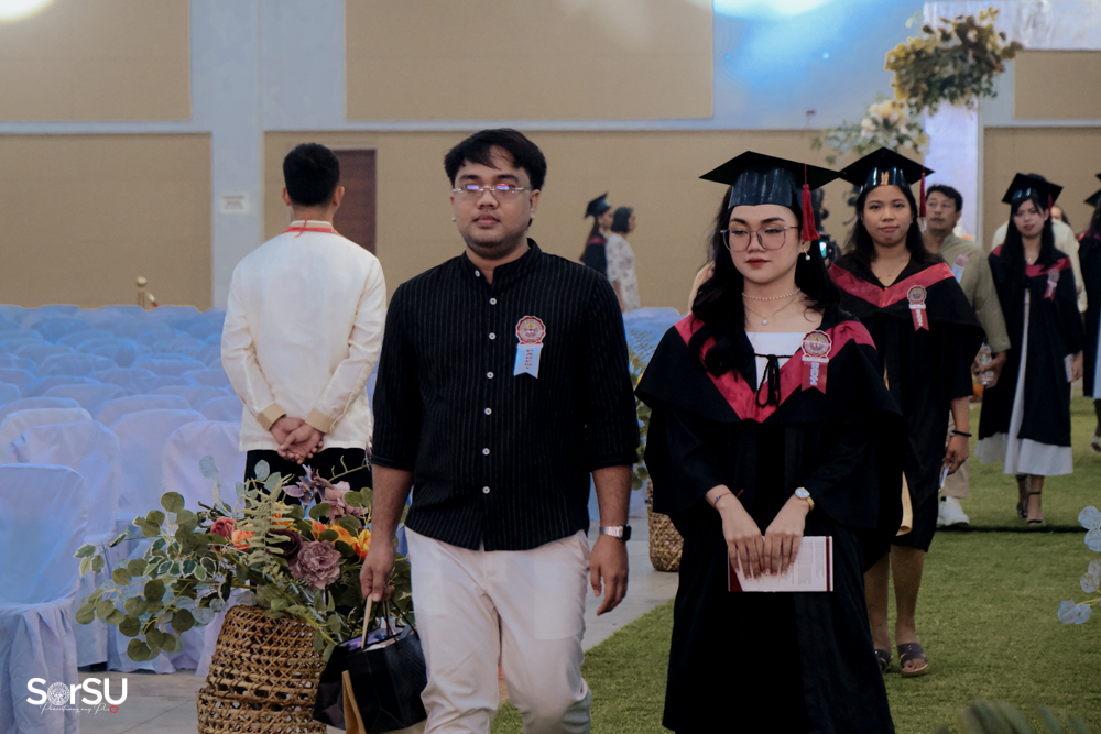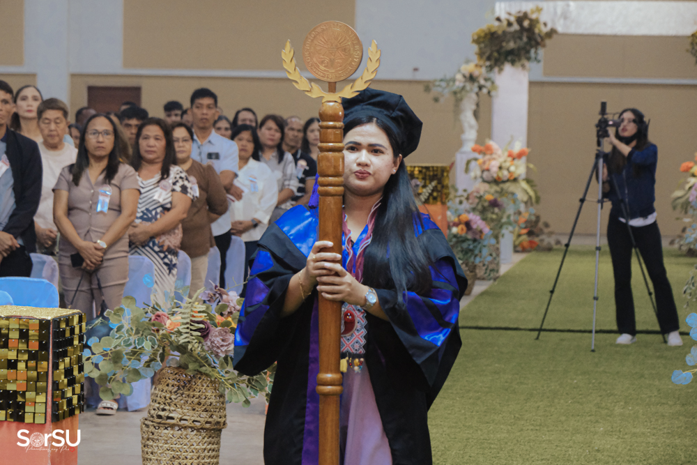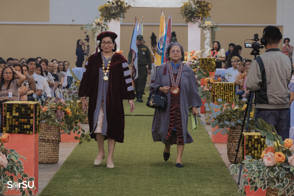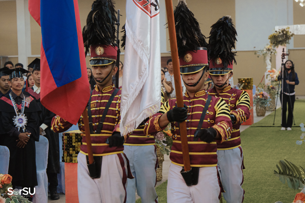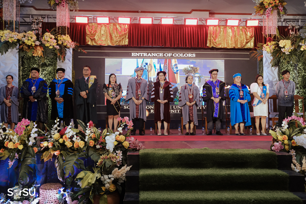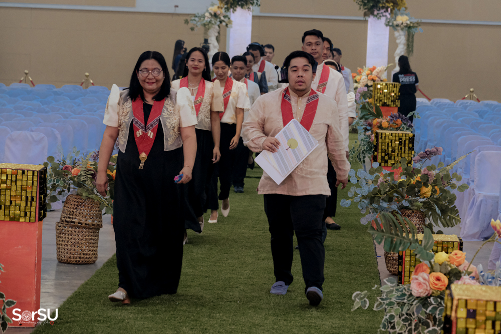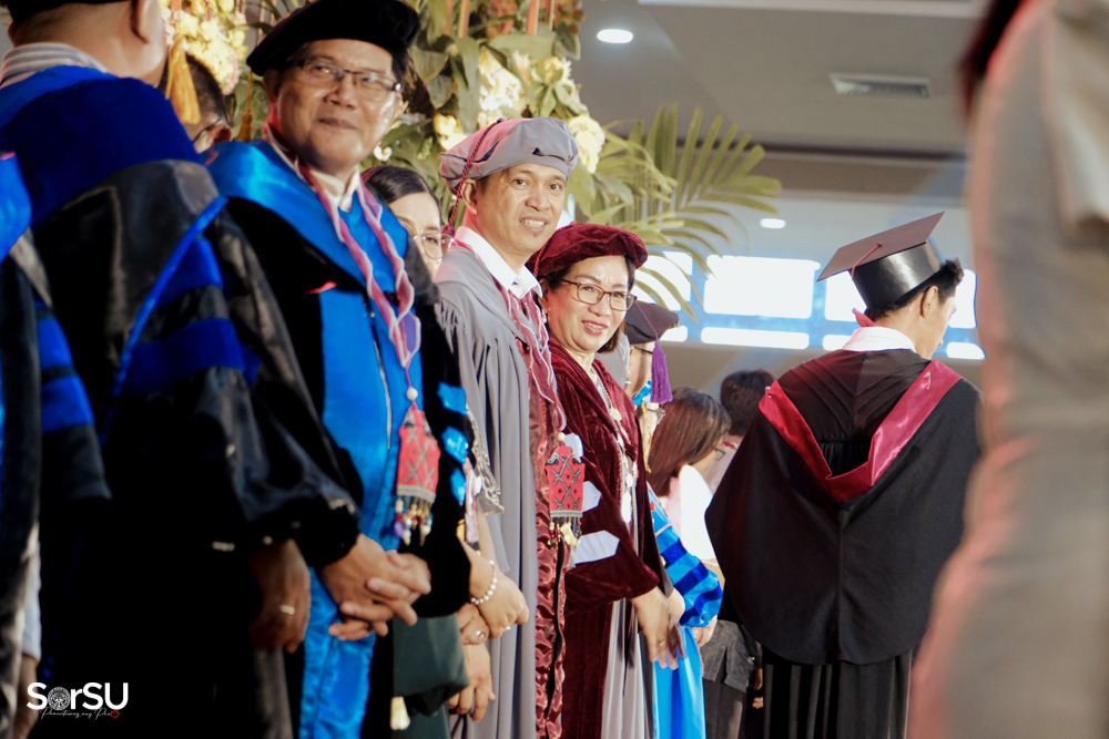The ceremony began with a formal procession, attended by graduating students, their parents, faculty members, university personnel, guests, and the university officials. This was followed by the Philippine National Anthem conducted by Ms. Kristel Kimberly G. Dellomas, an opening prayer delivered through a doxology by the SorSU Chorale, and a musical overture performed by the SorSU Marching Band.