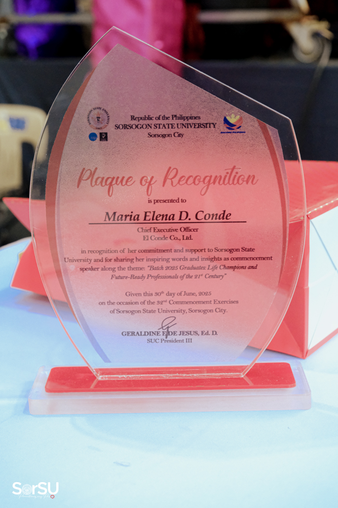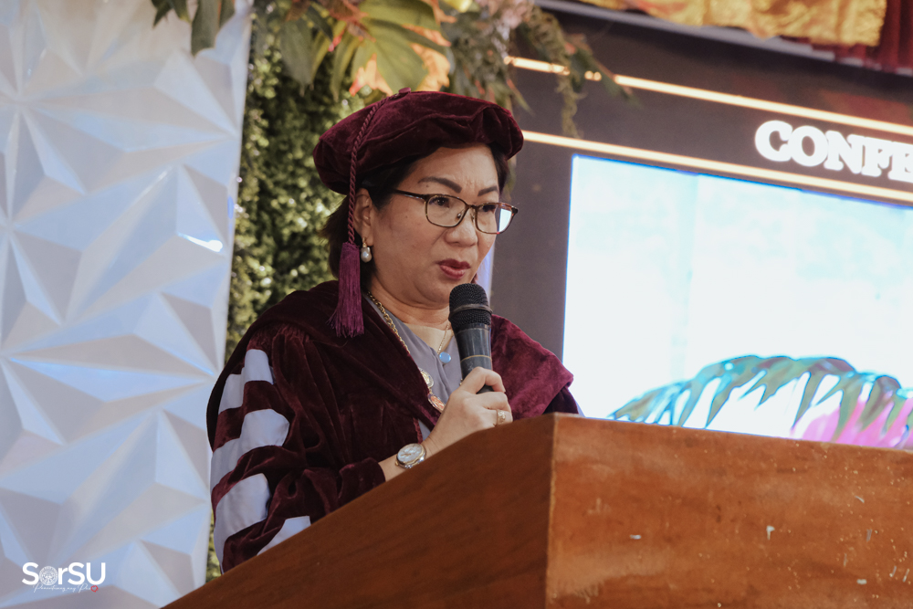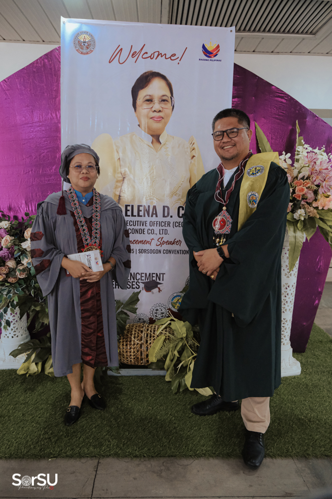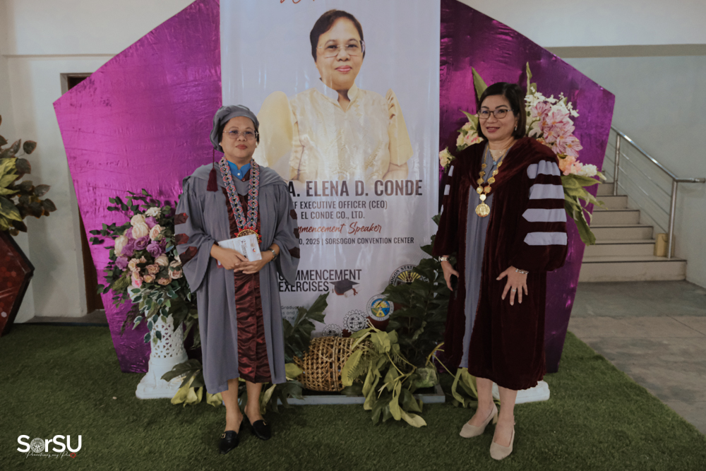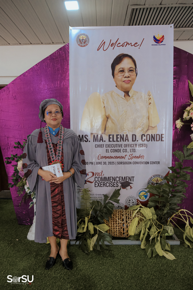 Dr. Telesforo D. Escoto (Campus Director, Sorsogon City Campus) officially presented and certified the candidates for graduation, followed by the conferral of degrees by SUC President III, Dr. Geraldine F. De Jesus, who also introduced the guest speaker, Ms. Maria Elena D. Conde (Chief Executive Officer, El Conde Co., Ltd). In her commencement address, Ms. Conde emphasized the importance of integrity and perseverance. She remarked, “Plant your dreams with intention, water them with prayer, and trust God to bring the growth. Success is not determined by effort alone but by faith, trust, and obedience to God. As you step into this new chapter, remember these words: Commit to the Lord whatever you do, and He will establish your plans.”