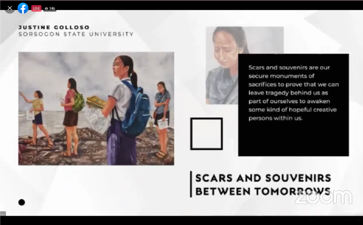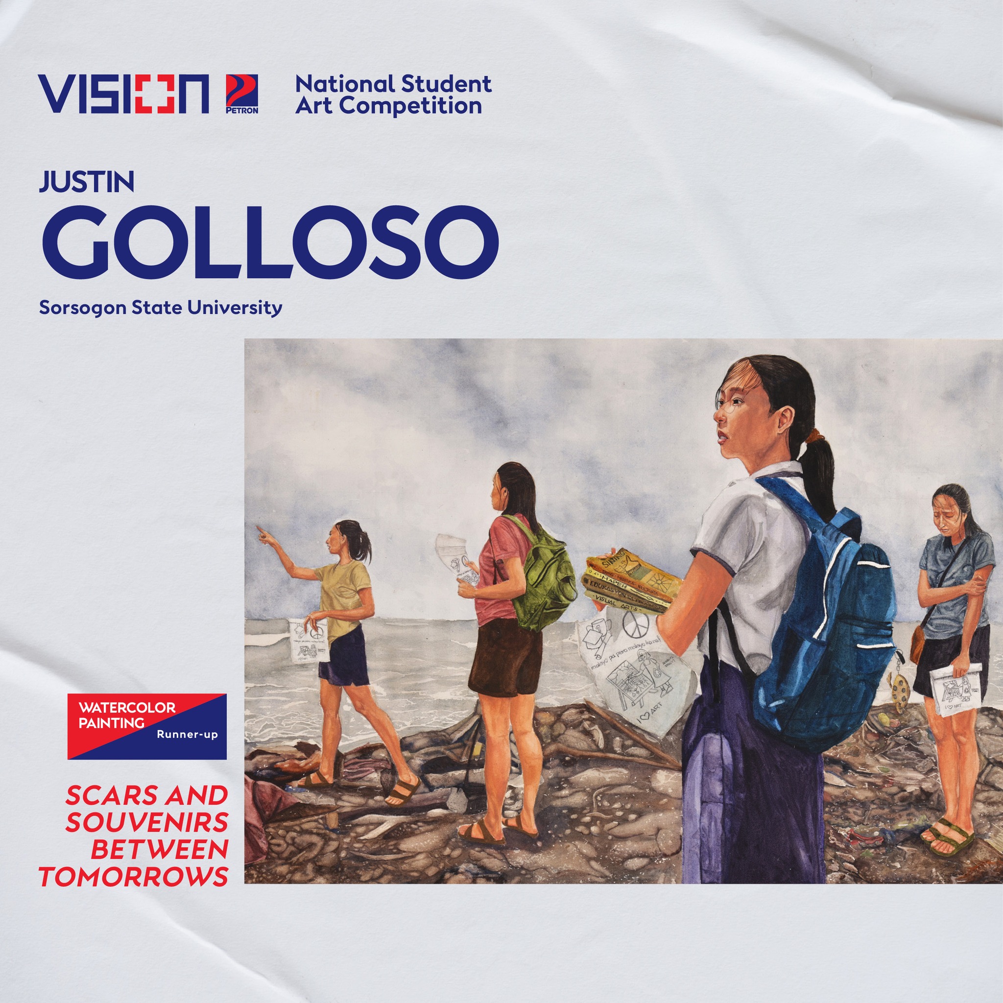 Over hundreds of artworks from 39 State Universities and Colleges across the Philippines were received by Vision Petron having three categories in its competition such as (1) oil/acrylic painting, (2) watercolor/water-based media, and (3) digital art. Golloso entered the Watercolor/water-based media category and submitted his masterpiece titled “𝙎𝙘𝙖𝙧𝙨 𝙖𝙣𝙙 𝙎𝙤𝙪𝙫𝙚𝙣𝙞𝙧𝙨 𝙗𝙚𝙩𝙬𝙚𝙚𝙣 𝙏𝙤𝙢𝙤𝙧𝙧𝙤𝙬𝙨” (An art depicting the perseverance of a student to hold a firm grip on his dreams despite the many changing challenges of the times.) which won him the Runner Up spot in the competition. Aside from placing as Runner up, Golloso is also the 𝙛𝙞𝙧𝙨𝙩 𝘽𝙞𝙘𝙤𝙡𝙖𝙣𝙤 𝙩𝙝𝙖𝙩 𝙧𝙚𝙥𝙧𝙚𝙨𝙚𝙣𝙩𝙚𝙙 𝙎𝙤𝙧𝙎𝙐 𝙞𝙣 𝙑𝙞𝙨𝙞𝙤𝙣 𝙋𝙚𝙩𝙧𝙤𝙣 𝙉𝙖𝙩𝙞𝙤𝙣𝙖𝙡 𝙎𝙩𝙪𝙙𝙚𝙣𝙩𝙨 𝘼𝙧𝙩 𝘾𝙤𝙢𝙥𝙚𝙩𝙞𝙩𝙞𝙤𝙣 2022.