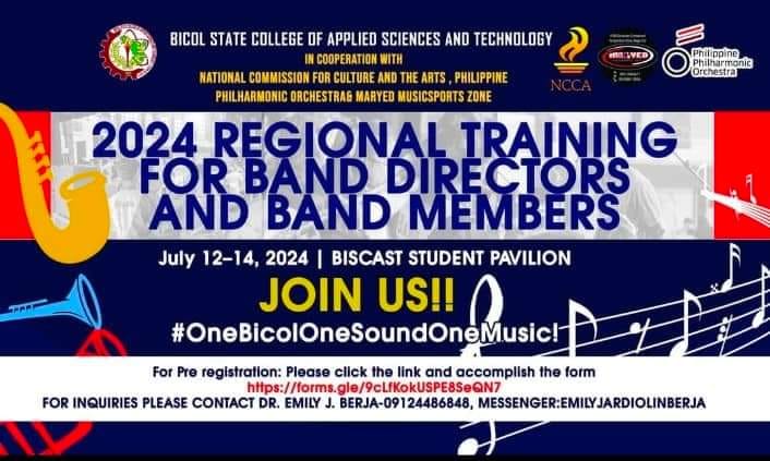 The Bicol State University of Applied Sciences and Technology, in collaboration with the National Commission for Culture and the Arts, the Philippine Philharmonic Orchestra, and Maryed Music Sports Zone, hosted the 2024 Regional Training for Band Directors and Band Members from July 12-14, 2024, at the BISCAST Student Pavilion.