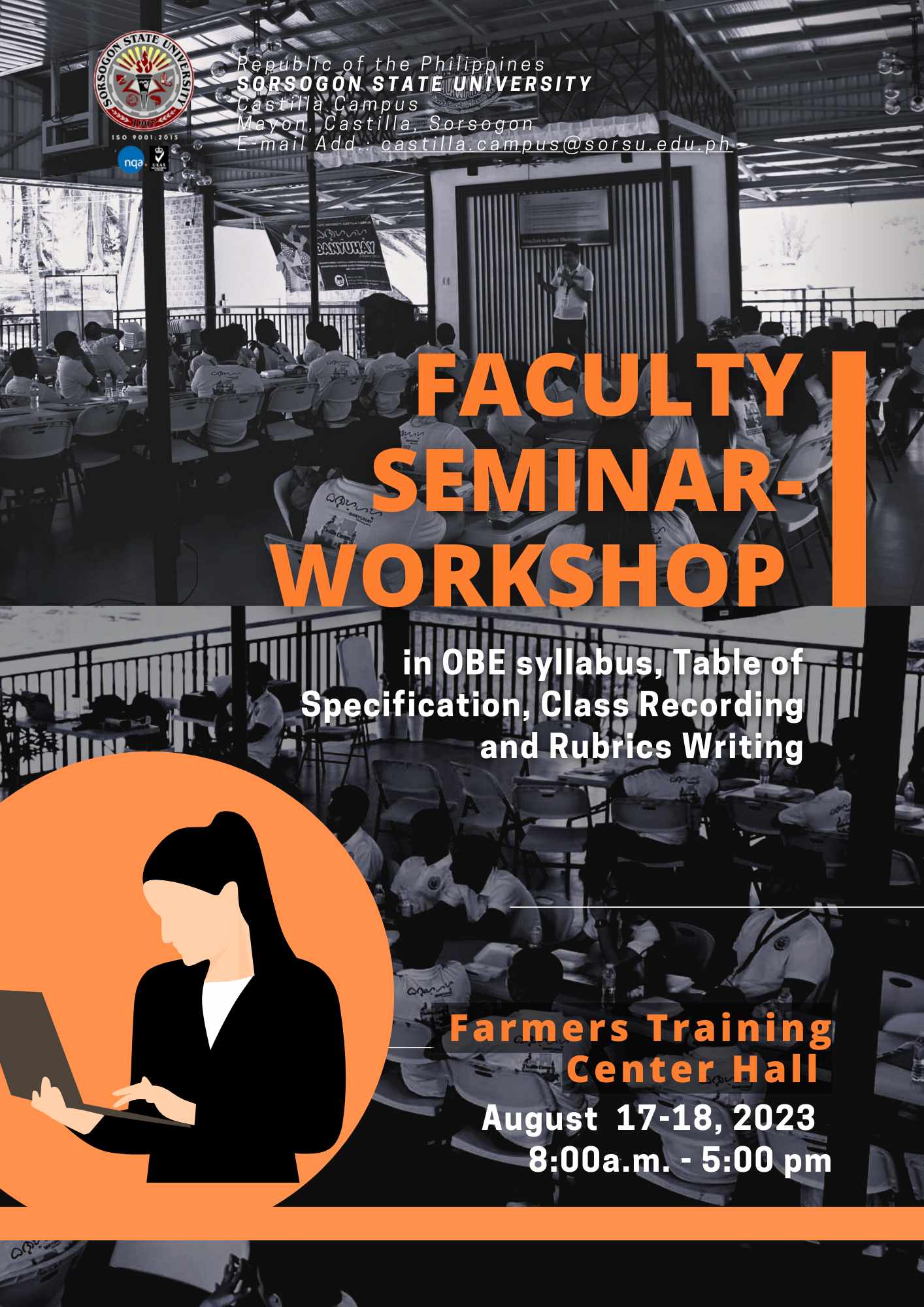 SorSU-CC Faculty Undergoes Faculty Seminar and Workshop Gearing up its preparation for the coming academic year 2𝟶23-2𝟶24, the Sorsogon State University-Castilla Campus Faculty underwent a Faculty Seminar and Workshop. The Seminar Workshop focused on OBE Syllabus Writing, Rubrics Making, Table of Specifications Preparation, and Class Recording last August 17-18, 2𝟶23, at the Farmers’ Training Center of Sorsogon State University- Castilla Campus.