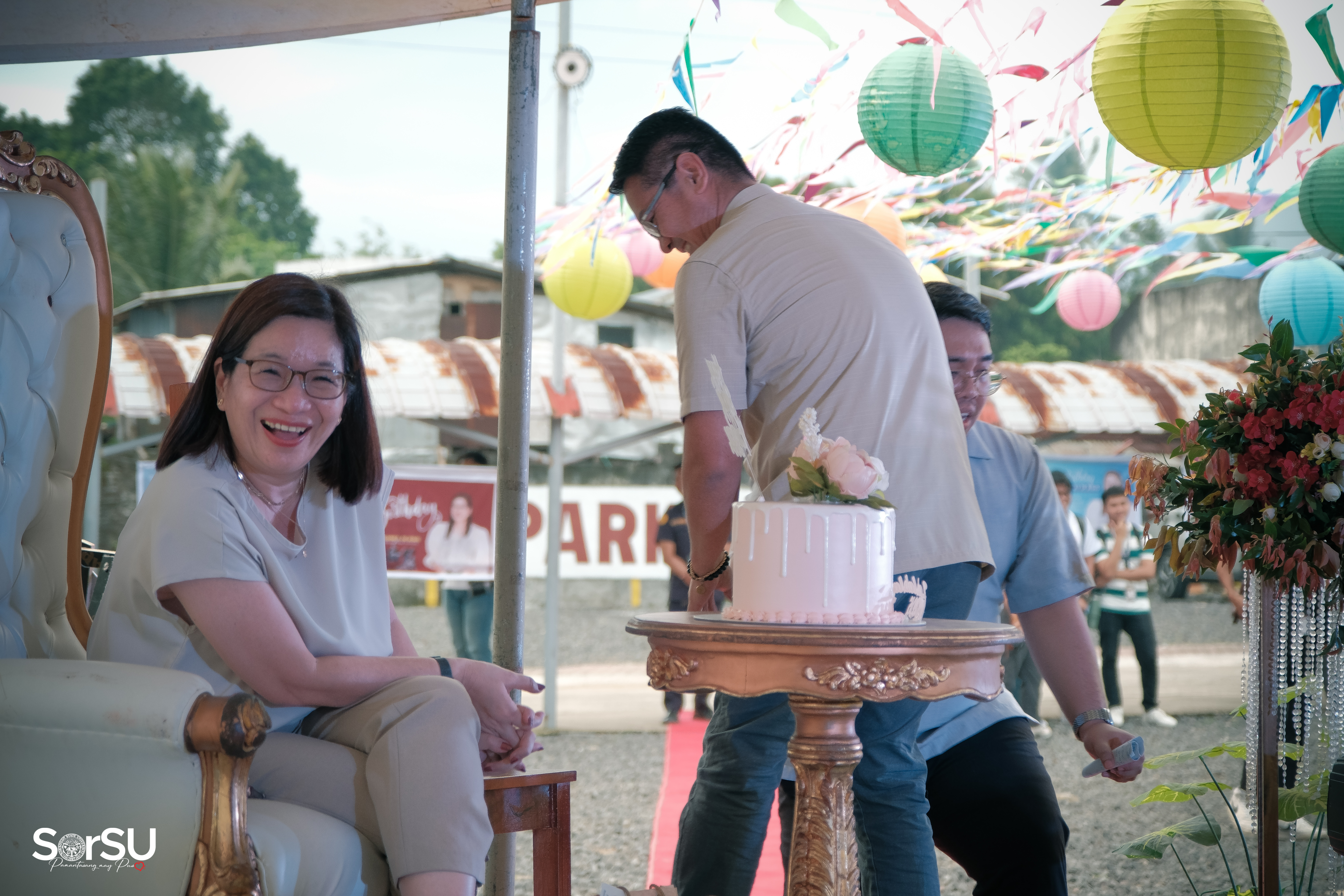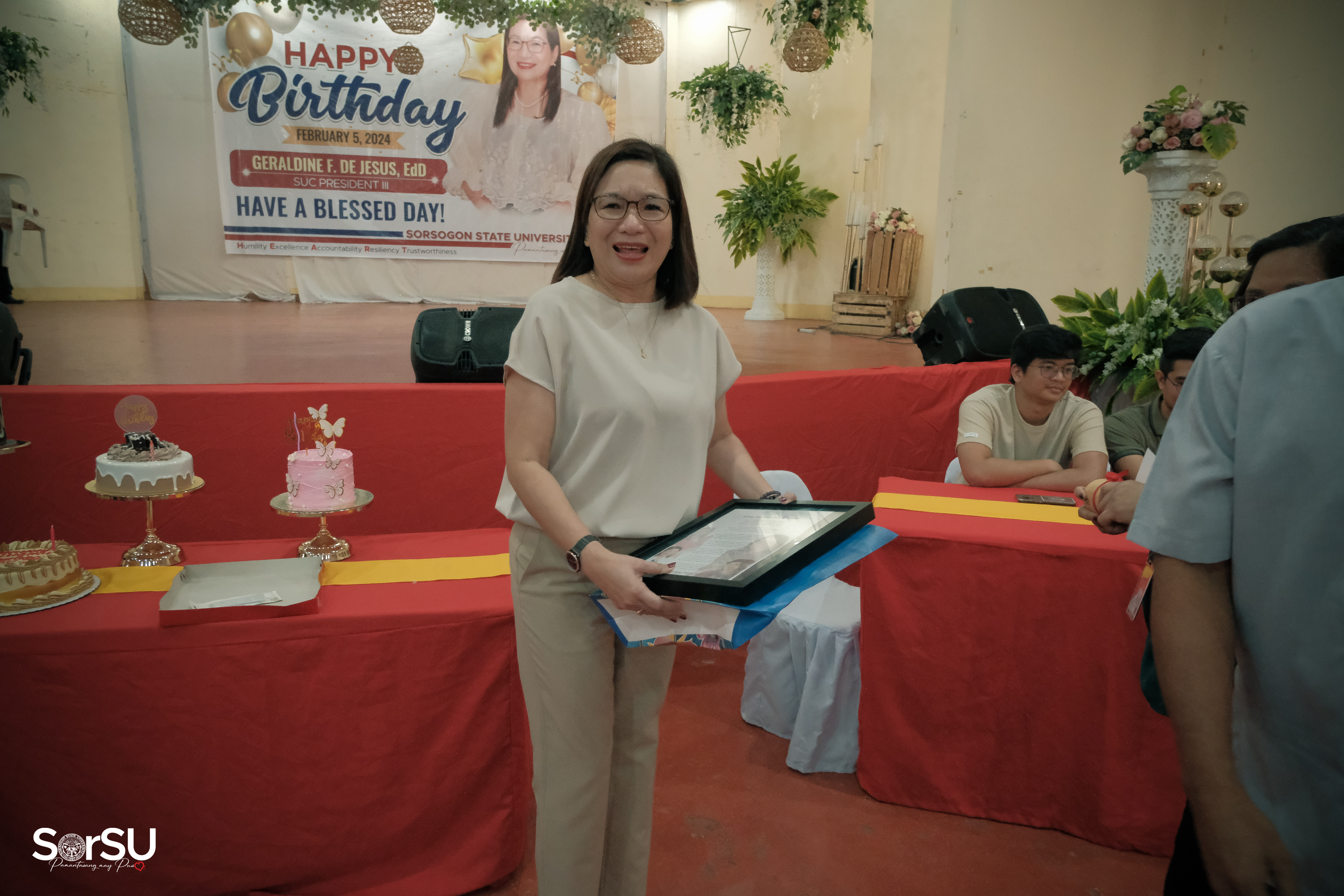 United as a community, Sorsogon State University (SorSU), headed by its top management officials, teaching & non-teaching personnel, and SorSUeno students, heartwarmingly celebrated the birthday of its visionary, inspirational, and nurturing leader — SUC President III, Dr. Geraldine F. De Jesus on February 5, 2024, at the SorSU Social Hall and in front of the Architectural Building for the part 2 (surprise) birthday celebration.