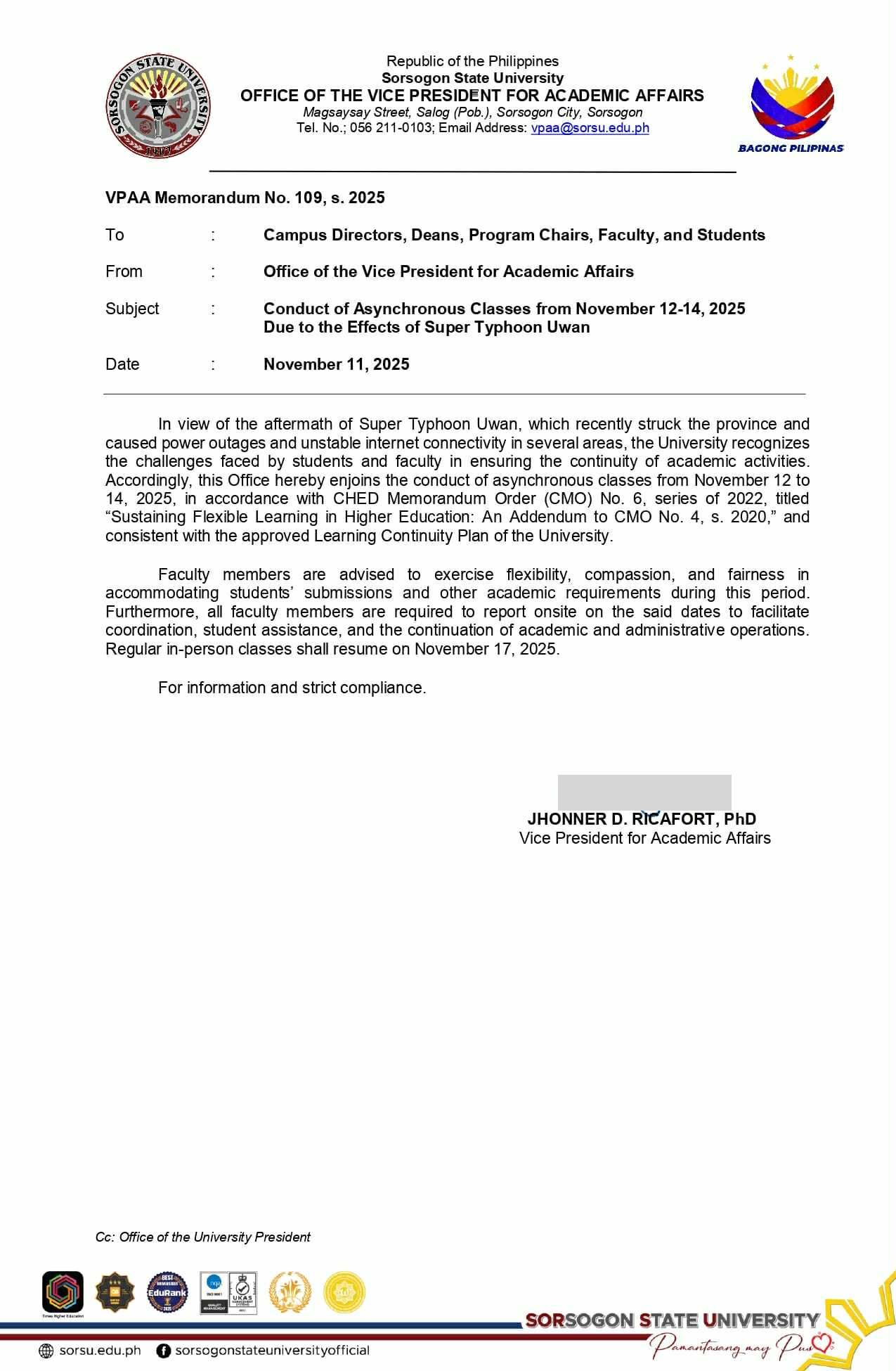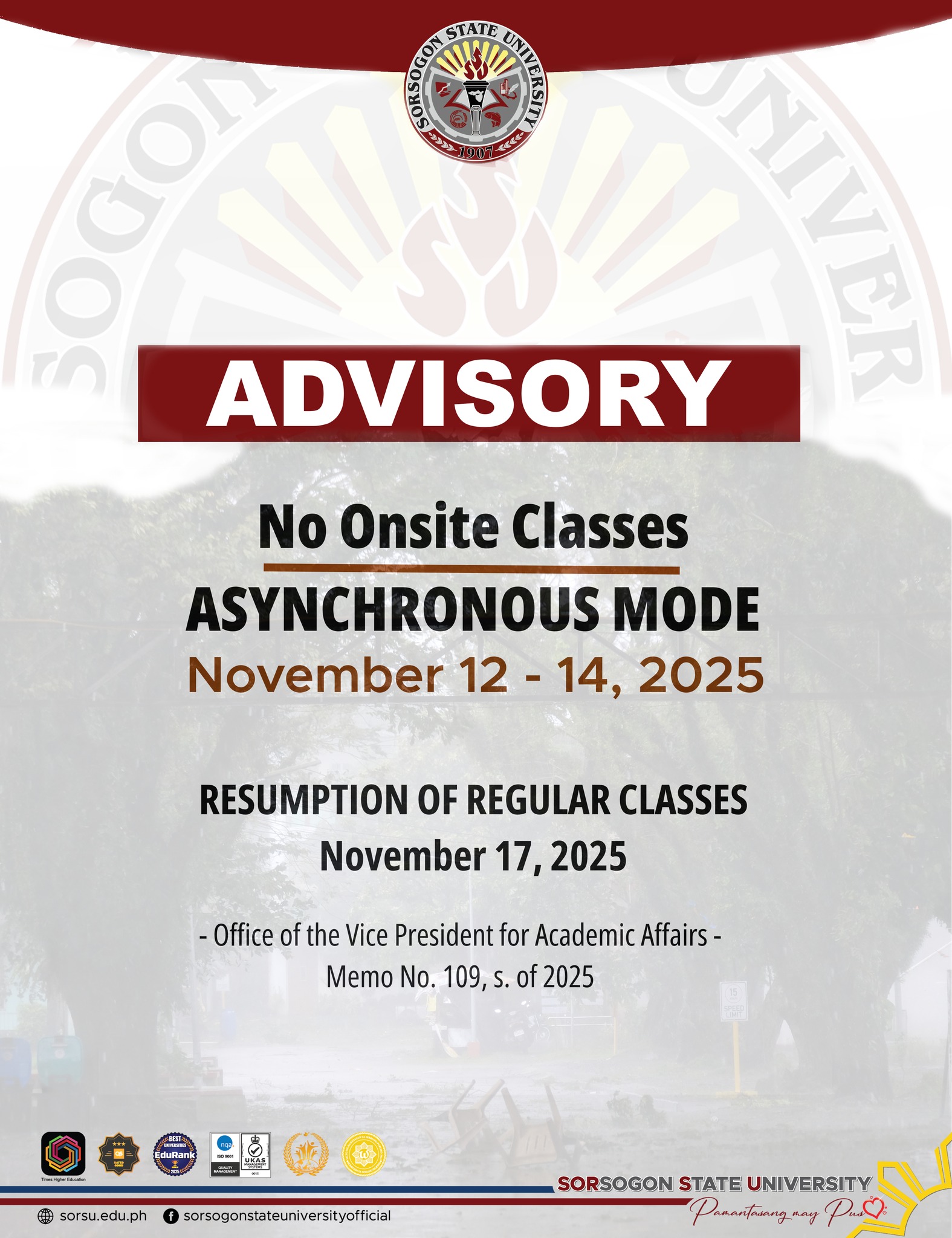 In response to the extensive impact of Super Typhoon Uwan, Sorsogon State University (SorSU) will conduct asynchronous classes from November 12 to 14, 2025, as advised in Memo No. 109, s. 2025 from the Office of the Vice President for Academic Affairs.