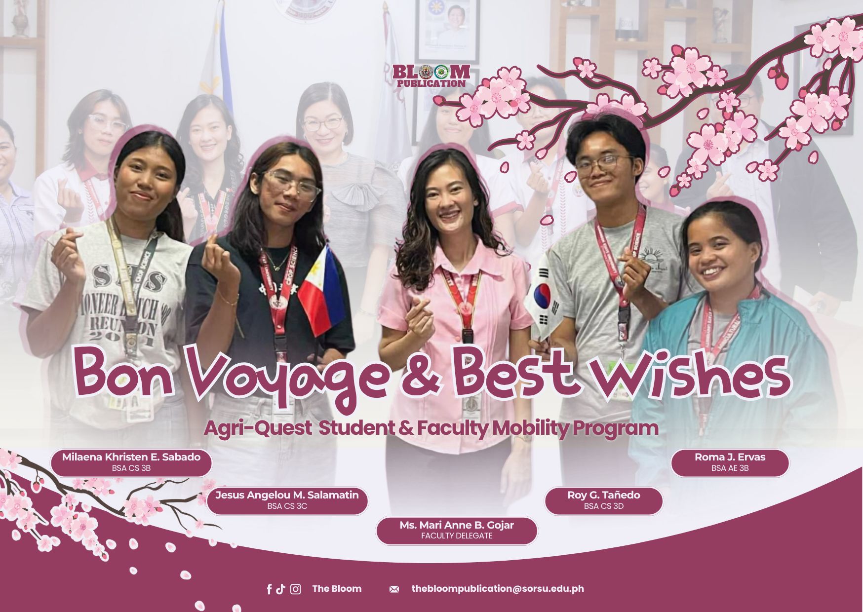 The five-member SorSU Delegation is composed of four exemplary third-year BS Agriculture students: Roma J. Ervas (major in Agricultural Education), Milaena Khristen E. Sabado, Jesus Angelou M. Salamatin, and Roy G. Tanedo (majors in Crop Science), together with our inspiring faculty delegate, Ms. Mari Anne B. Gojar (Faculty Member and IRO Coordinator, SorSU Castilla Campus), who will proudly represent the University in this meaningful international endeavor.