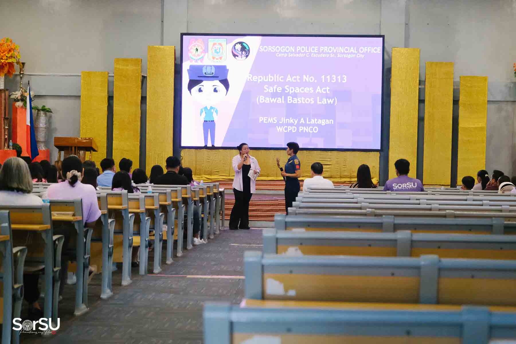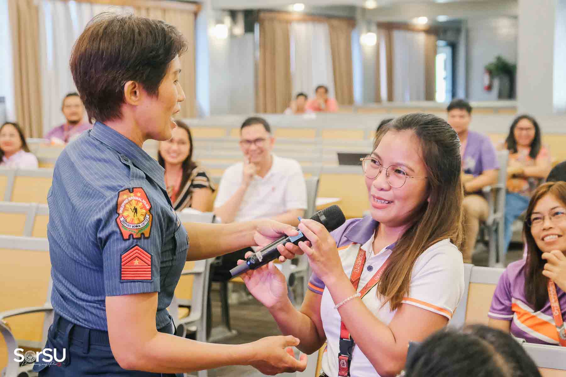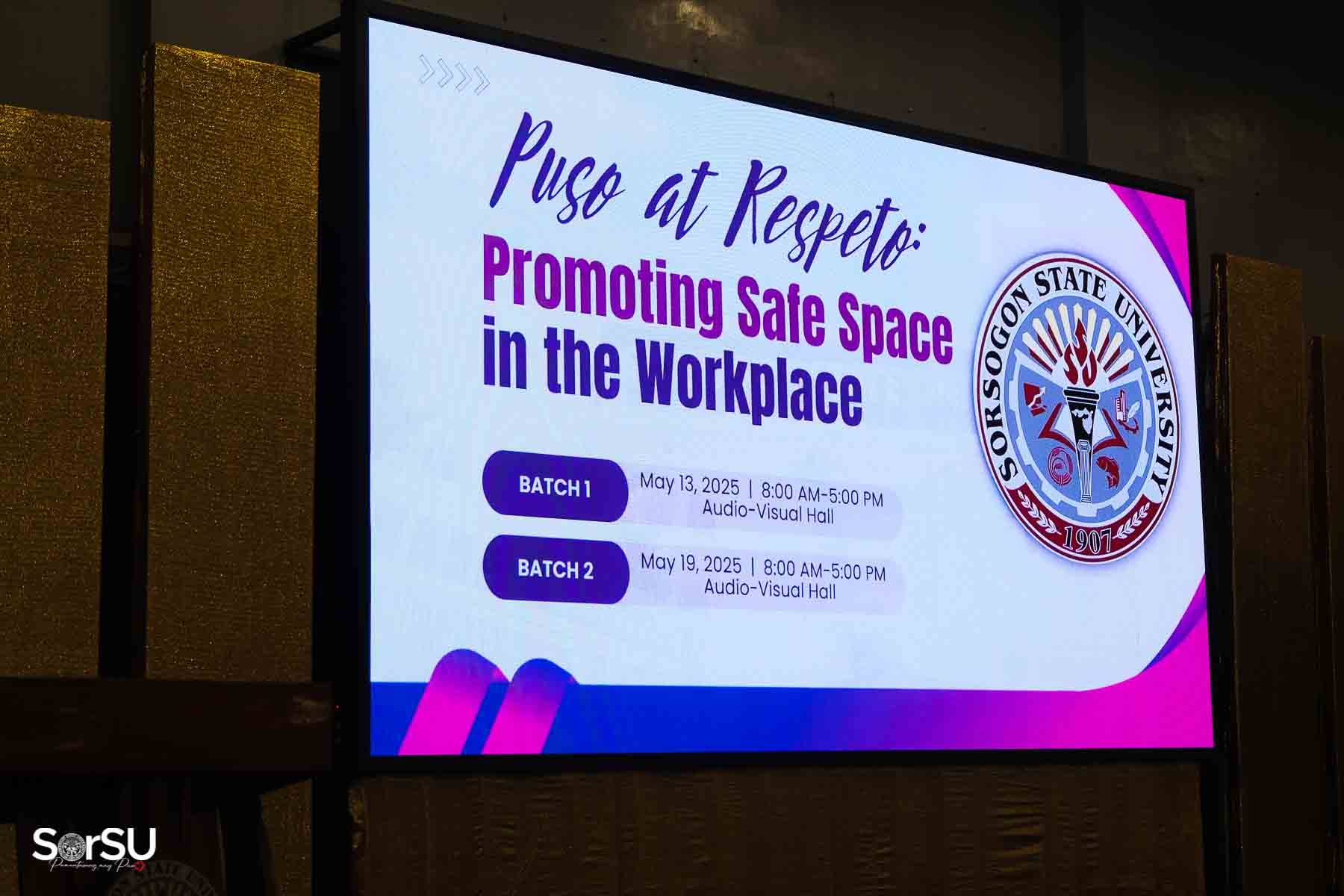 To champion gender sensitivity, inclusivity, and a safe working/learning environment, Sorsogon State University (SorSU), led by the Office of Legal Affairs, Human Resource Management and Development Office (HRMDO), Gender and Development (GAD) Office, and the Office of the Campus Directors, empowered and further raised awareness among its teaching and non-teaching personnel through an activity titled Puso at Respeto: Promoting Safe Space in the Workplace on May 13, 2025, for Batch 1, at the SorSU Audio-Visual Hall, Sorsogon City Campus.