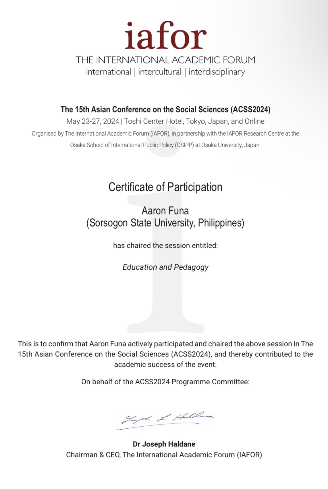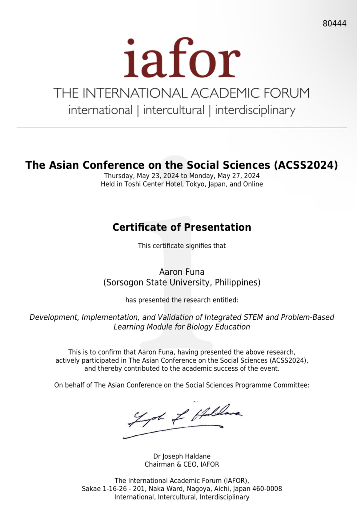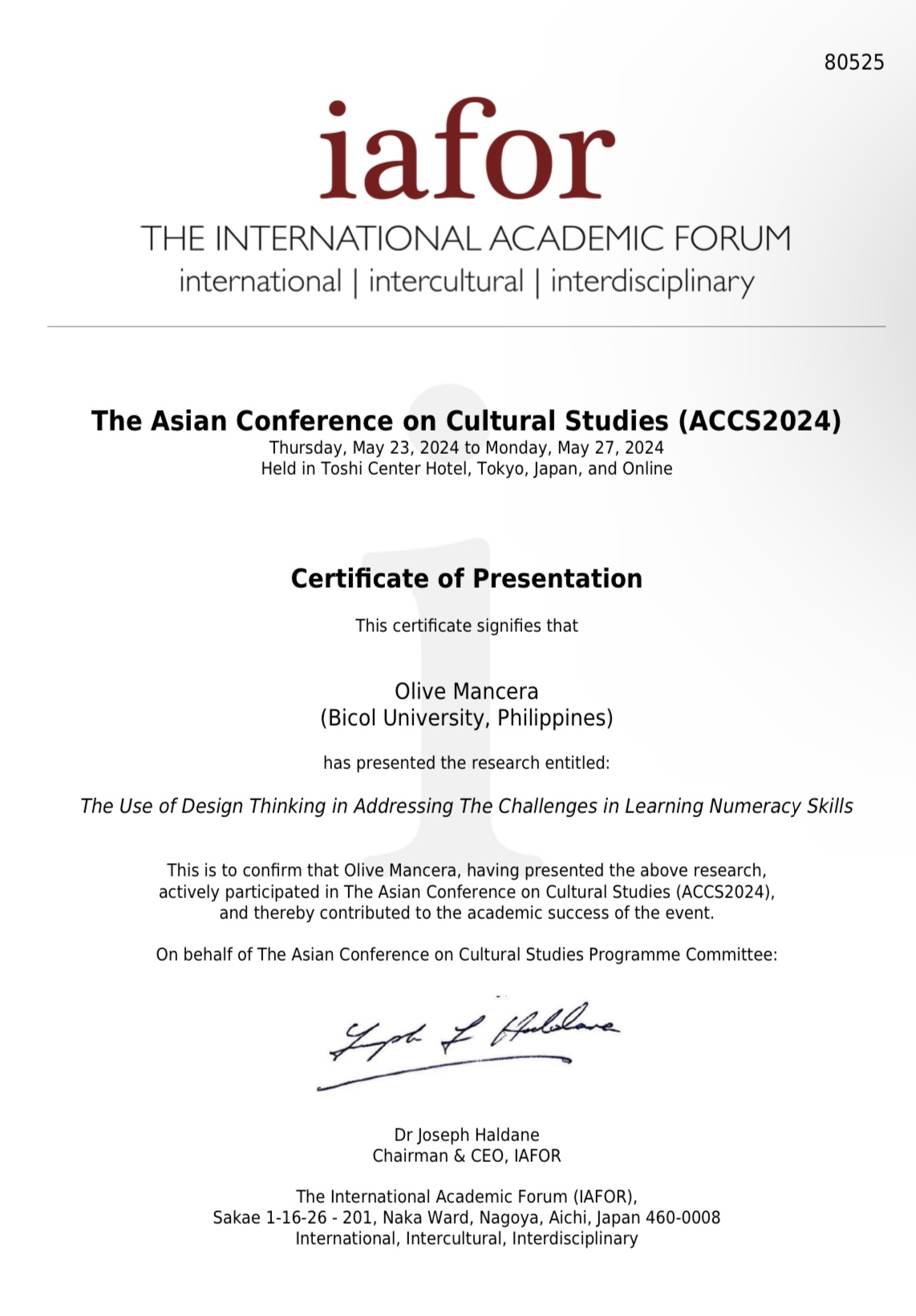 Organized by The International Academic Forum (IAFOR), in partnership with the IAFOR Research Centre of the Osaka School of International Policy (OSSIP) at Osaka University, Sorsogon State University (SorSU) faculty members Dr. Aaron A. Funa (College of Teacher Education and Midwifery) and Dr. Olive N. Mancera (Program Chair, Educ. & Entrep – Magallanes/Faculty, College of Technology) joined the five-day IAFOR – The Forum at the Toshi Center Hotel, Tokyo, Japan, and successfully presented their research papers at the 15th Asian Conference on Social Sciences (ACSS2024) and 15th Asian Conference in Cultural Studies (ACCS2024), respectively, held from May 23-27, 2024.