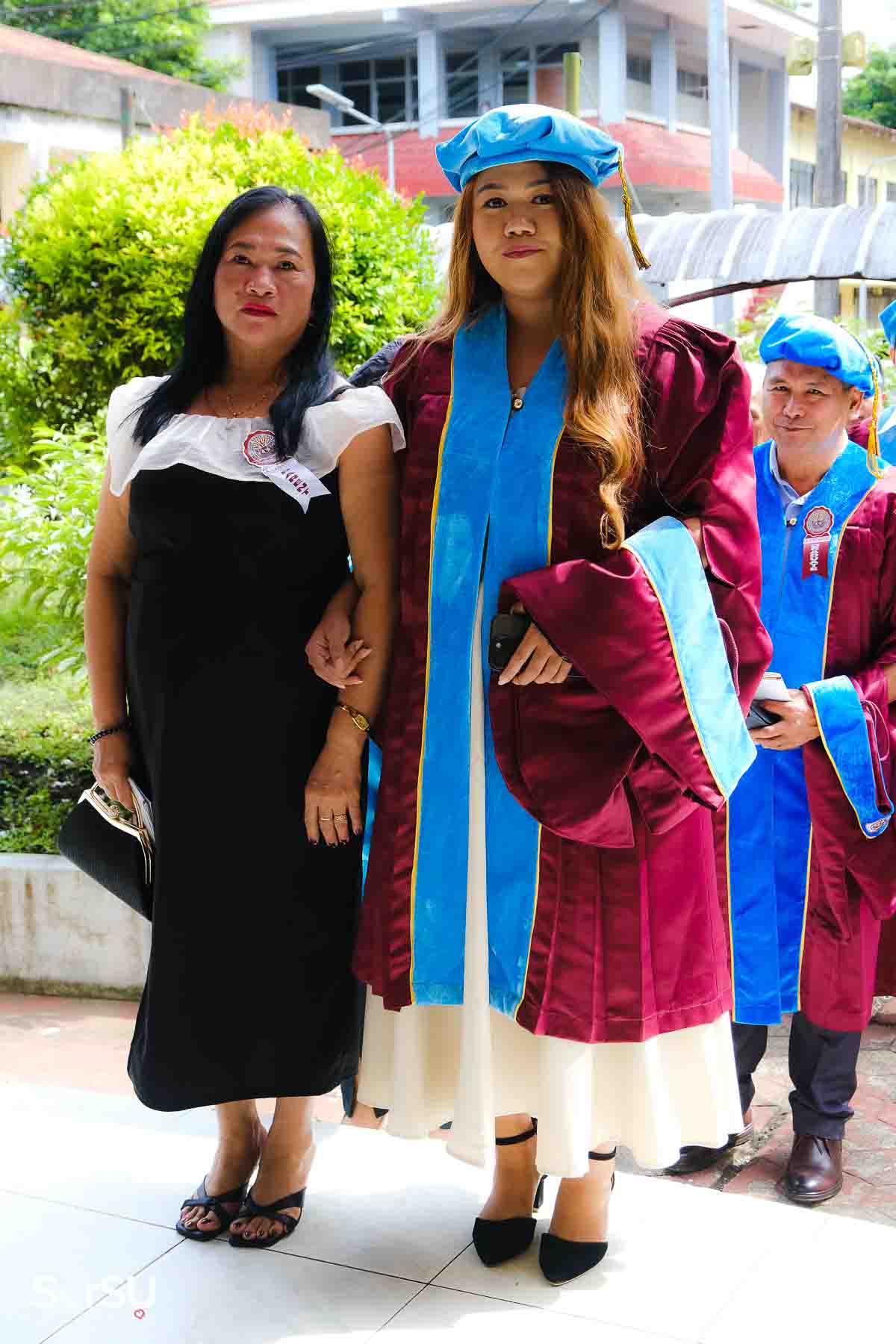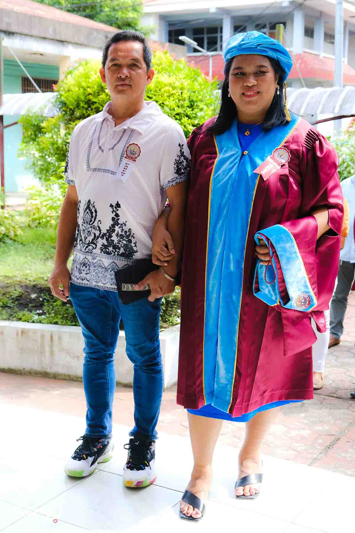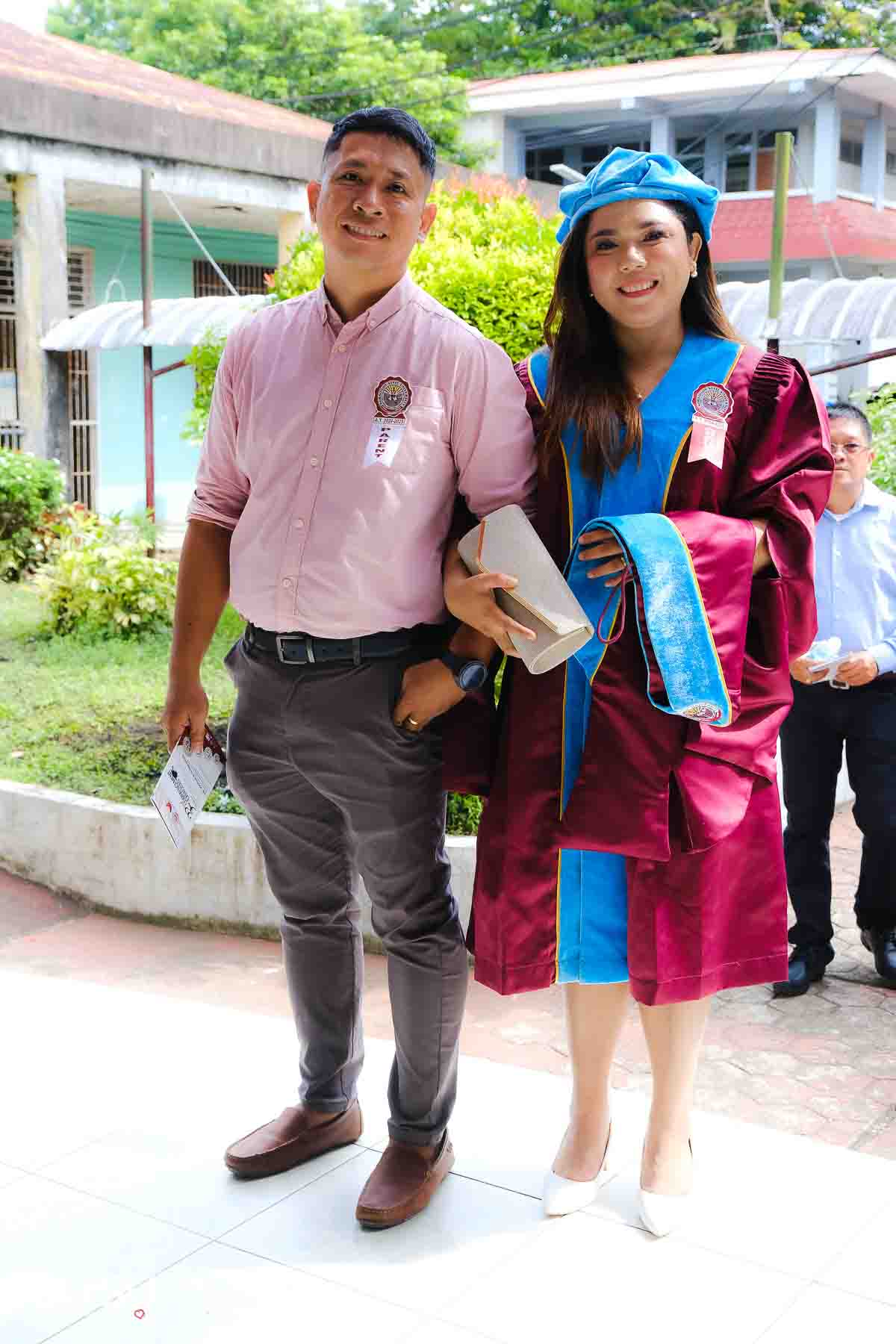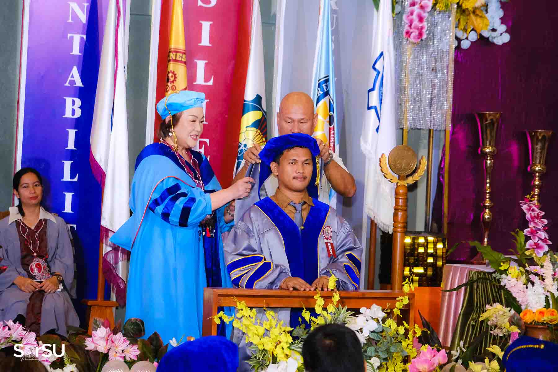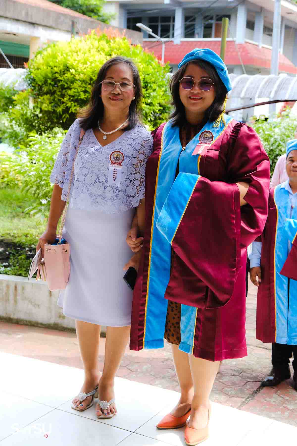 The ceremony opened with the traditional academic processional, followed by the singing of the Philippine National Anthem and a doxology. One of the program’s highlights was the Imposition of Hoods, where parents or spouses placed academic hoods on the candidates, indicating the completion of their graduate programs.