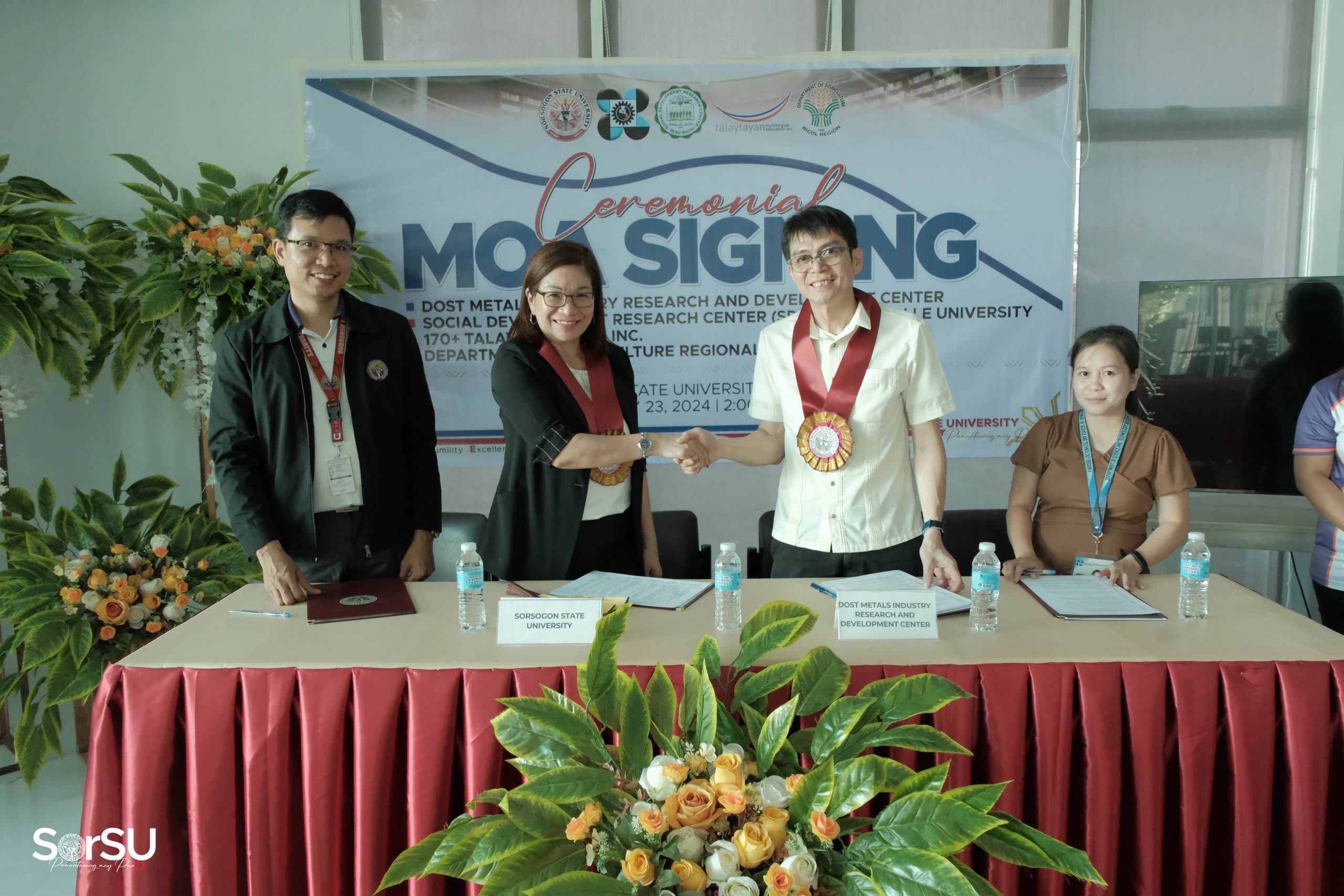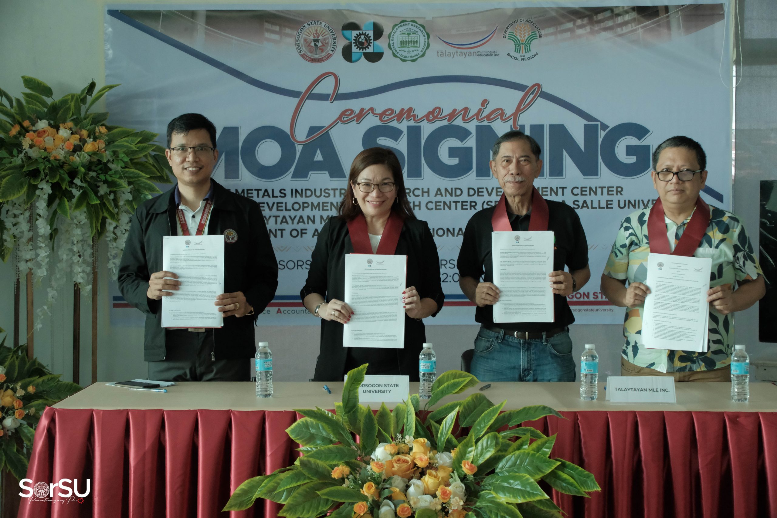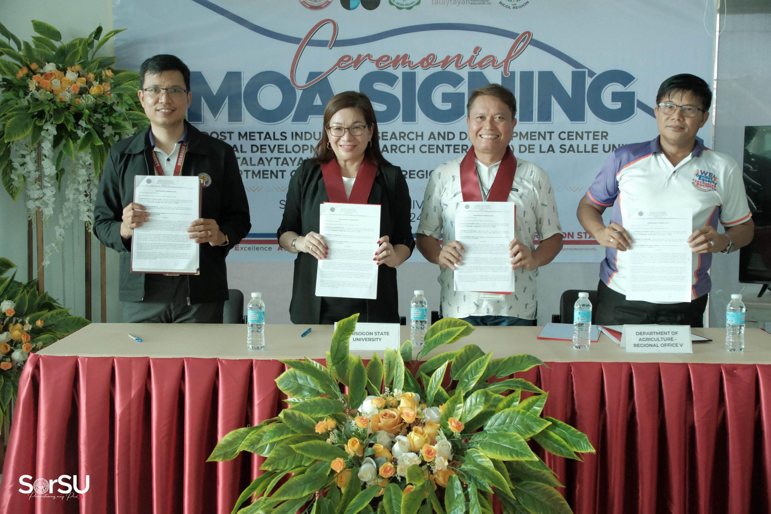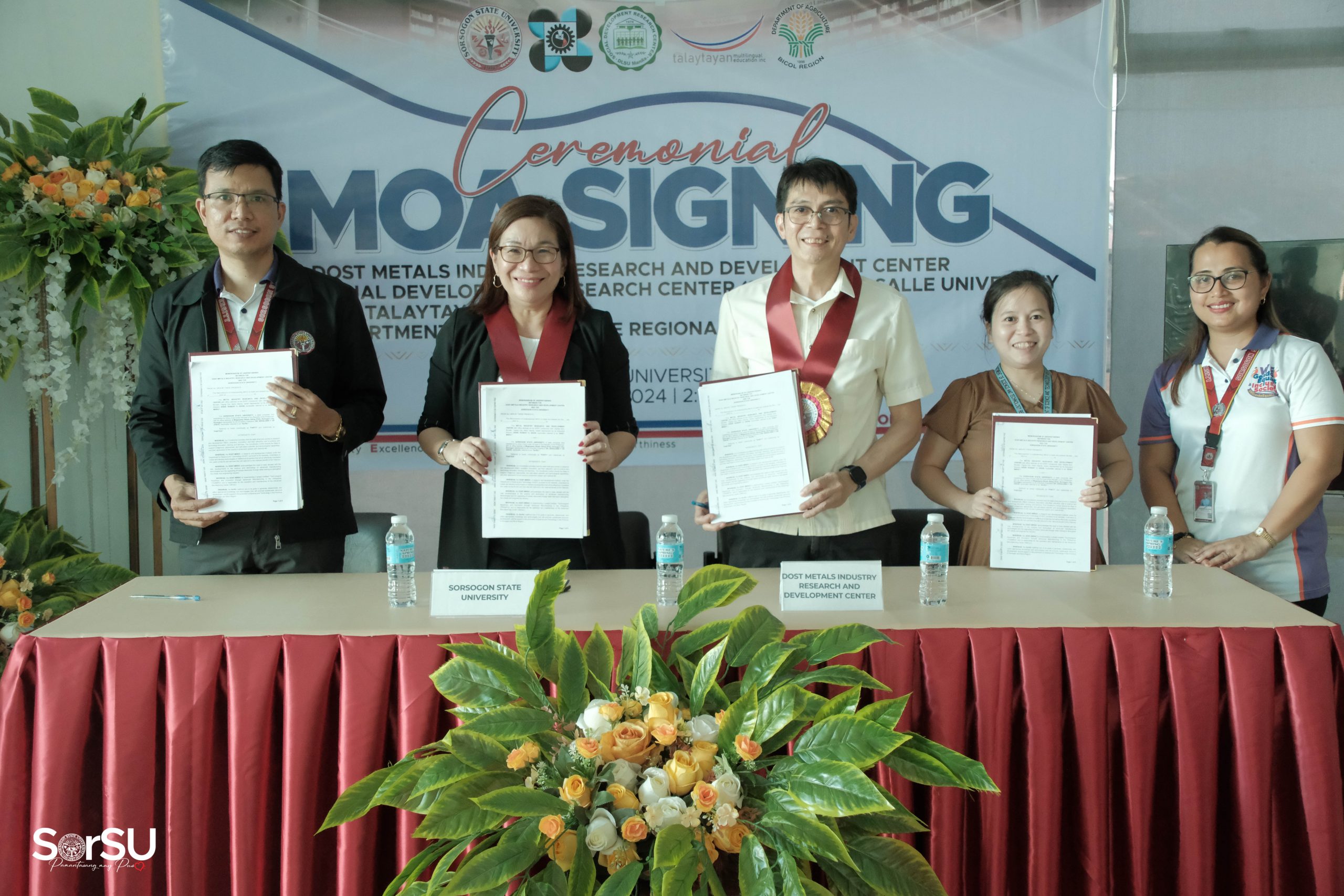 The Sorsogon State University hosted a landmark Memoranda of Agreement (MOA) signing ceremony with DOST Metals Industry Research and Development Center, Talaytayan MLE Inc., and the Department of Agriculture Regional Office V on May 23, 2024 at the SorSU E-Library.