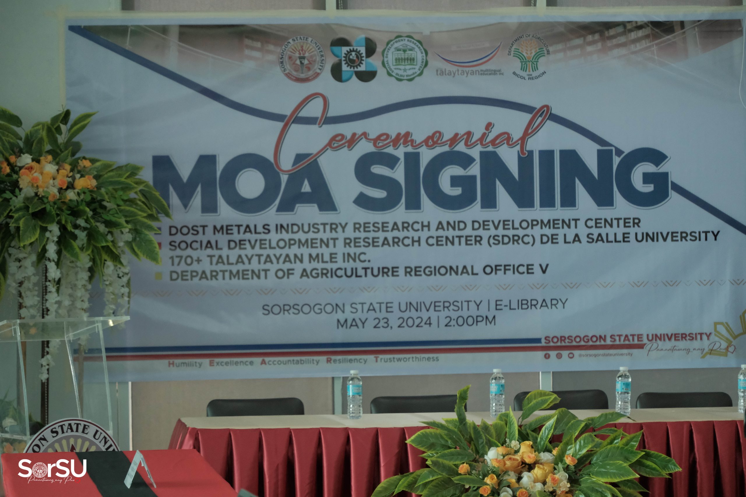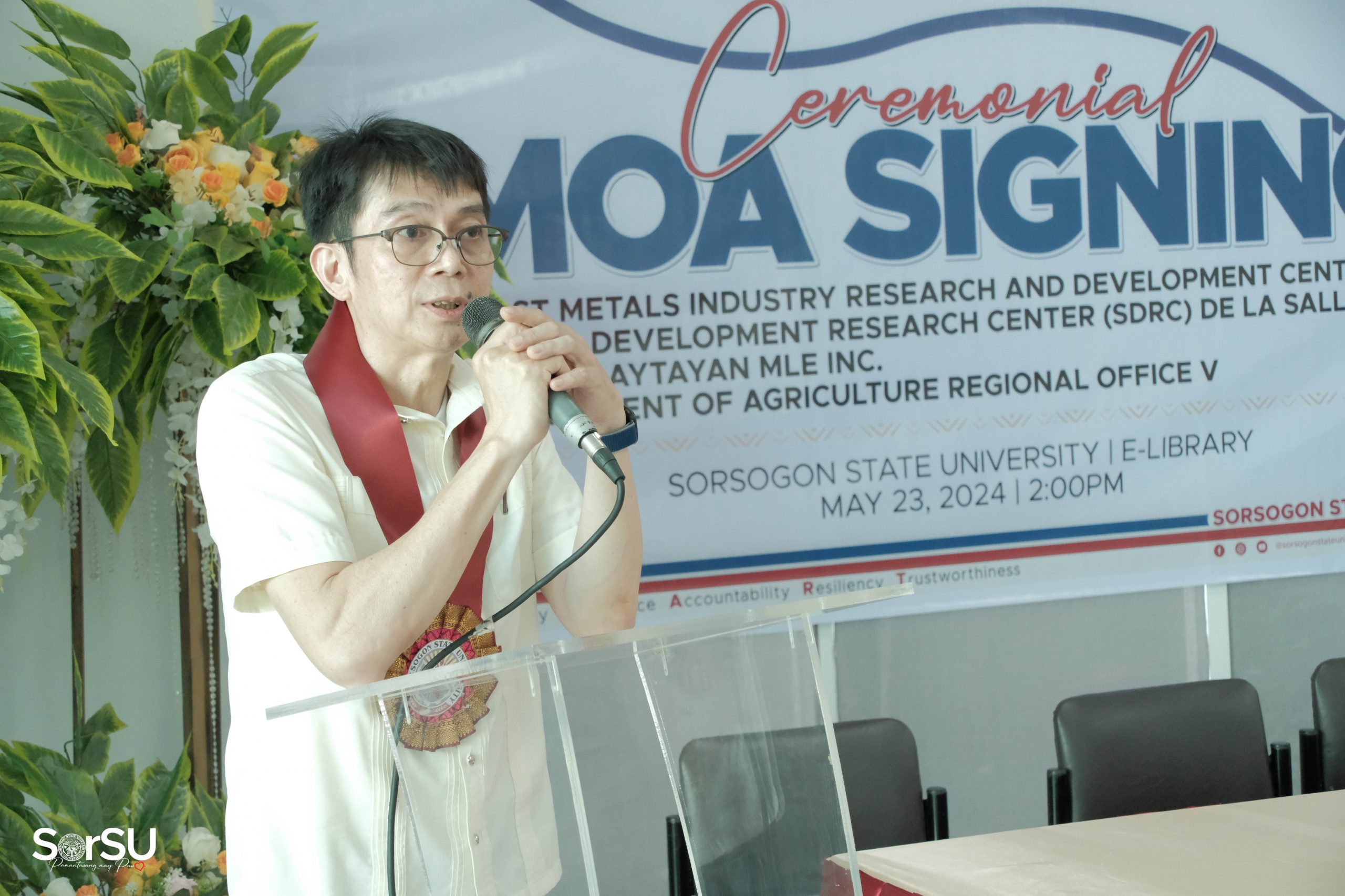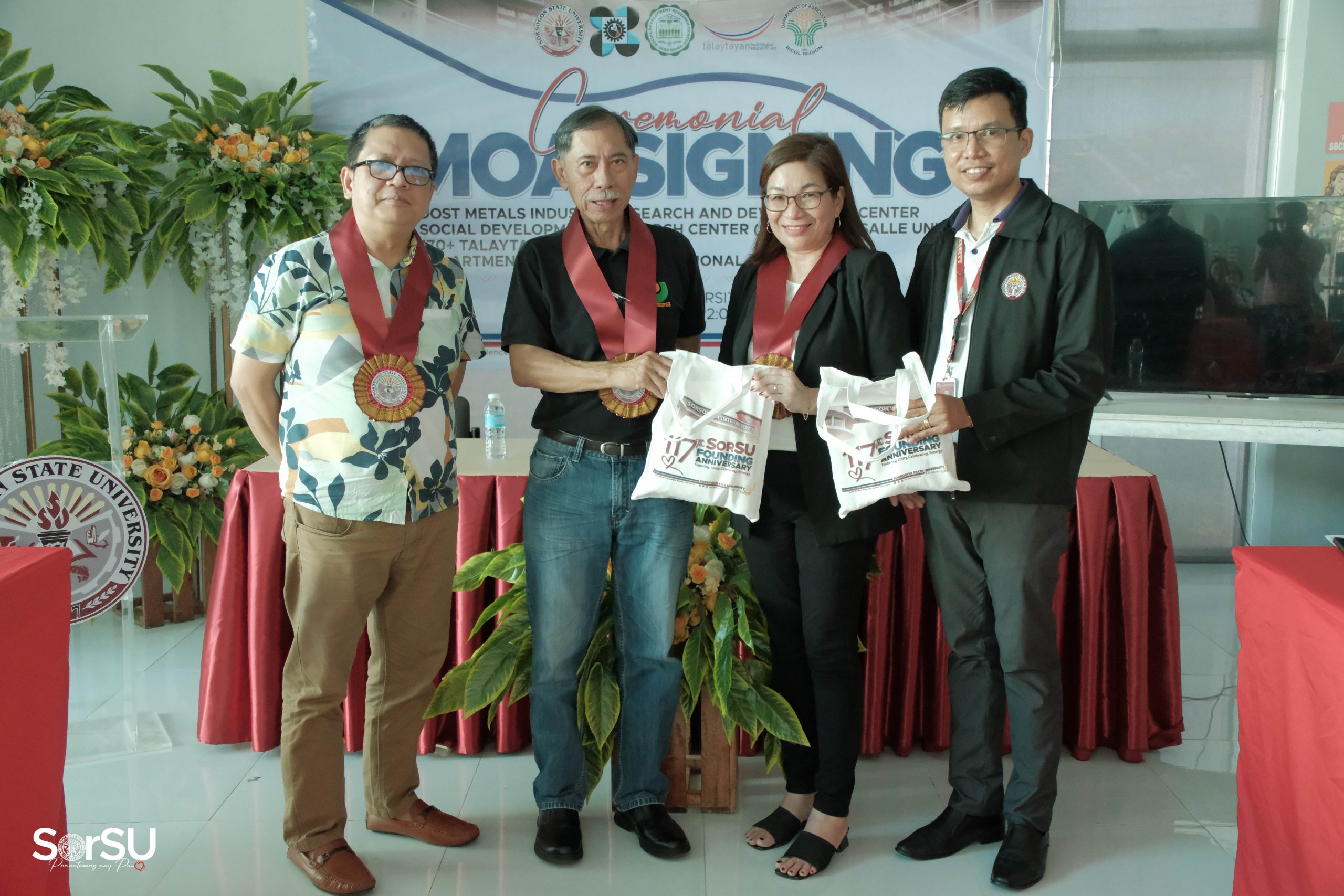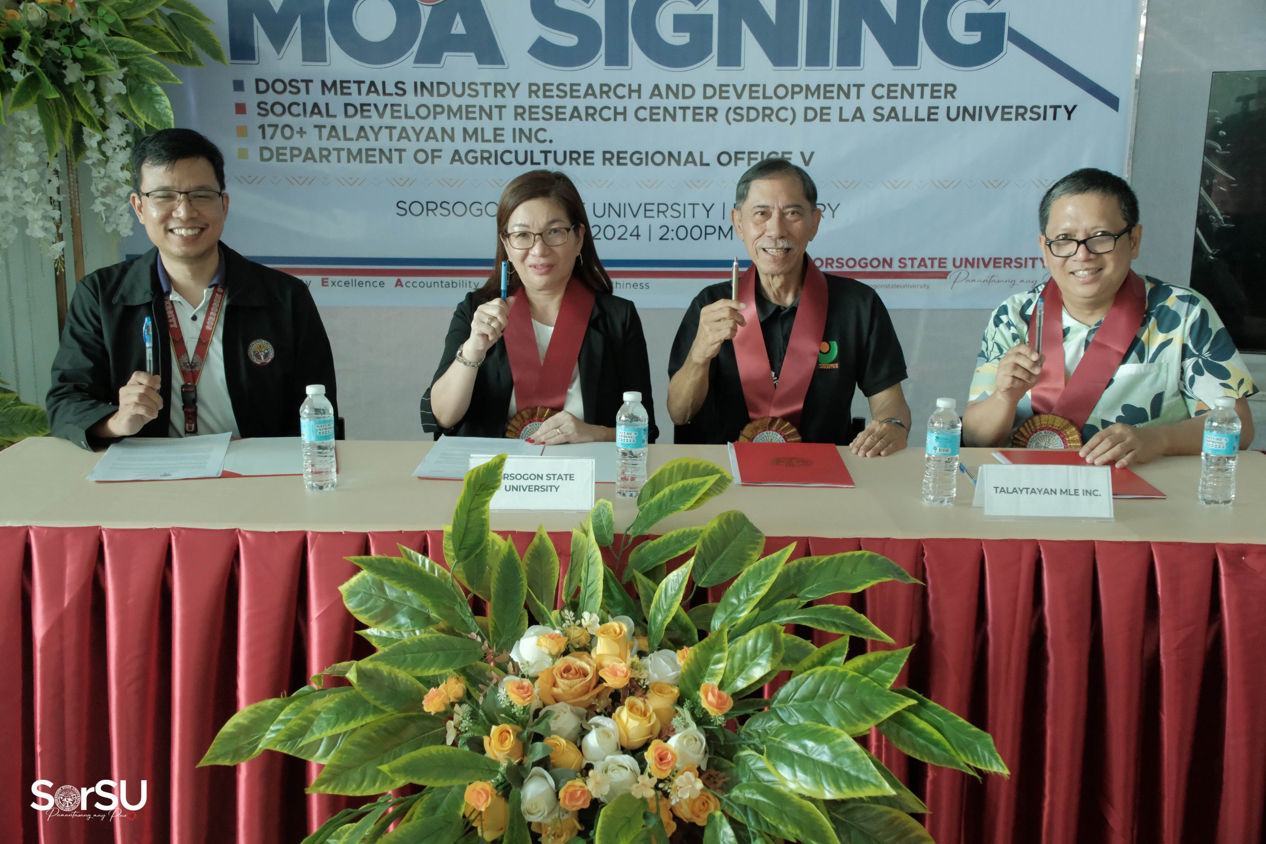 The Sorsogon State University hosted a landmark Memoranda of Agreement (MOA) signing ceremony with DOST Metals Industry Research and Development Center, Talaytayan MLE Inc., and the Department of Agriculture Regional Office V on May 23, 2024 at the SorSU E-Library.