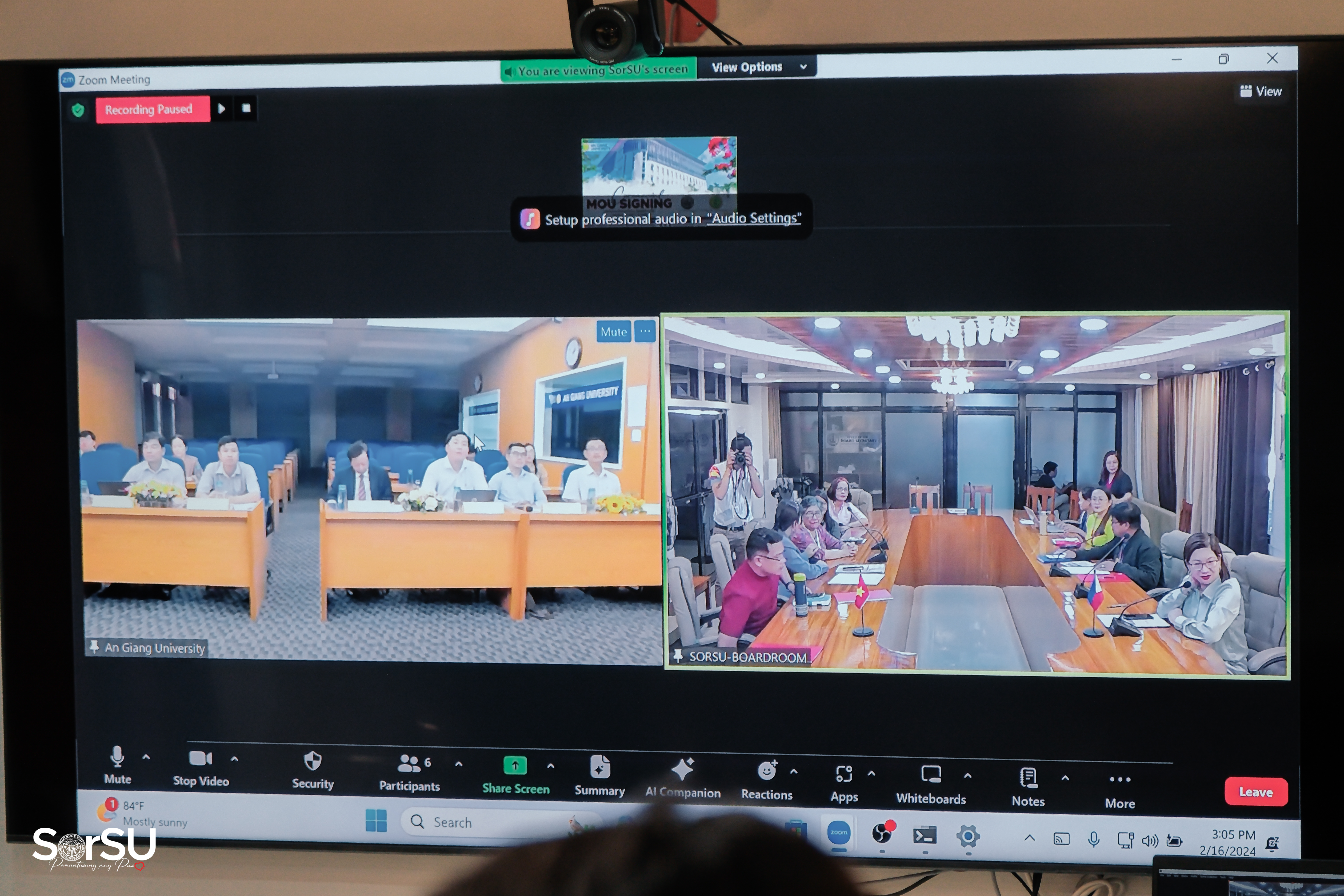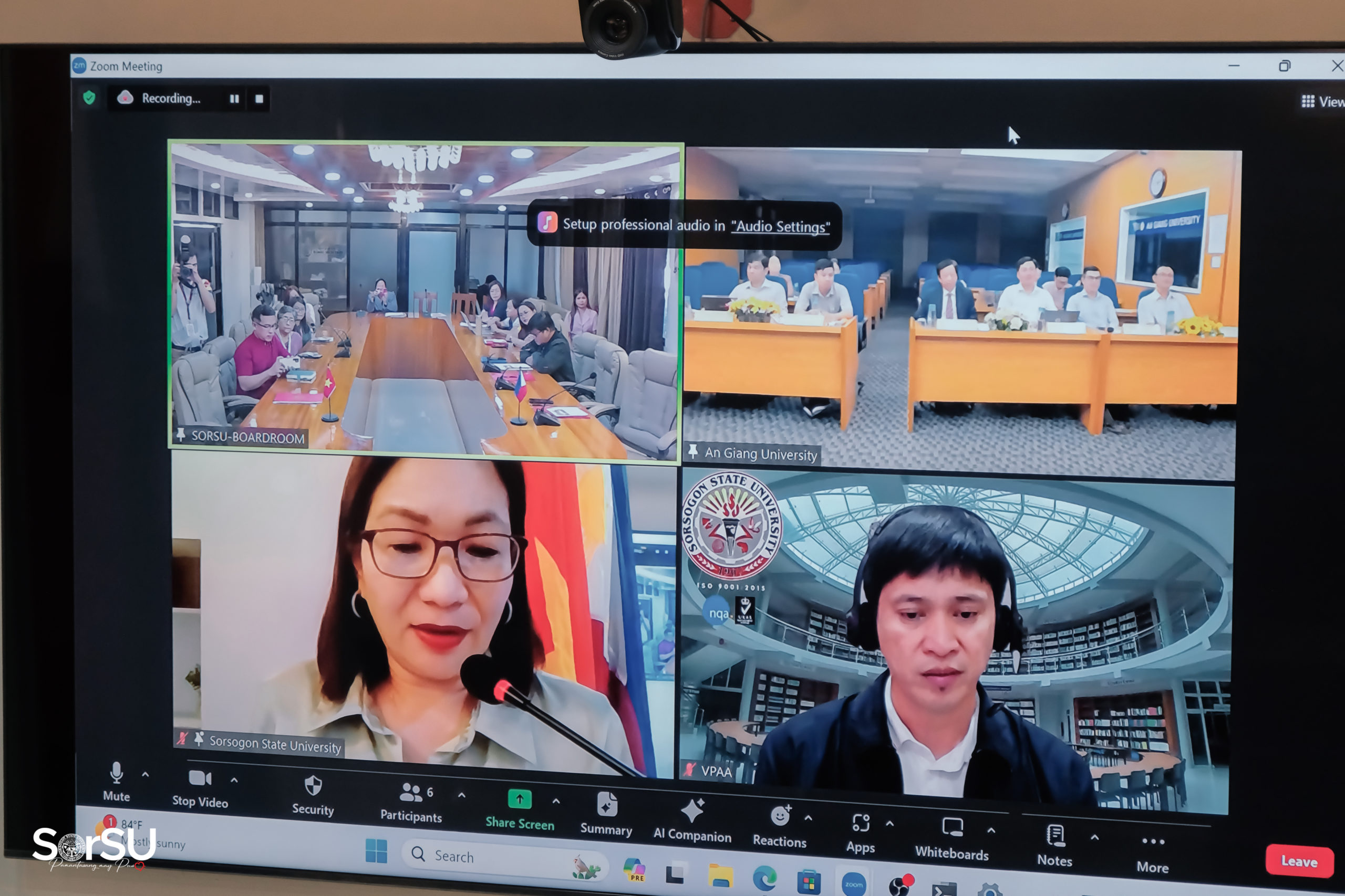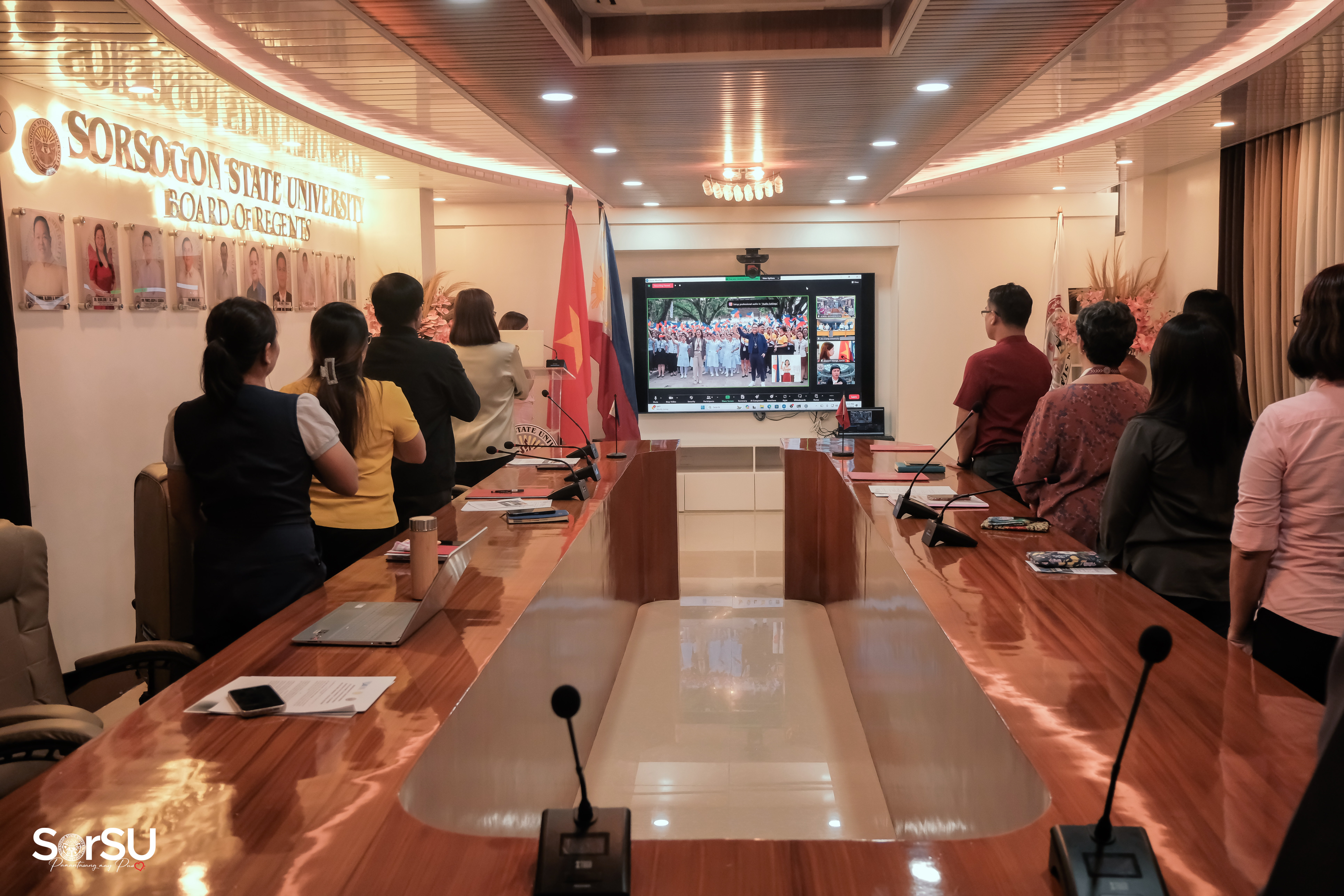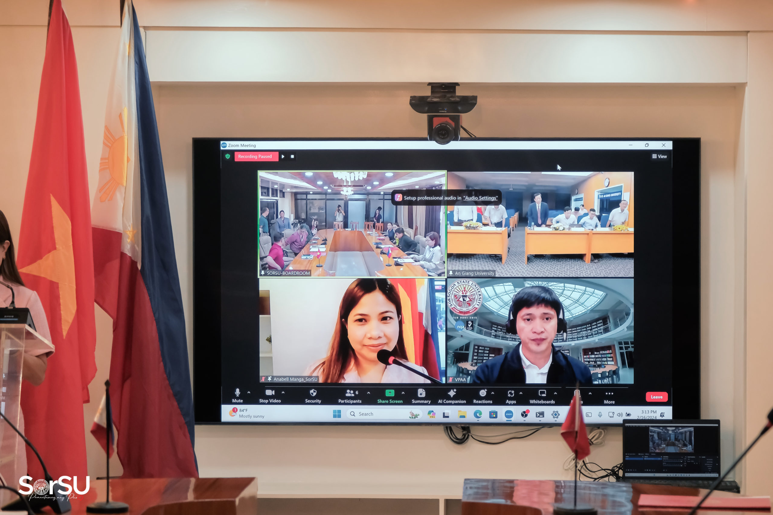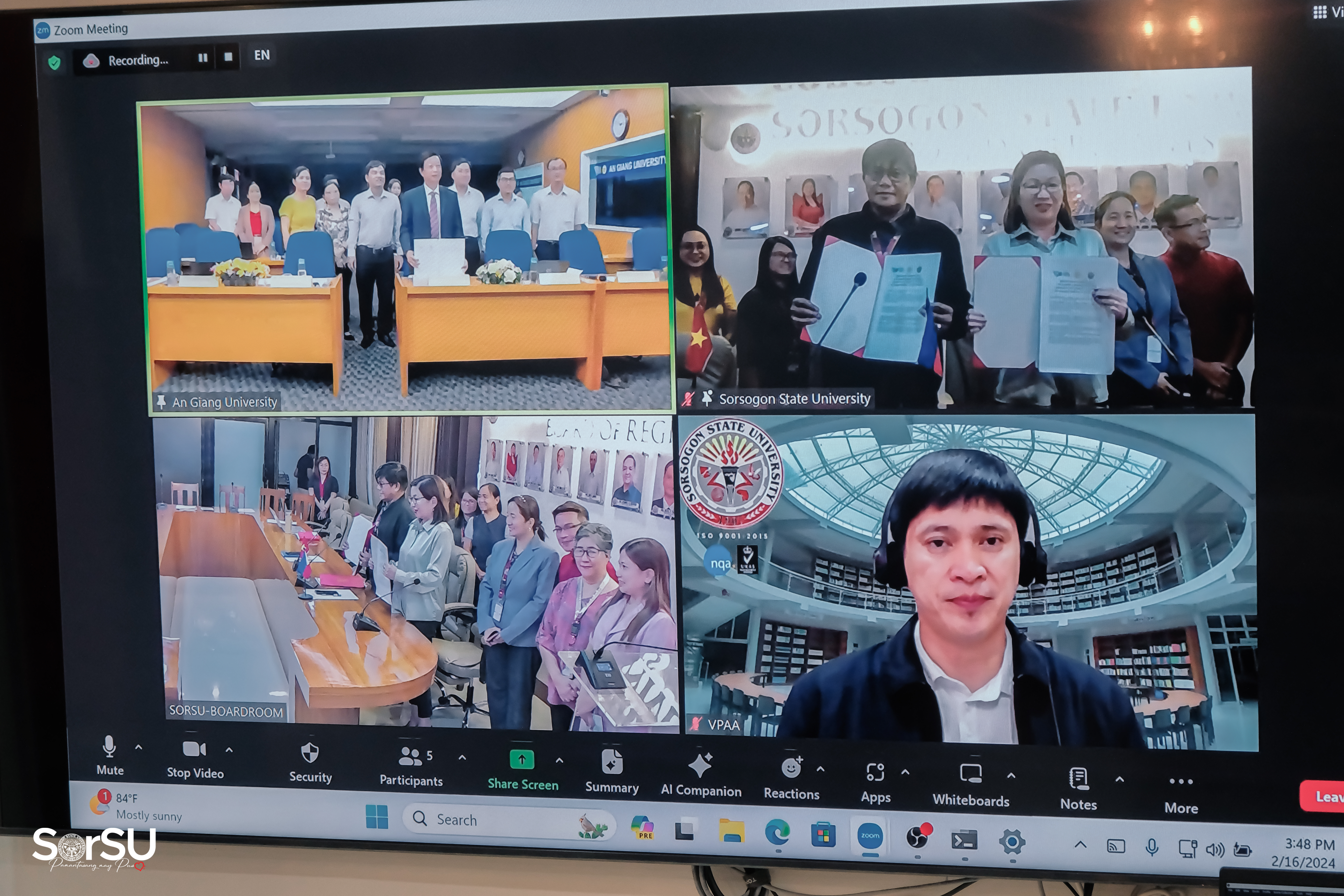 In active pursuit of the University’s internationalization goals of higher education to be at par with the global academic ranking, a virtual ceremonial signing of a Memorandum of Understanding between Sorsogon State University (SorSU) and An Giang University (AGU, VNU-HCM), Vietnam, was held today February 16, 2024, via Zoom Meeting, which formally signified their international academic cooperation on the promotion of faculty and student developments, including the internationalization of SorSU’s Bachelor of Secondary Education – Major in English (BSED-English) program under the College of Teacher Education (CoTEd), and other academic activities between the two institutions.