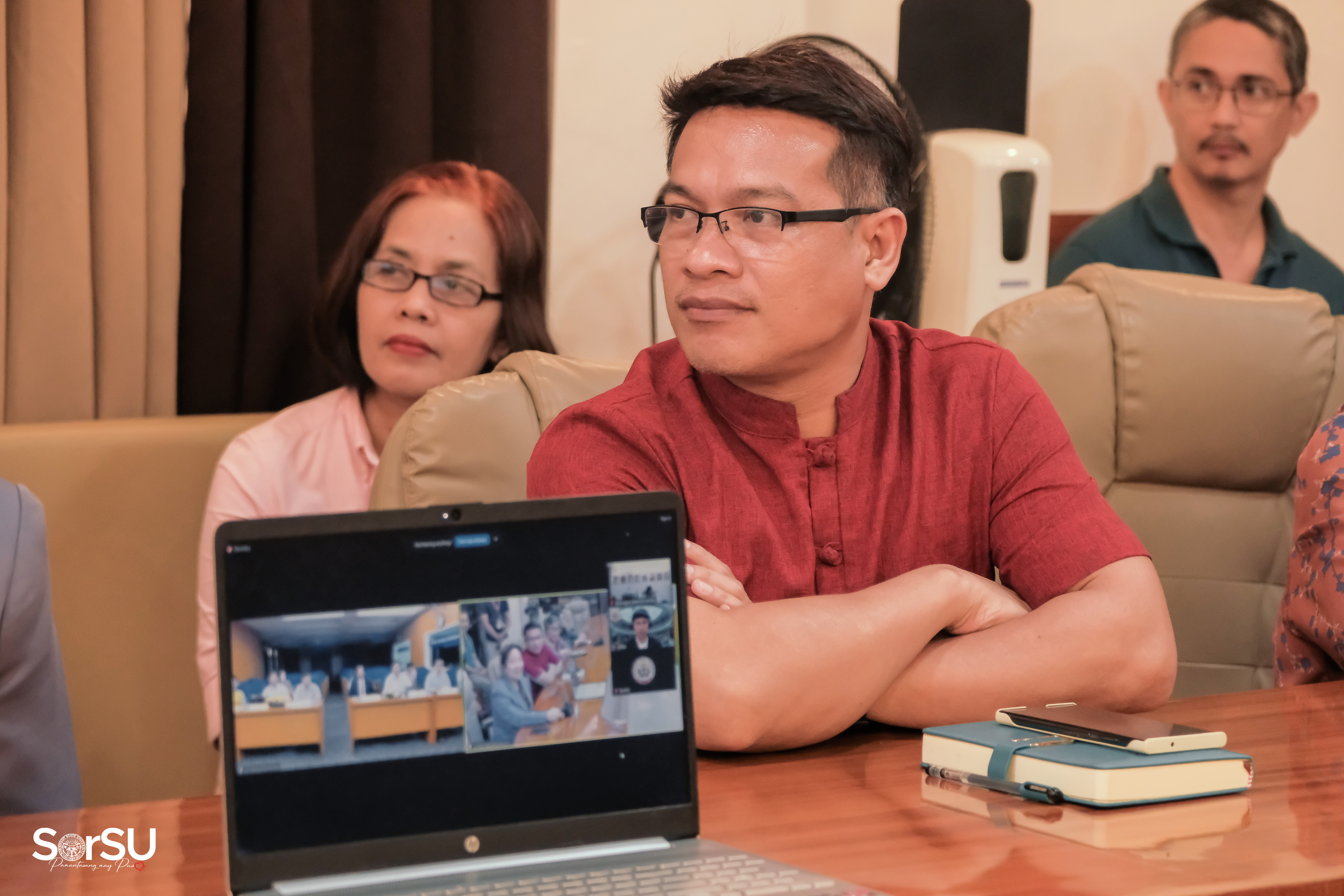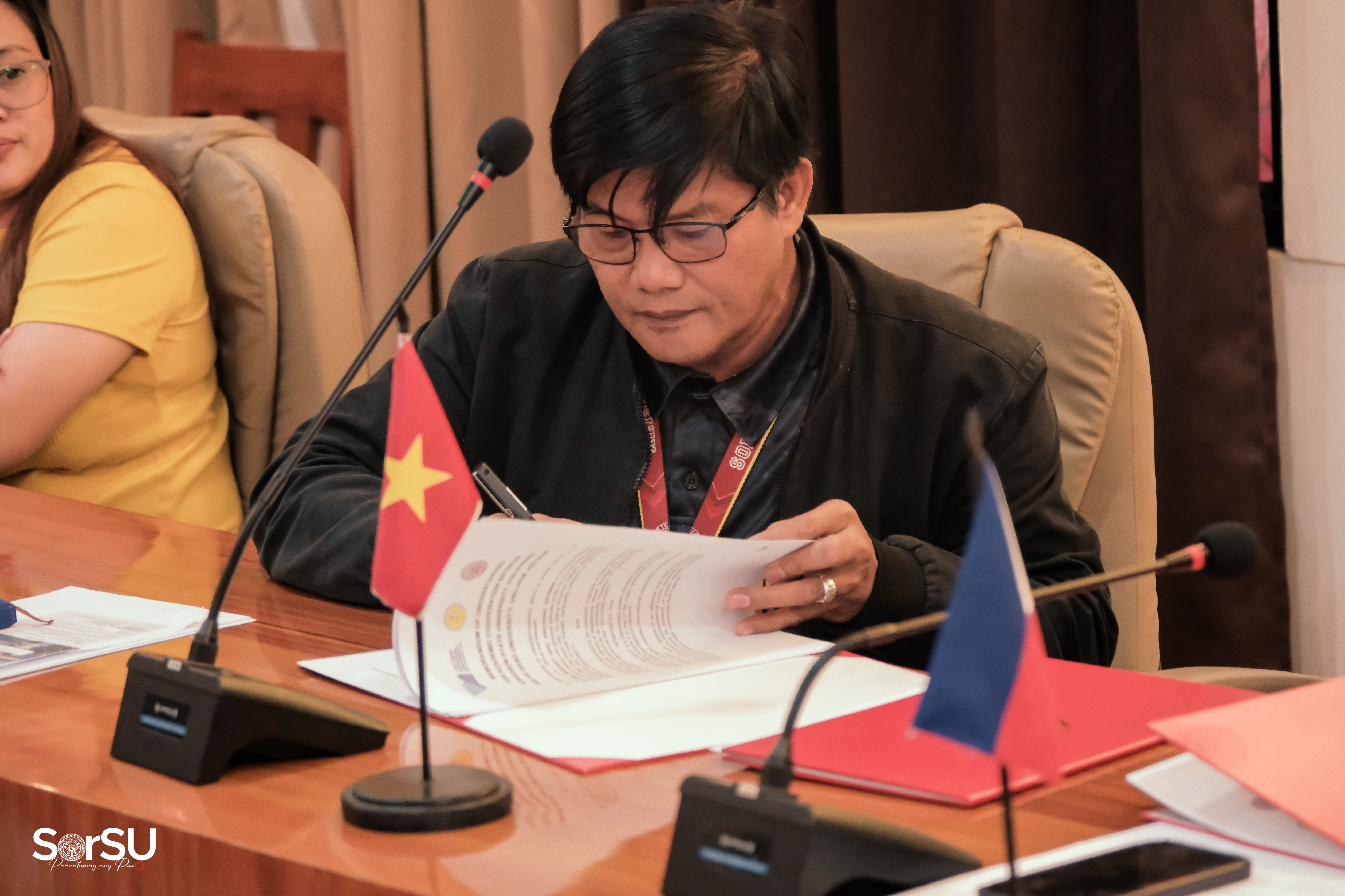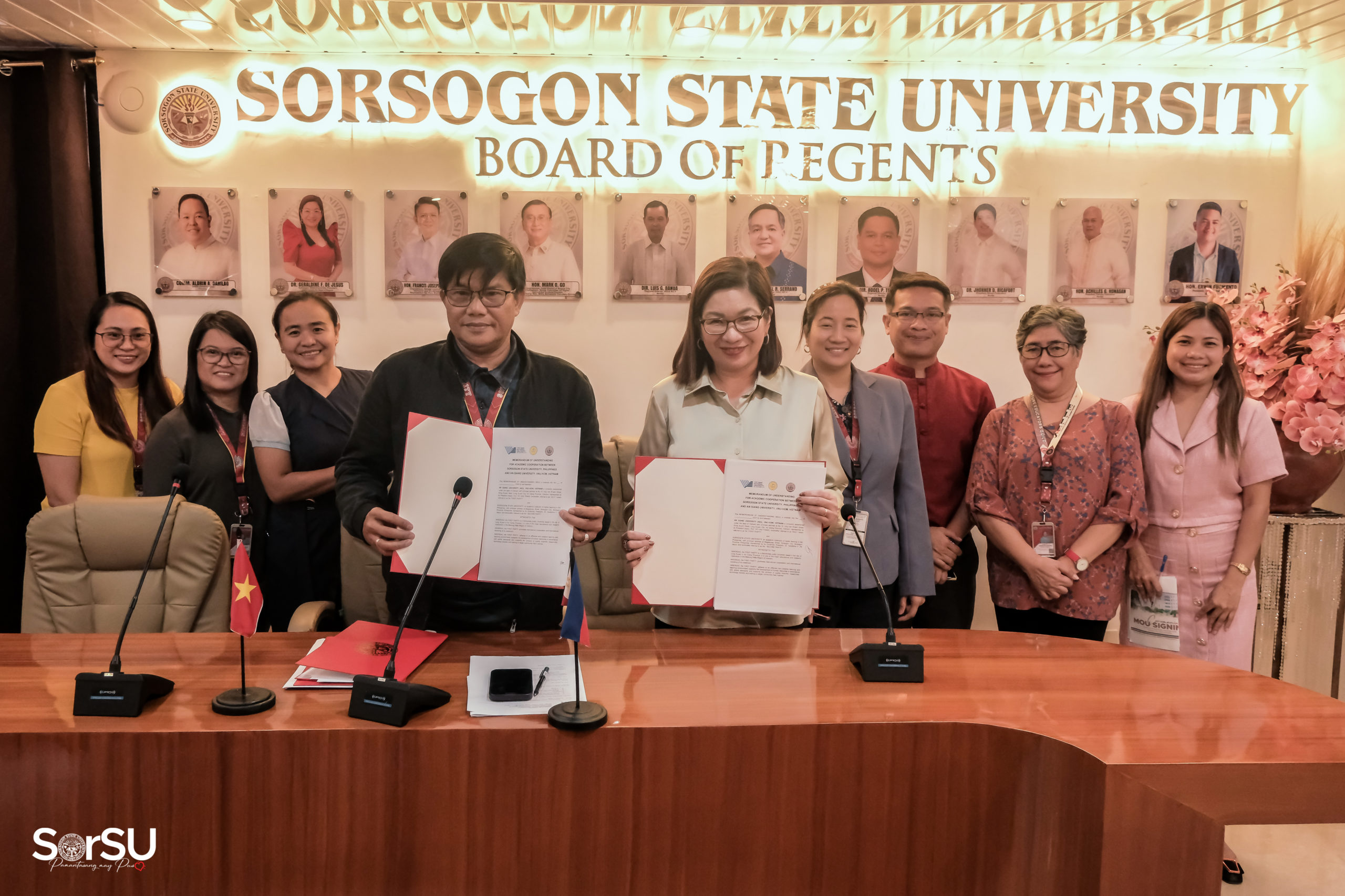 SUC President III, Dr. Geraldine F. De Jesus, represented Sorsogon State University, while Assoc. Prof. Vo Van Thang represented An Giang University, VNU-HCM, Vietnam, alongside AGU officials. In attendance also at the SorSU Boardroom during the ceremony were Dr. Vivien L. Chua (Director, IRO); Dr. Alfonso L. Garcia, Jr. (Dean, College of Teacher Education); CoTEd Program Chairs: Prof. Anabell A. Manga (Program Chair, BSED & CoTEd Student Internship Coordinator), Prof. Jackielyne M. Bosquillos (Program Chair, BEED/BSNED), Prof. Susan Mae A. Jamoralin (Program Chair, BPED/BCAED); CoTEd faculty members: Prof. Marigrace D. Carretero & Prof. Maritess D. Carreon; Dr. Michael John A. Jamora (Executive Assistant); Ms. Caryl L. Gamis (IRO Staff); and other SorSU officials & personnel.