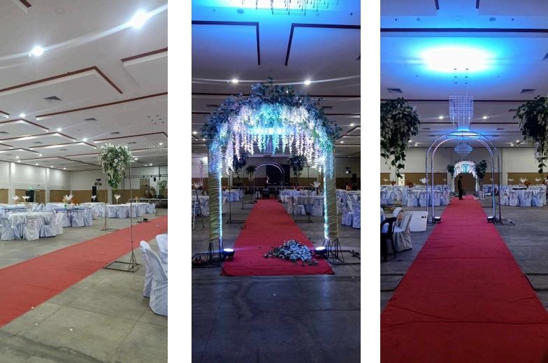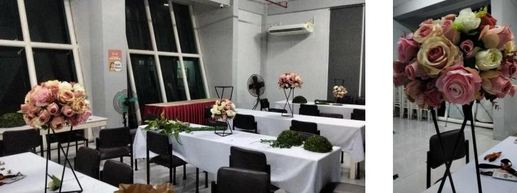 After finishing the decorations at the SorSU Audio Visual Hall, Carl Ducta and Shaquille Jeresano were tasked with designing the dining venue for the SorSU Laboratory Faculties, located in the SorSU E-Library. They set up the centerpieces for the tables, which included flower arrangements, and decorated the poles to align with the venue’s theme.