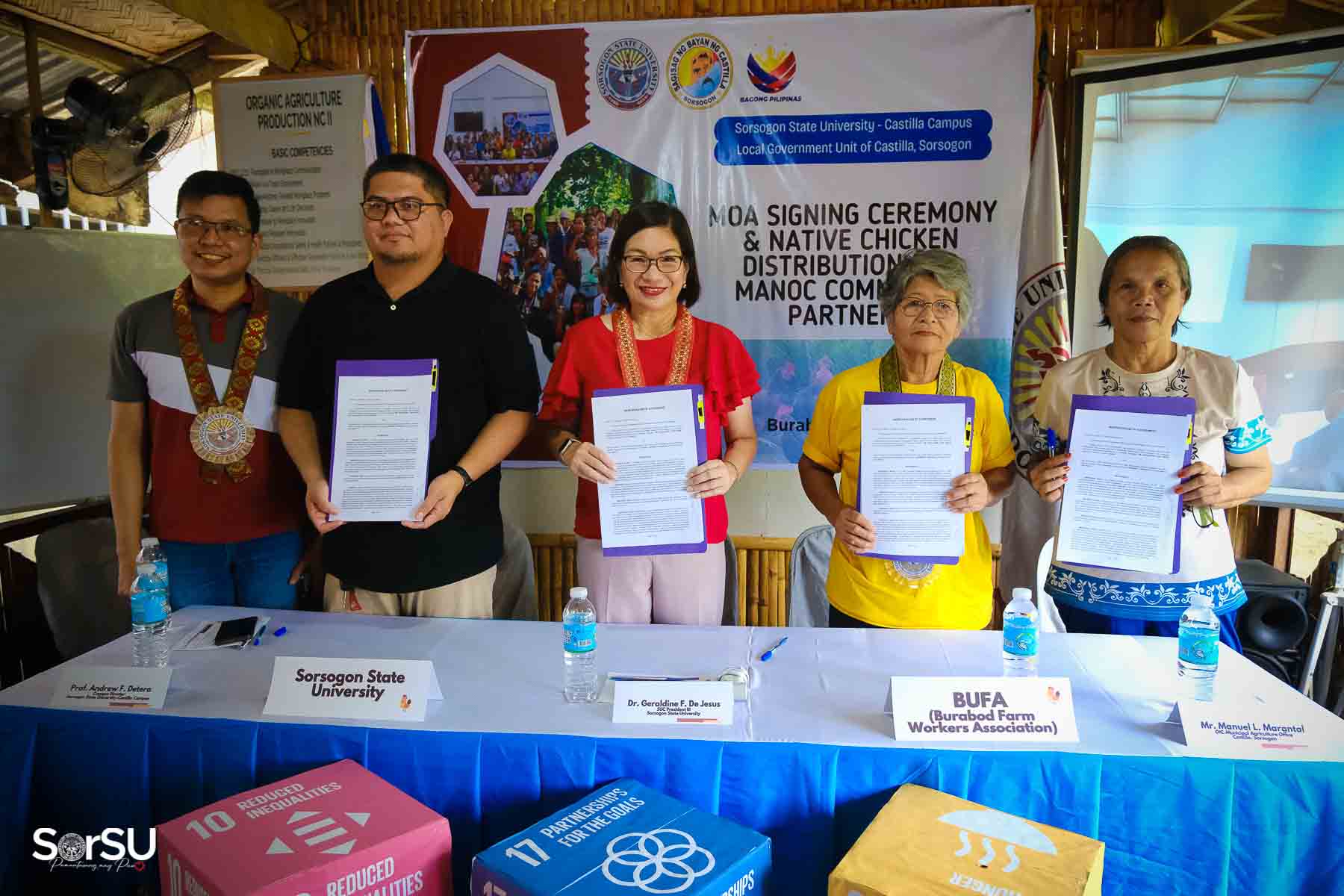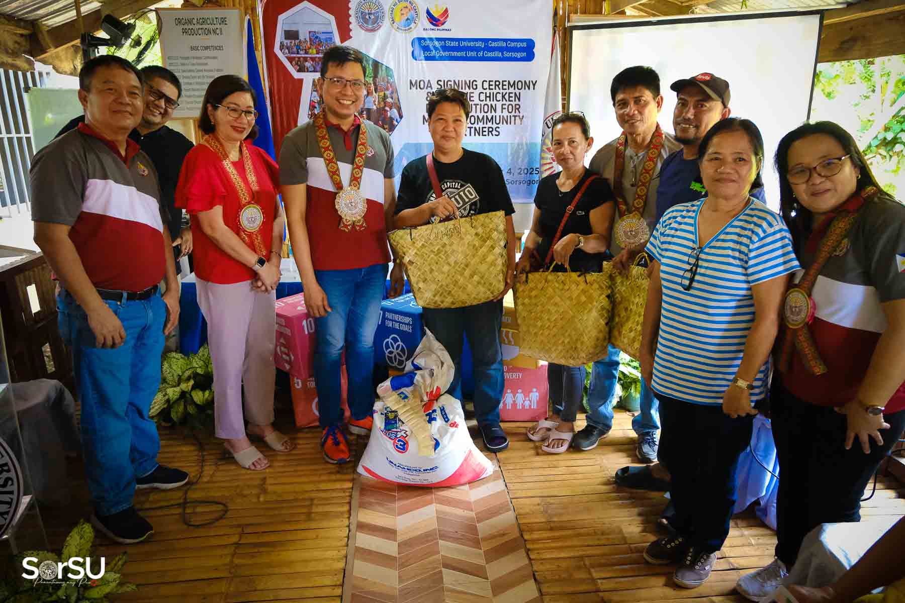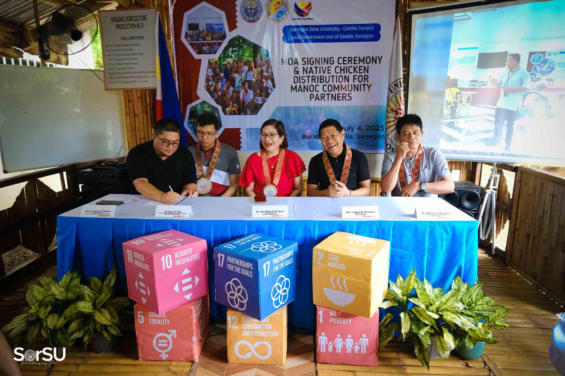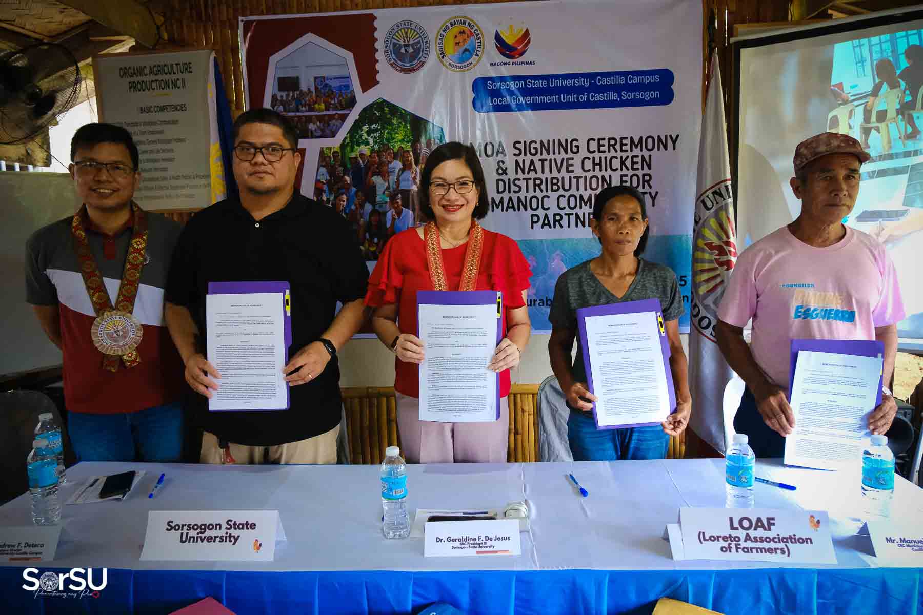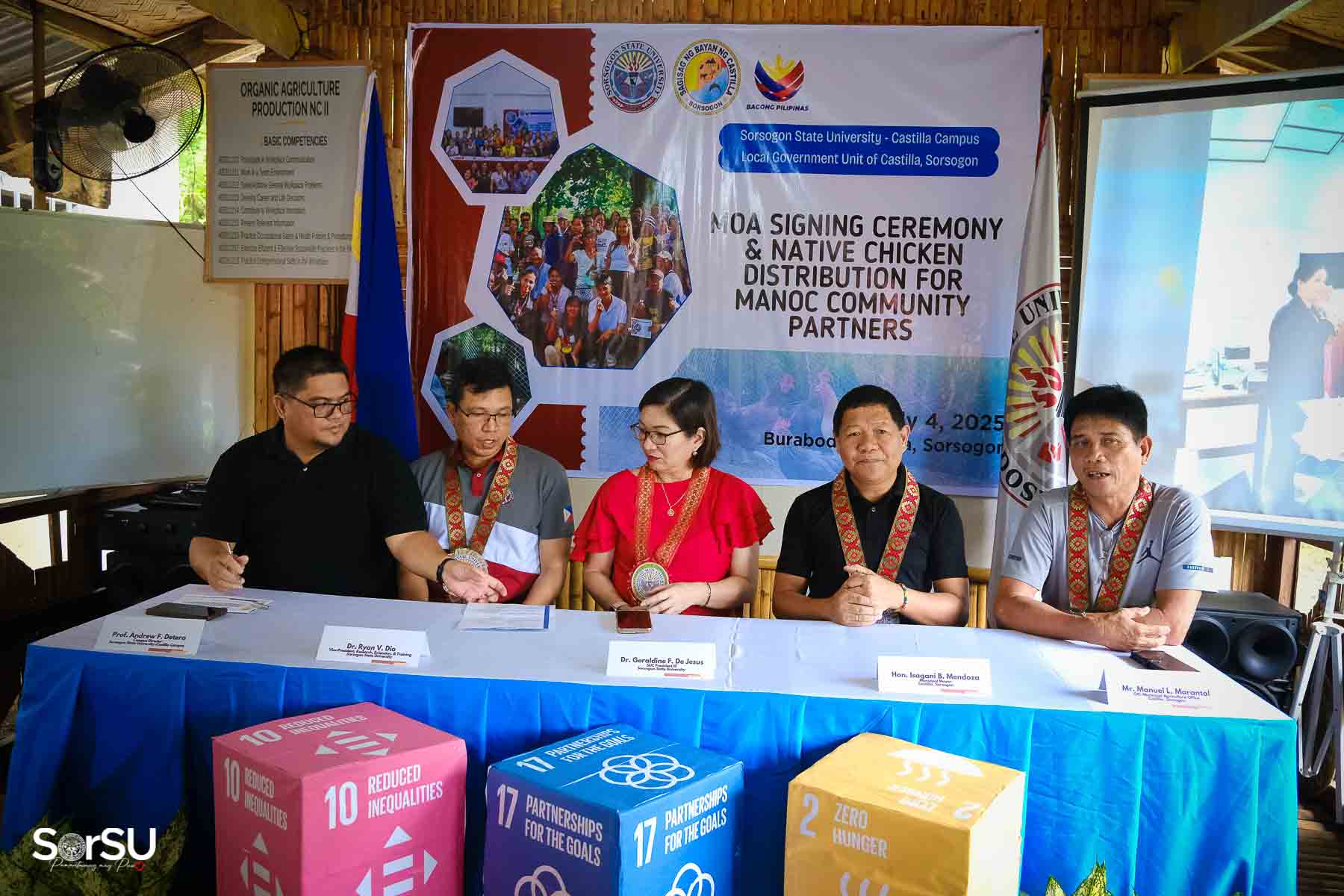 On July 4, 2025, Sorsogon State University (SorSU) reaffirmed its commitment to sustainable development through the ceremonial signing of a Memorandum of Agreement (MOA) with the Local Government Unit (LGU) of Castilla and MANoC Community Partners. The event, held at Burabod, Castilla, Sorsogon, also included the distribution of native chickens to MANoC Community Partners to help create new livelihood opportunities.