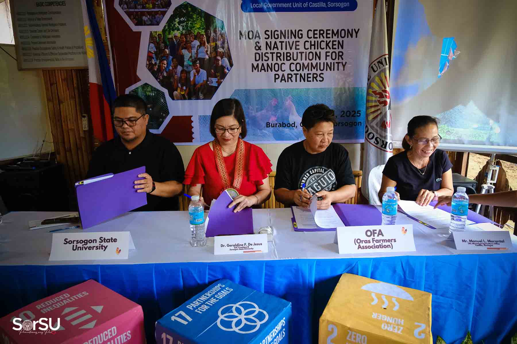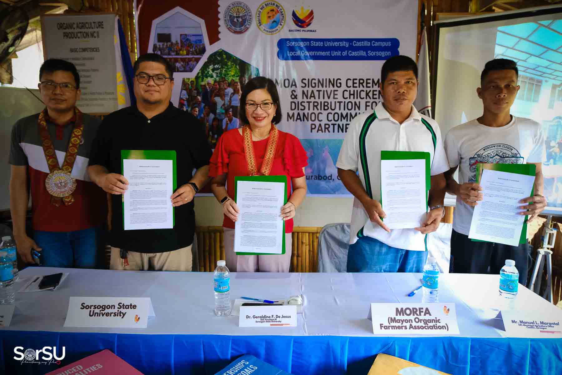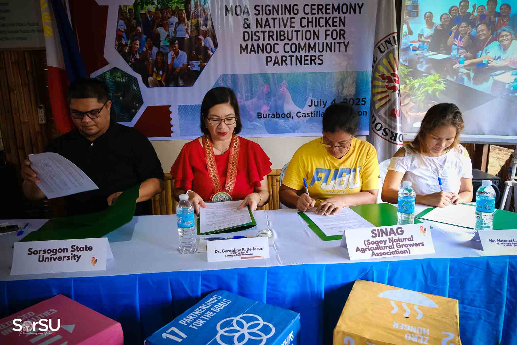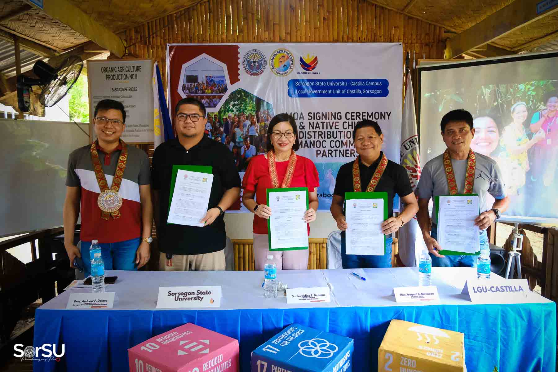 On July 4, 2025, Sorsogon State University (SorSU) reaffirmed its commitment to sustainable development through the ceremonial signing of a Memorandum of Agreement (MOA) with the Local Government Unit (LGU) of Castilla and MANoC Community Partners. The event, held at Burabod, Castilla, Sorsogon, also included the distribution of native chickens to MANoC Community Partners to help create new livelihood opportunities.