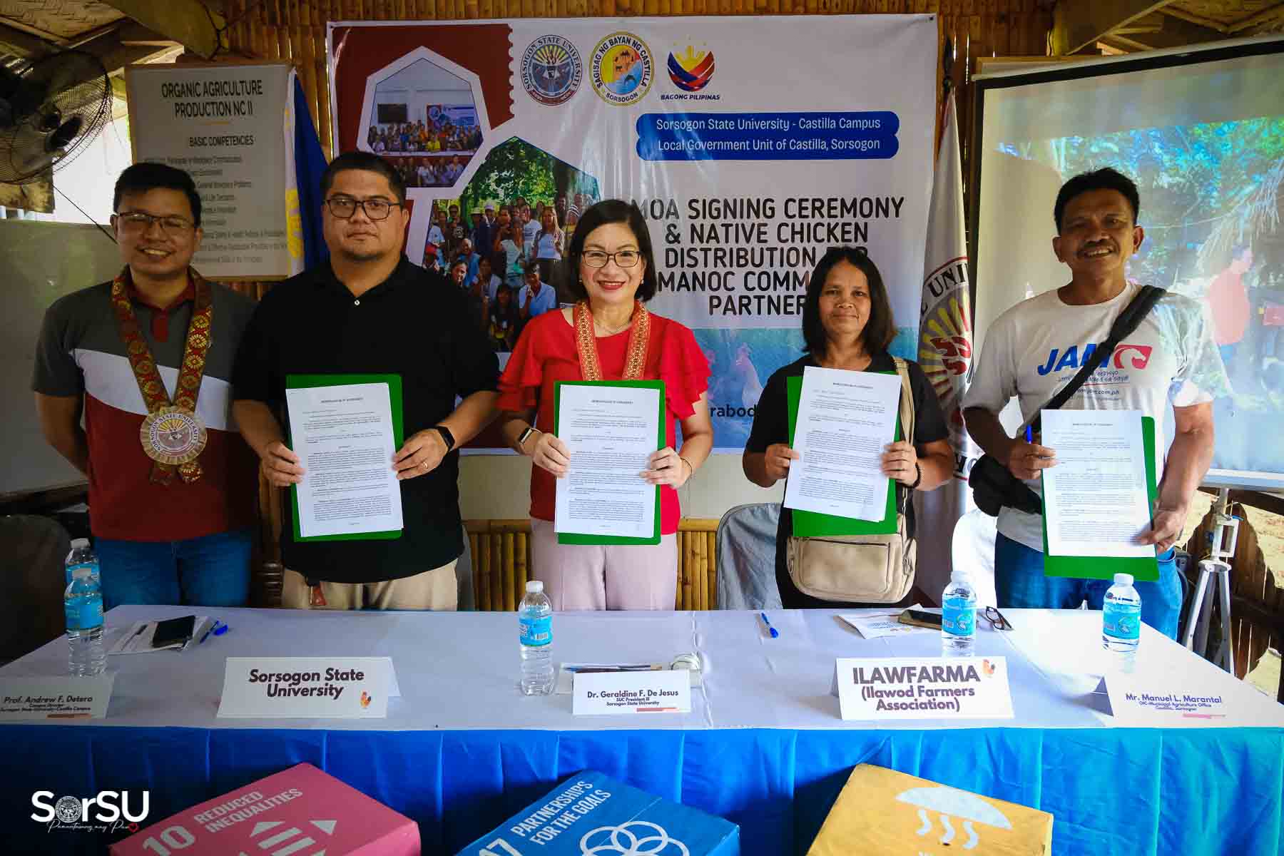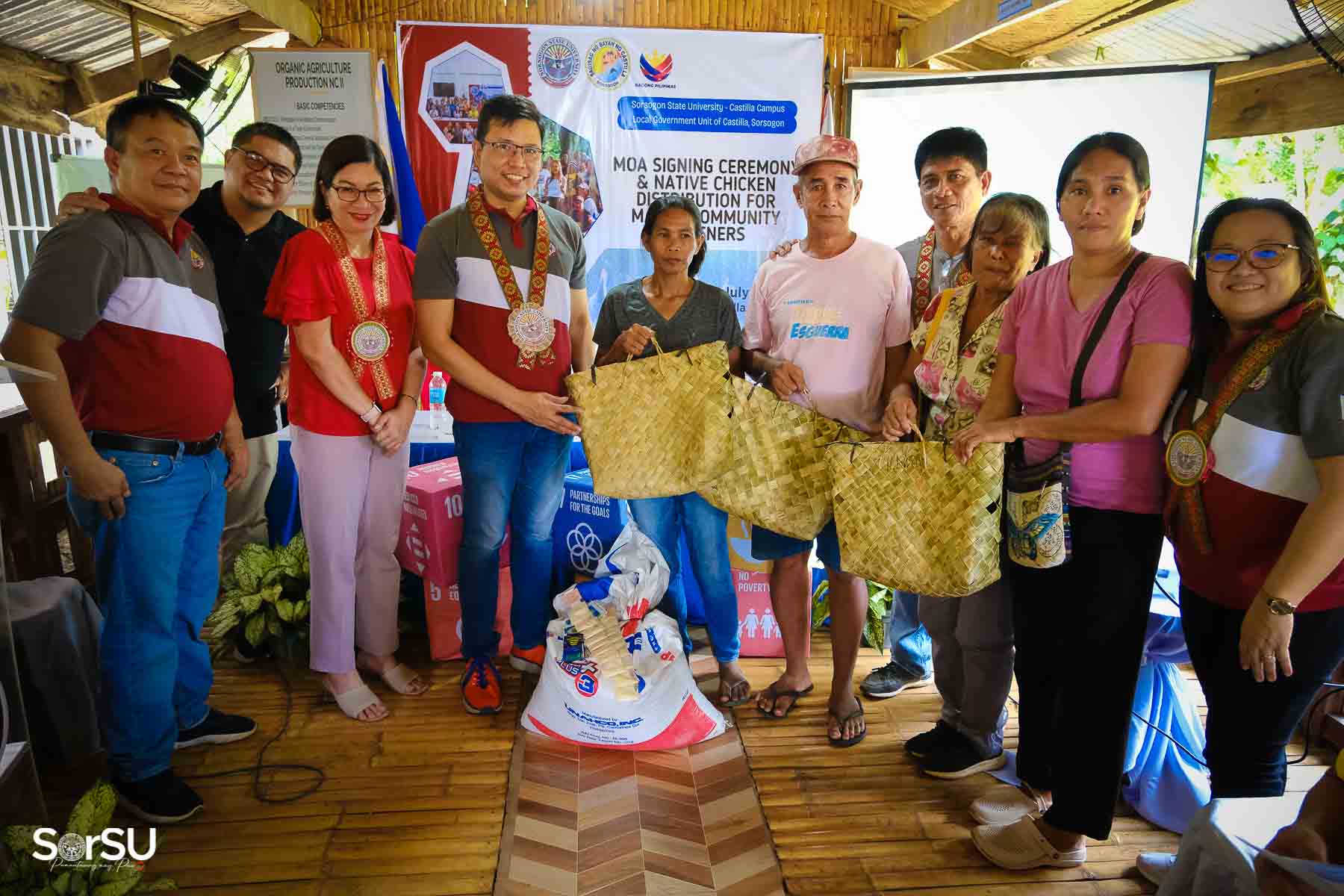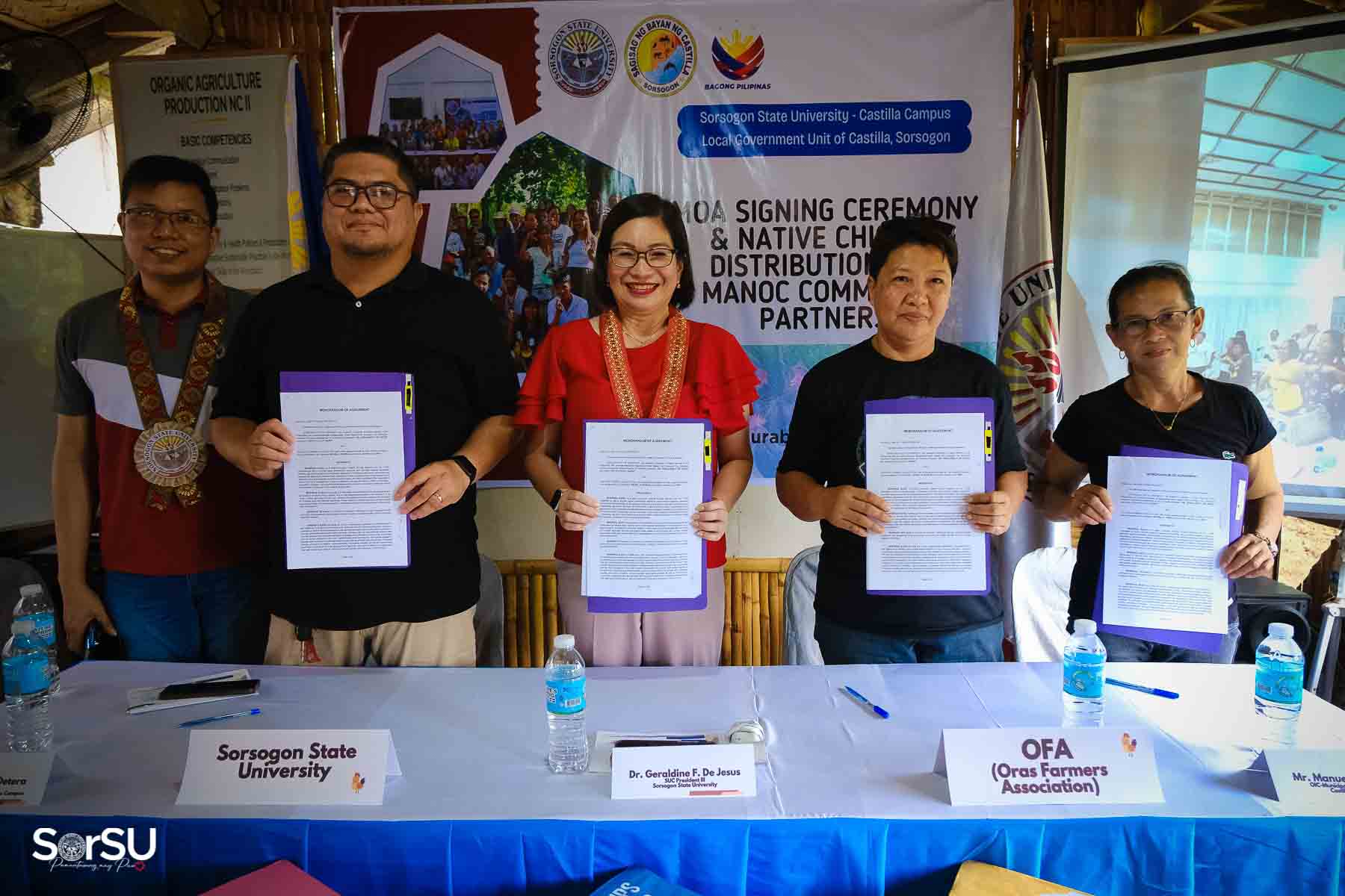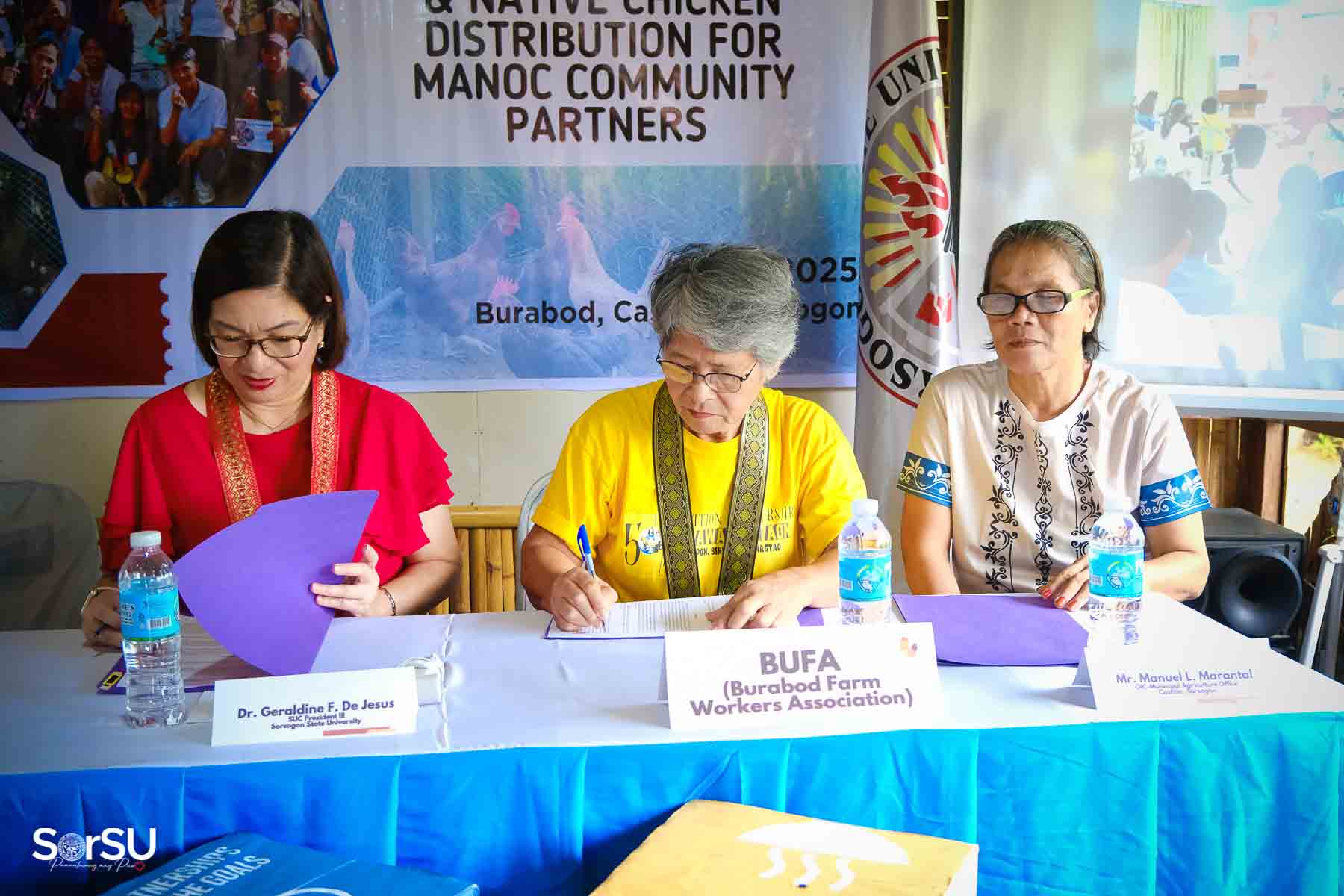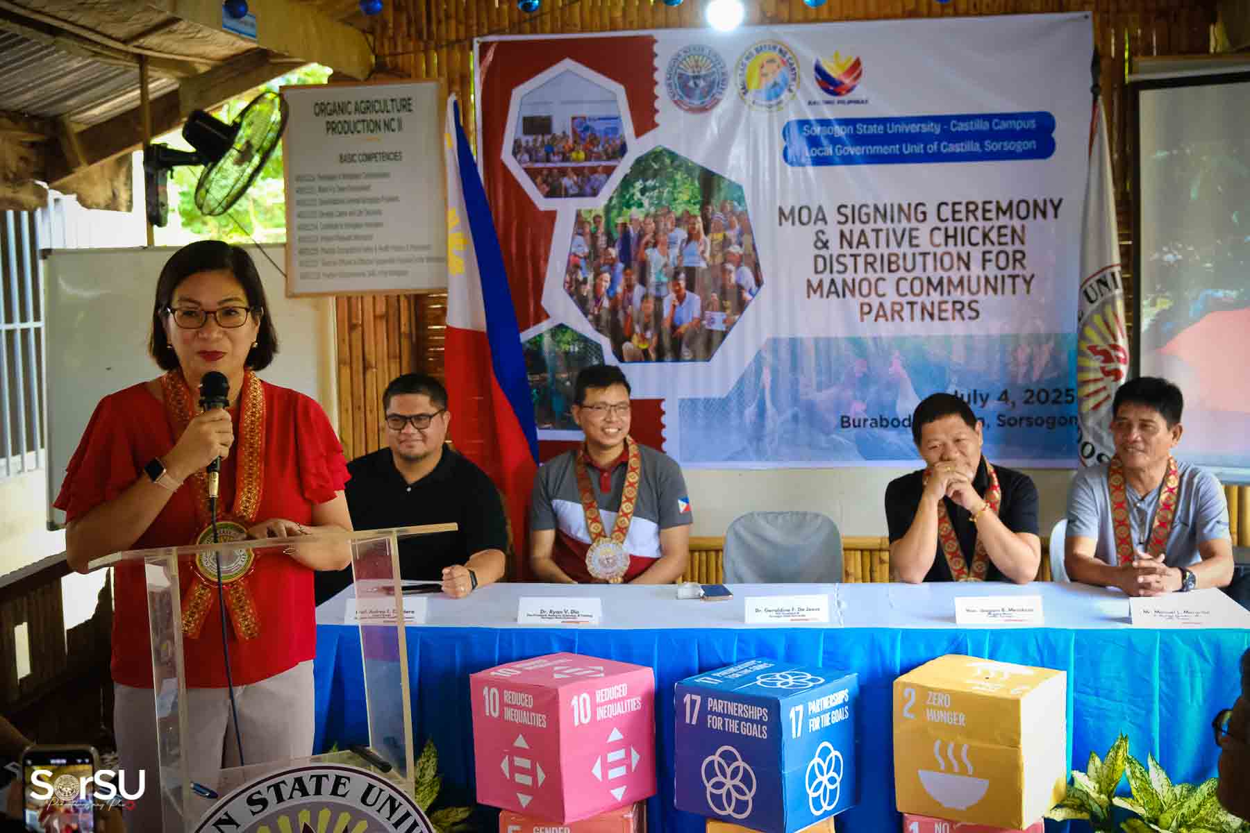 On July 4, 2025, Sorsogon State University (SorSU) reaffirmed its commitment to sustainable development through the ceremonial signing of a Memorandum of Agreement (MOA) with the Local Government Unit (LGU) of Castilla and MANoC Community Partners. The event, held at Burabod, Castilla, Sorsogon, also included the distribution of native chickens to MANoC Community Partners to help create new livelihood opportunities.