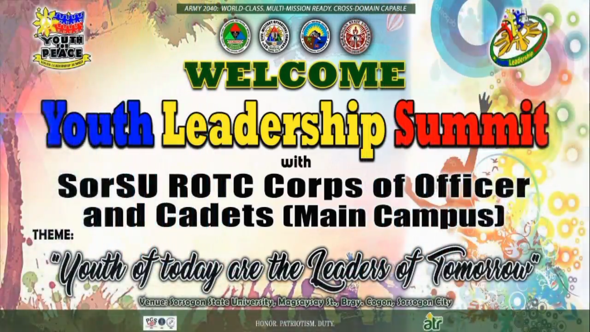 The SorSU NSTP-ROTC Unit of the Sorsogon City Campus held its first Youth Leadership Summit (YLS) last April 30, 2023. The said activity was made possible through the initiative of the ROTC Commandant, Maj Annamy N Nero (OS) PA in cooperation with CPT Michelle F Estares (MI) PA, CO, 93CMOC and LTC Genevee E. Dañas (ARM (GSC) PA, CO 9CMOBn, 9ID PA.