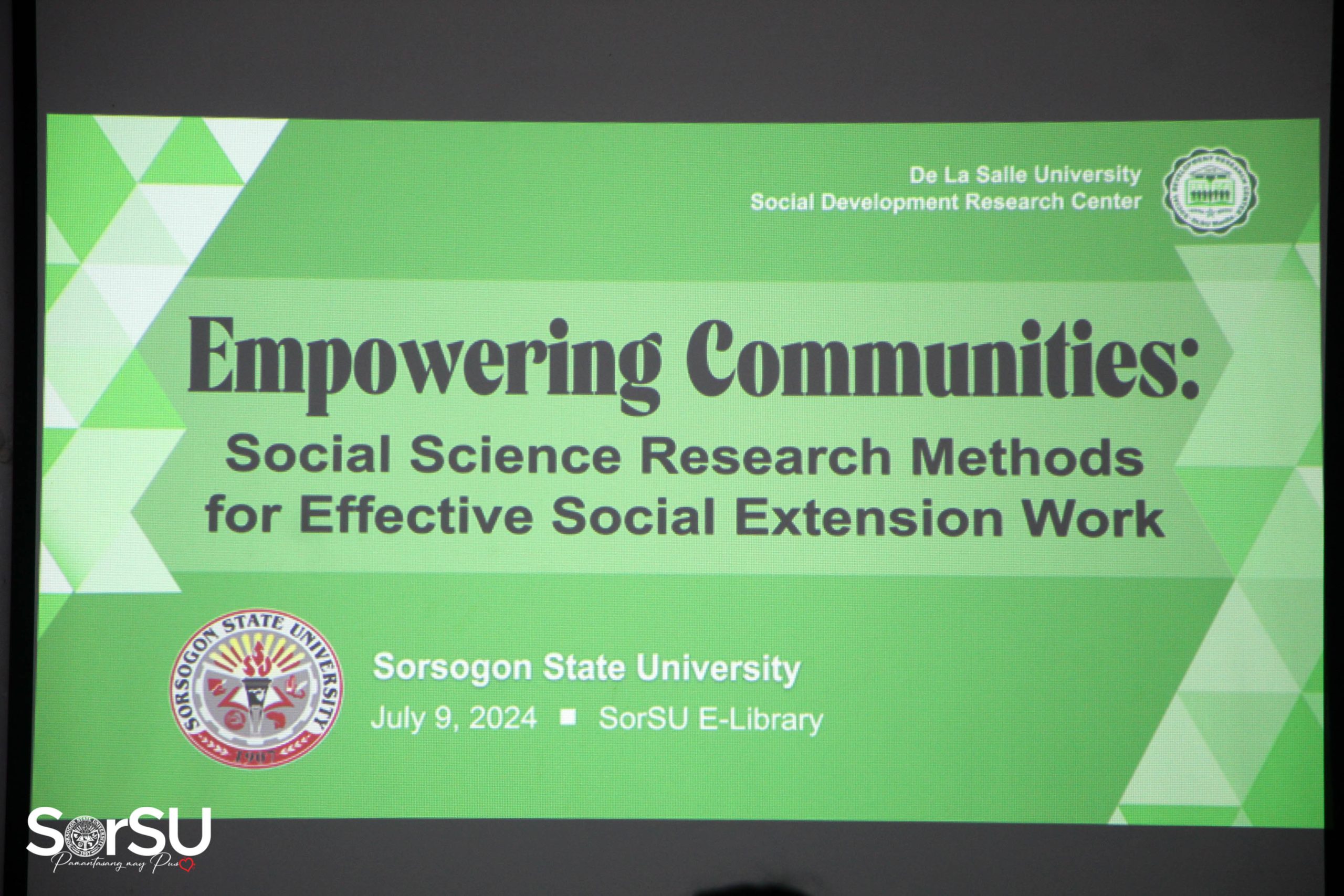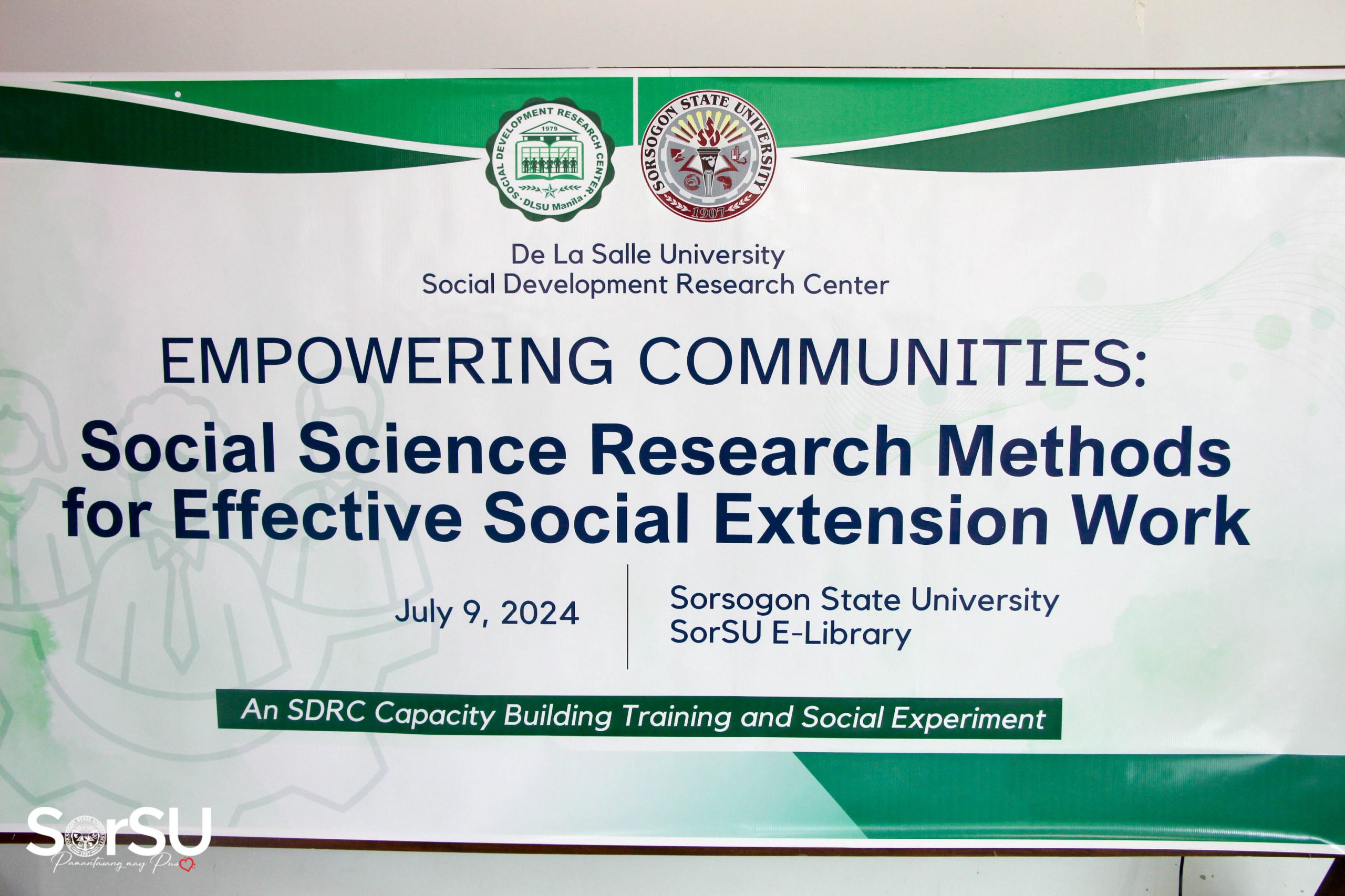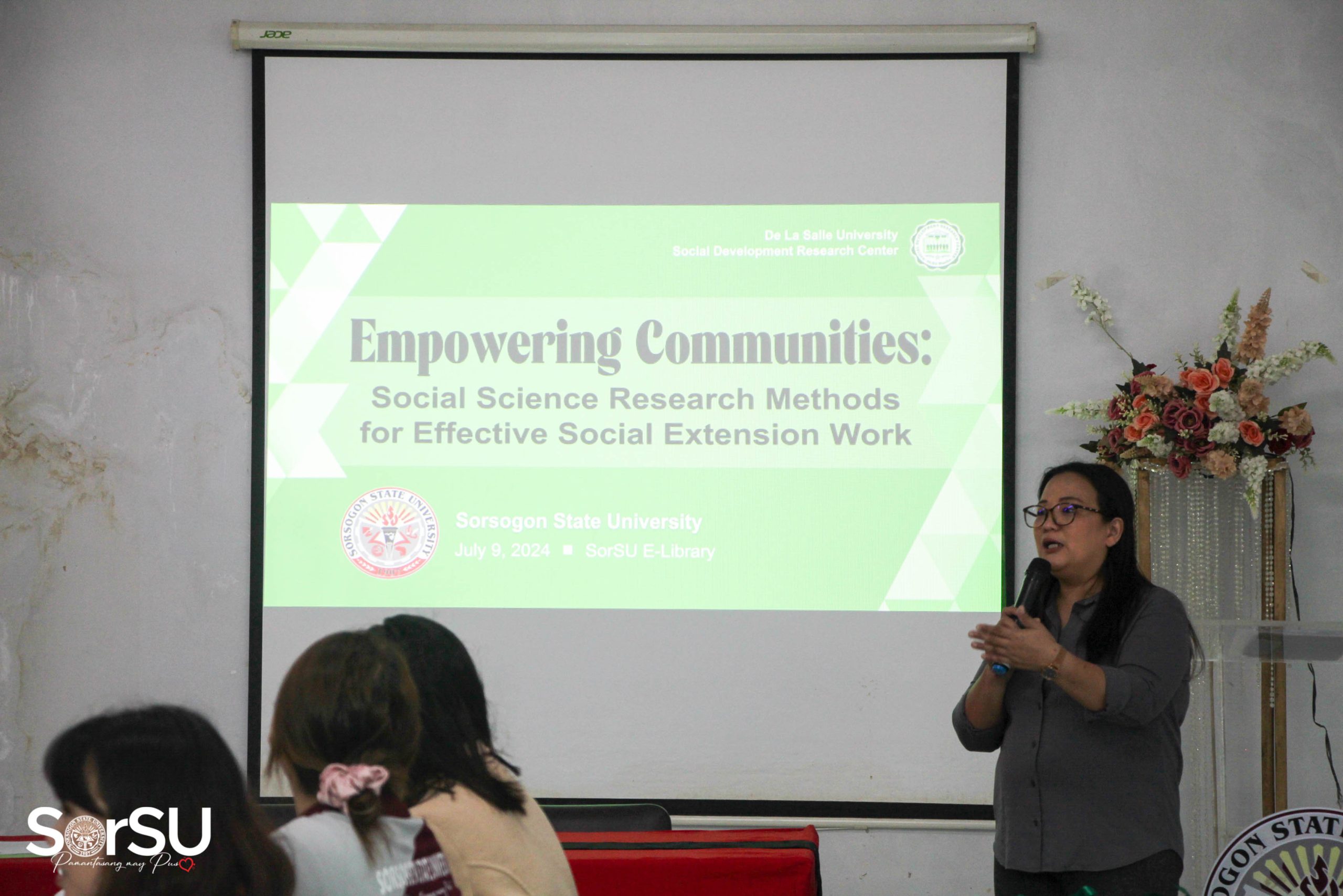 With the aim to integrate the strengths of both institutions to achieve high academic standards and foster practical applications through extension work, Sorsogon State University (SorSU), through the Office of Research and Development (ORD) and Office of Extension and Training (OET) Services, in partnership with De La Salle University – Social Development Research Center (DLSU-SDRC), successfully capacitated selected SorSU faculty researchers and extensionists on a lecture-workshop called “Empowering Communities: Social Science Research Methods for Effective Social Extension Work” on July 9, 2024, at the SorSU E-Library, Sorsogon City Campus.