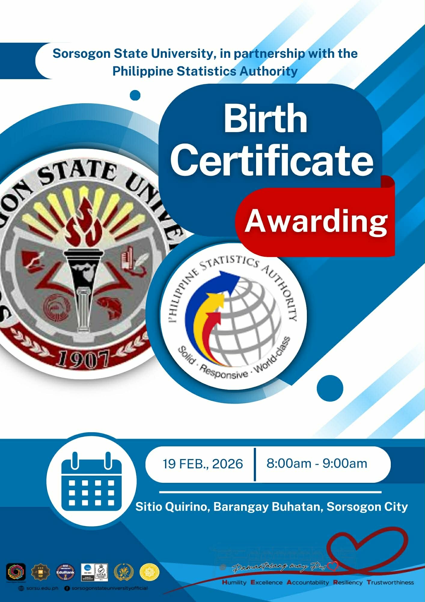 On February 19, 2026, Sorsogon State University (SorSU), through the Office of Extension & Training Services (OET), headed by Dr. Ana Cristina G. Fortes (Director, OET), in partnership with the Philippine Statistics Authority (PSA), successfully conducted a Birth Certificate Awarding activity for residents in Sitio Quirino, Barangay Buhatan, Sorsogon City.
