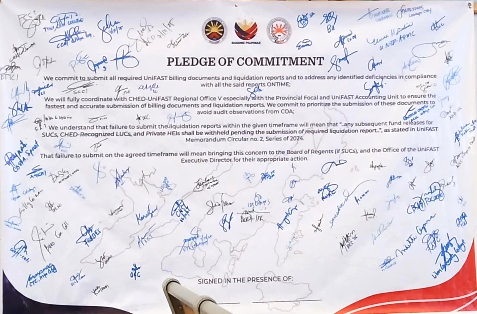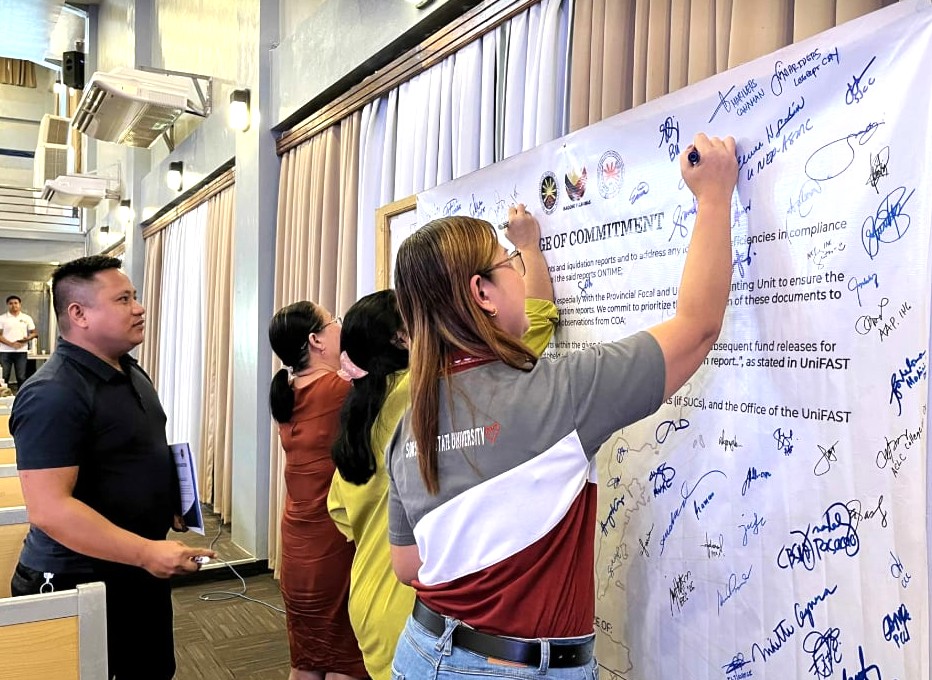 The program featured welcome remarks from Dr. Alfonso Garcia, Dean of SorSU-COTED, and a keynote message from Dr. Demetrio P. Anduyan, Jr., CESO III, Regional Director of CHEDRO V. Discussions on UniFAST validation, billing, liquidation, and special programs were led by Mr. Emmanuel R. Villamor, Ms. Via M. Dometita, and Mr. Vince Joseph L. Vibar. Highlights of the event included the Awarding of Certificates of Commendation and the Ceremonial Signing of the Pledge of Commitment, followed by the closing remarks of Dr. Ma. Pamela Sorra-Vinas, Oversight Supervisor for UniFAST.