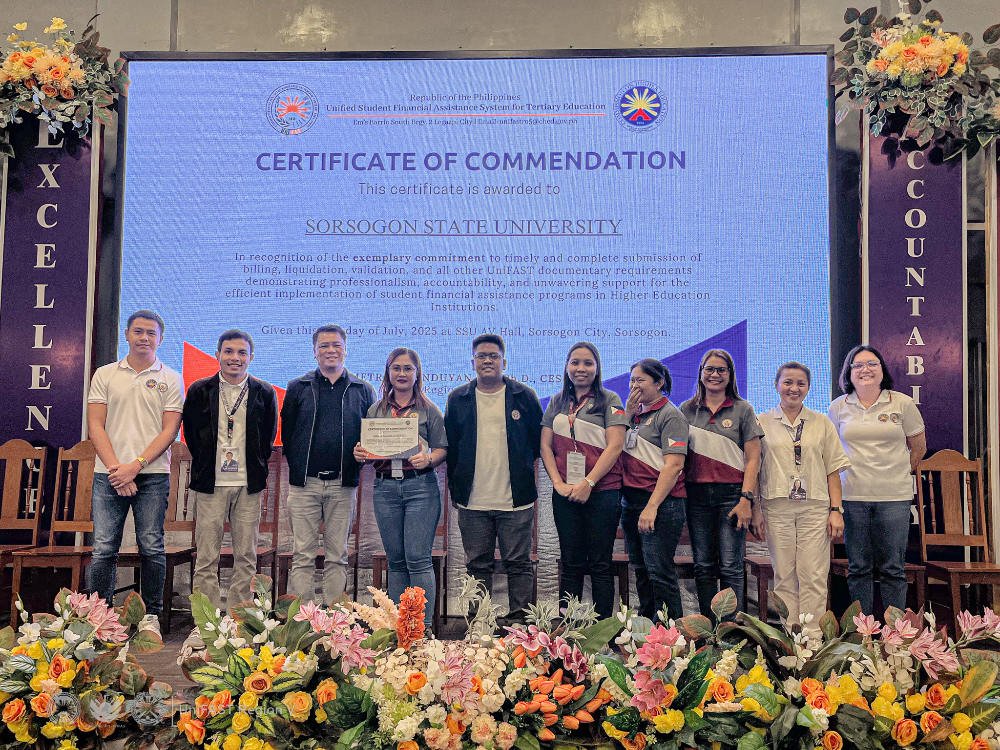 Sorsogon State University (SorSU) proudly receives the Bicol Compliance Excellence Award from CHED-UniFAST Region V, recognizing the university’s outstanding commitment to the timely and complete submission of UniFAST billing, liquidation, validation, and other documentary requirements. This honor reflects SorSU’s continued pursuit of good governance, professionalism, accountability, and dedicated service to its student stakeholders.