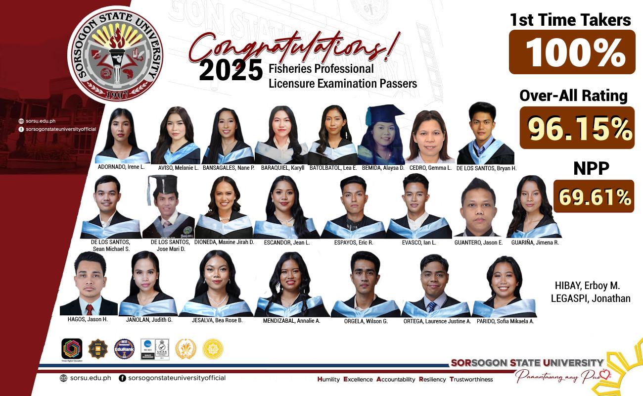 The Sorsogon State University (SorSU) proudly congratulates the twenty-five (25) newly-licensed Fisheries Professionals for successfully passing the Fisheries Professional Licensure Examination (FPLE) conducted on October 9-10, 2025.