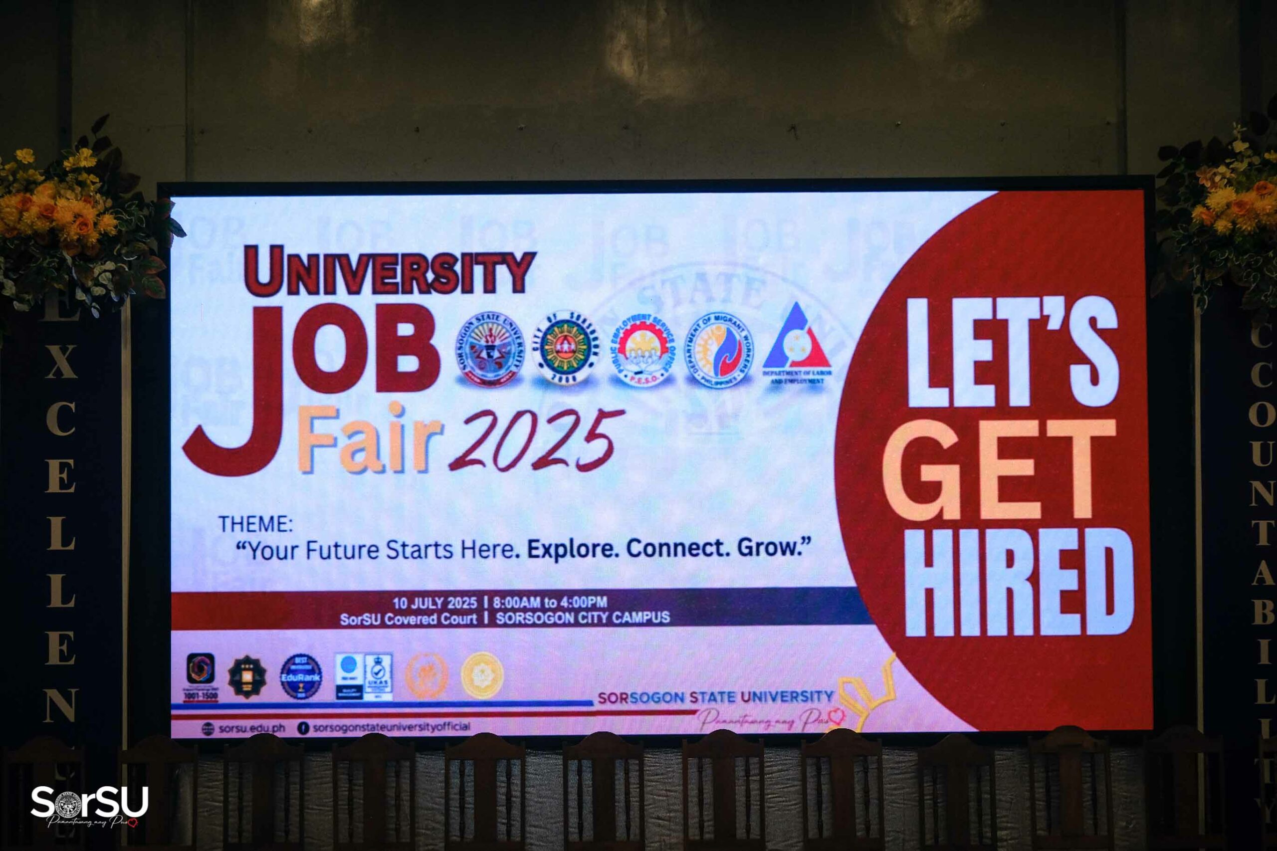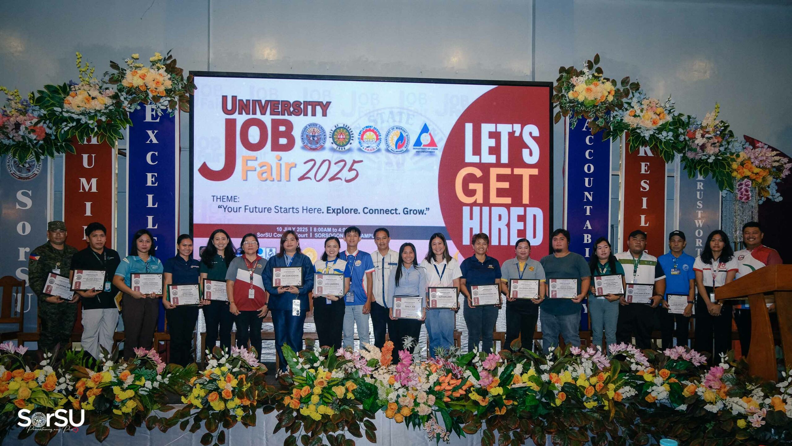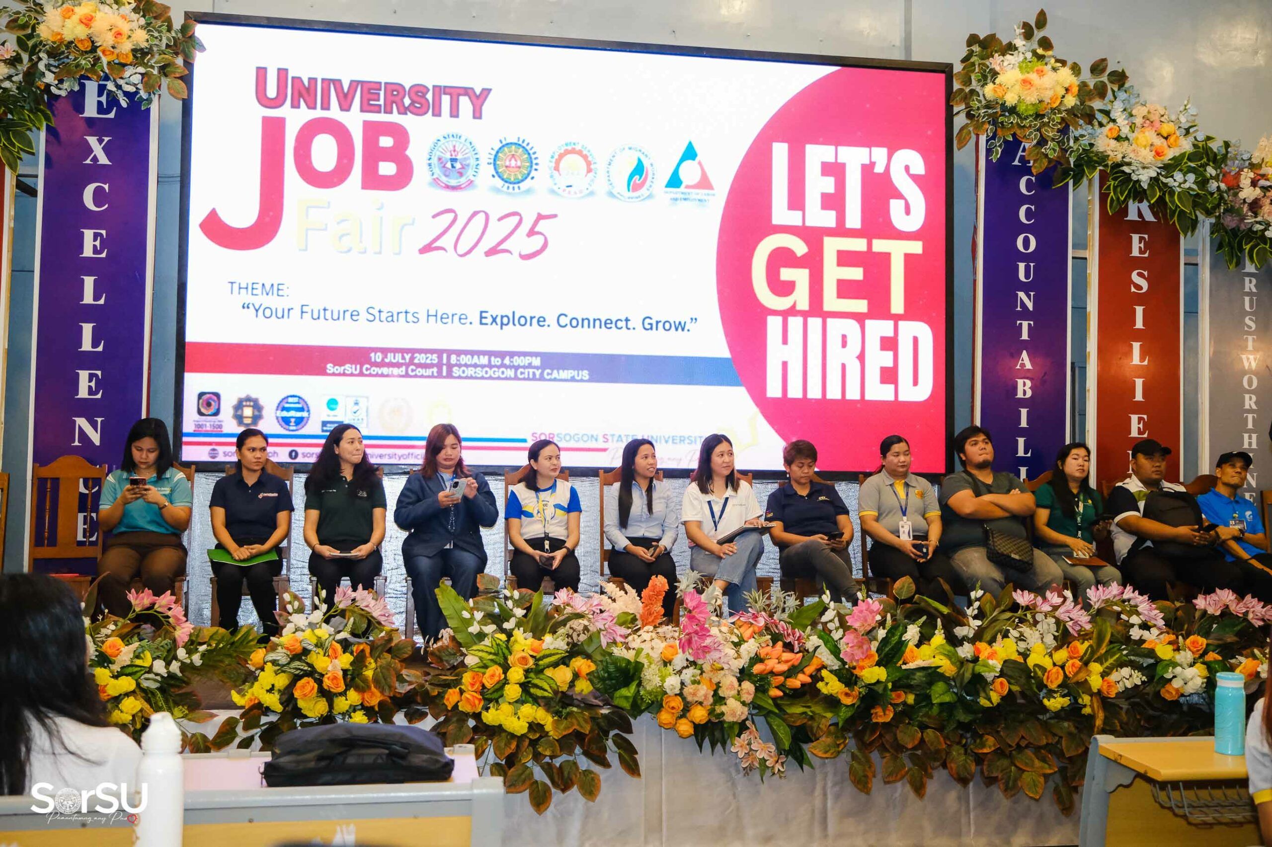 To create meaningful employment opportunities and connect aspiring professionals with reputable employers, Sorsogon State University (SorSU), through its Career and Job Placement/ILDO Services Unit in partnership with the Public Employment Service Office (PESO) Sorsogon, successfully held the UNIVERSITY JOB FAIR 2025 today, July 10, 2025, at the SorSU Audio-Visual Hall/Covered Court, Sorsogon City Campus, carrying the theme āYour Future Starts Here. Explore. Connect. Grow.ā
