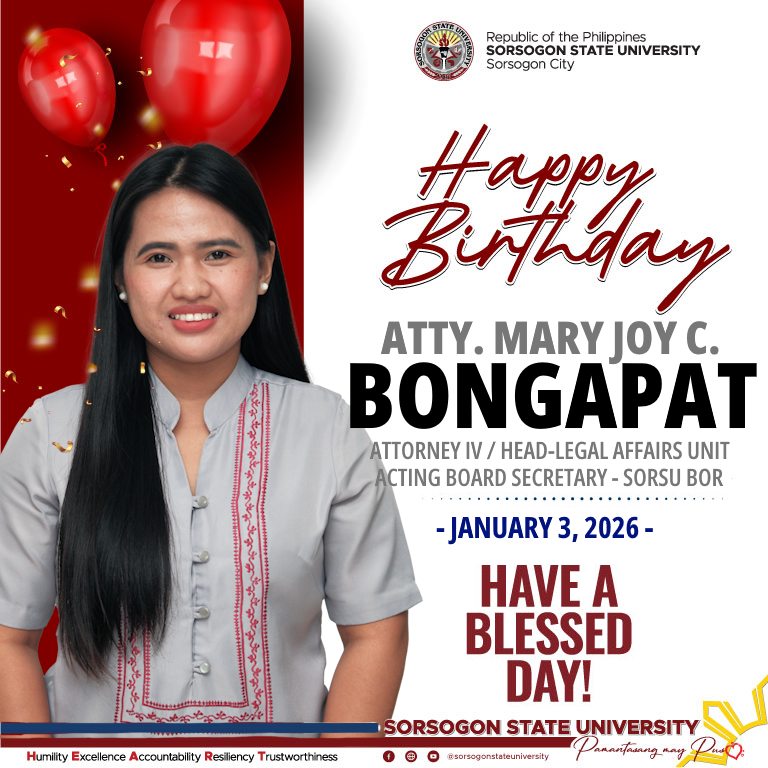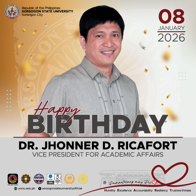 Warmest birthday greetings to our dear VP for Academic Affairs, Dr. Jhonner D. Ricafort!Sorsogon Campus Public InformationJanuary 8, 2026News, Sorsogon City Campus Your SorSU family thank you for your unwavering support and dedication to SorSUβs mission of transforming lives. May this year and the years ahead be filled with joy, good health, and abundant blessings.ππ Latest Celebrants: